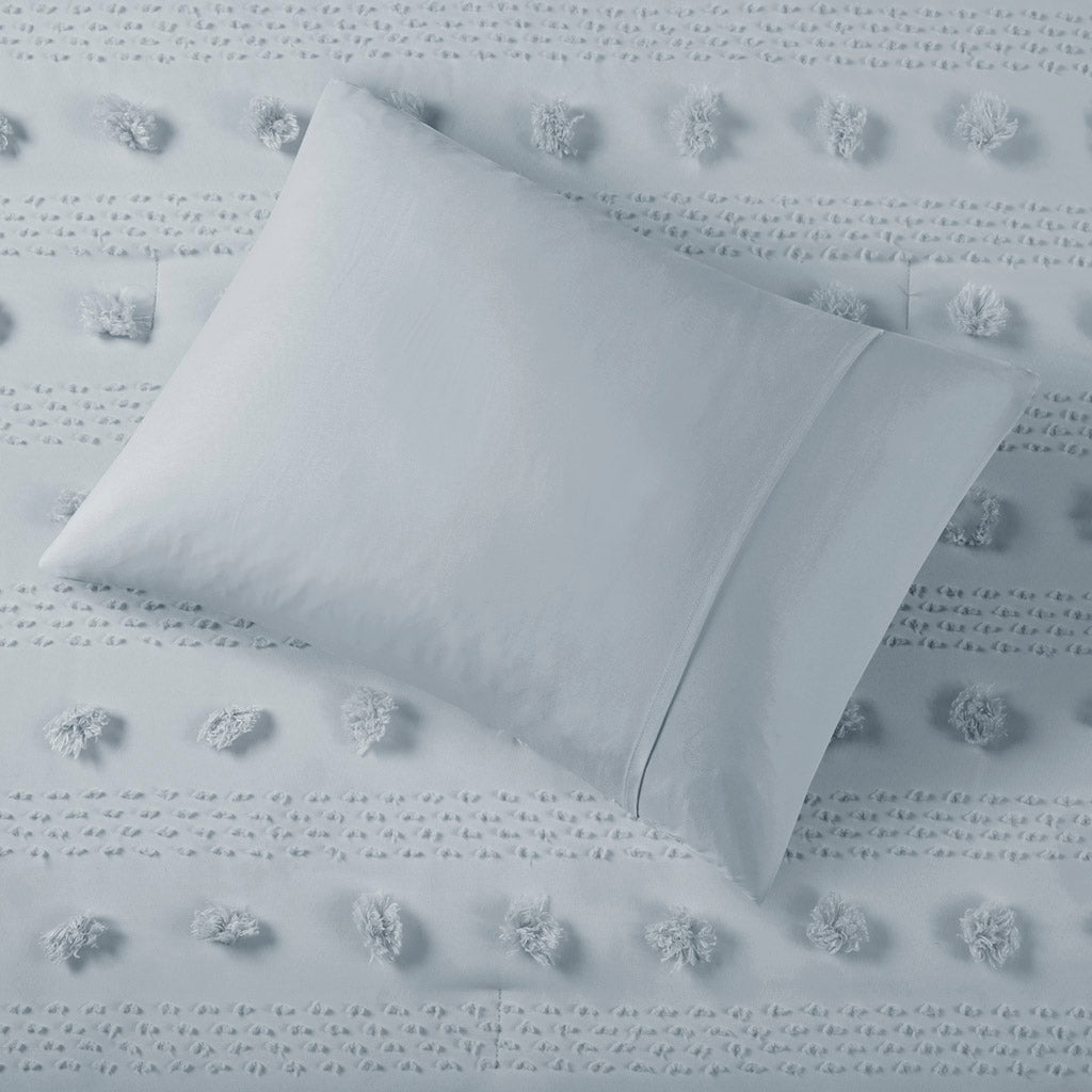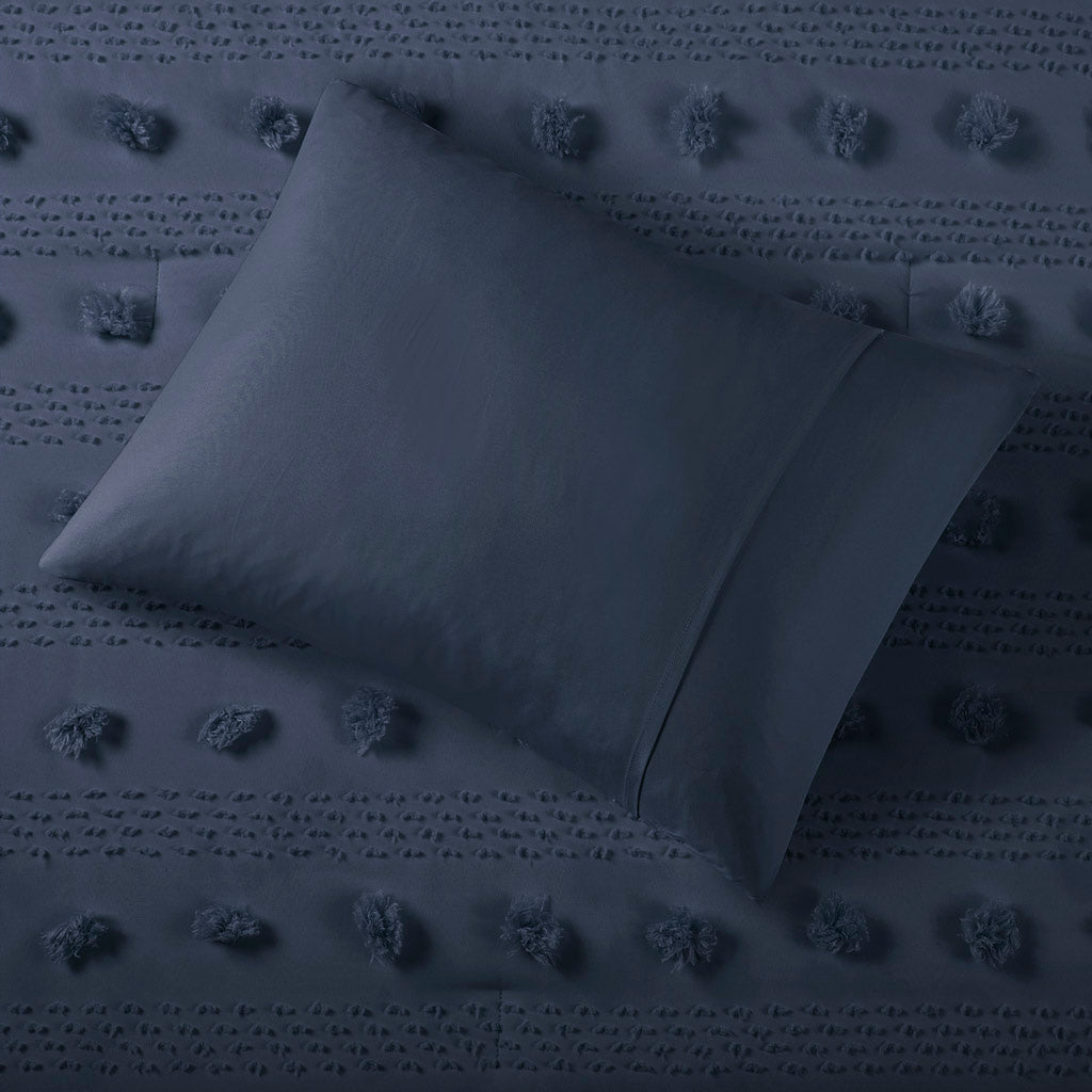 Elevate your bedroom with a playful yet refined jacquard comforter set that combines texture, comfort, and easy-care performance. The tufted clip jacquard pompoms create subtle dimension across the face of the comforter while coordinating shams complete the cohesive look. Thoughtful finishes — including hypoallergenic, dustproof filling and antimicrobial treatment — make this set a practical choice for everyday living.