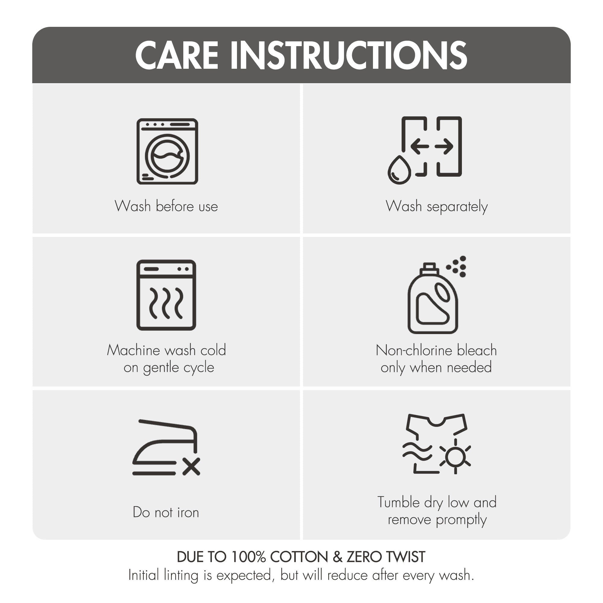 - Wash before first use. Machine wash warm, gentle cycle with like colors. Only non-chlorine bleach when needed. Avoid fabric softeners, dryer sheets, and contact with benzoyl peroxide. Do not wash with sharp items. Tumble dry low and remove promptly. Do not iron. Shake before use to restore fluff. Some initial linting is normal with zero-twist yarn and will lessen after washes.