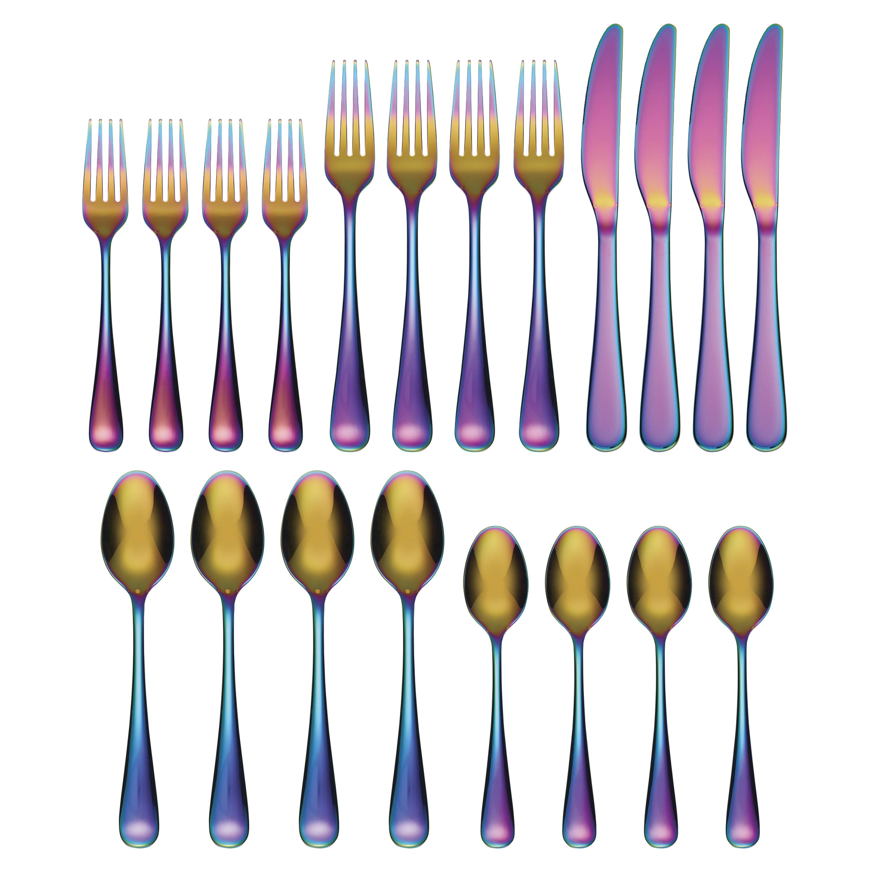 - WhatIsIncluded 1: Includes 4 each: salad/dessert forks, dinner forks, dinner knives, dinner/soup spoons, and teaspoons.