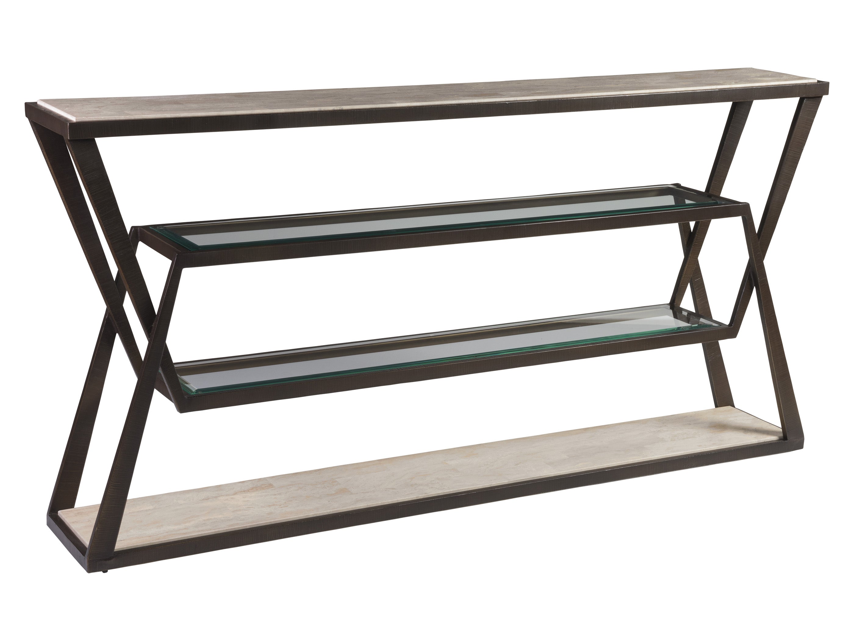 Discover the perfect blend of style and functionality with the Adamo Cafe Console Table. This exquisite piece from Artistica Home's Signature Designs collection is not just furniture; it's a statement of artistry that enhances any living space. Crafted with a unique desert travertine top and elegantly designed beveled glass shelves, this console table stands out as a centerpiece in your home. Each table is a work of art, featuring individual variations in appearance and coloration that add to its charm.
