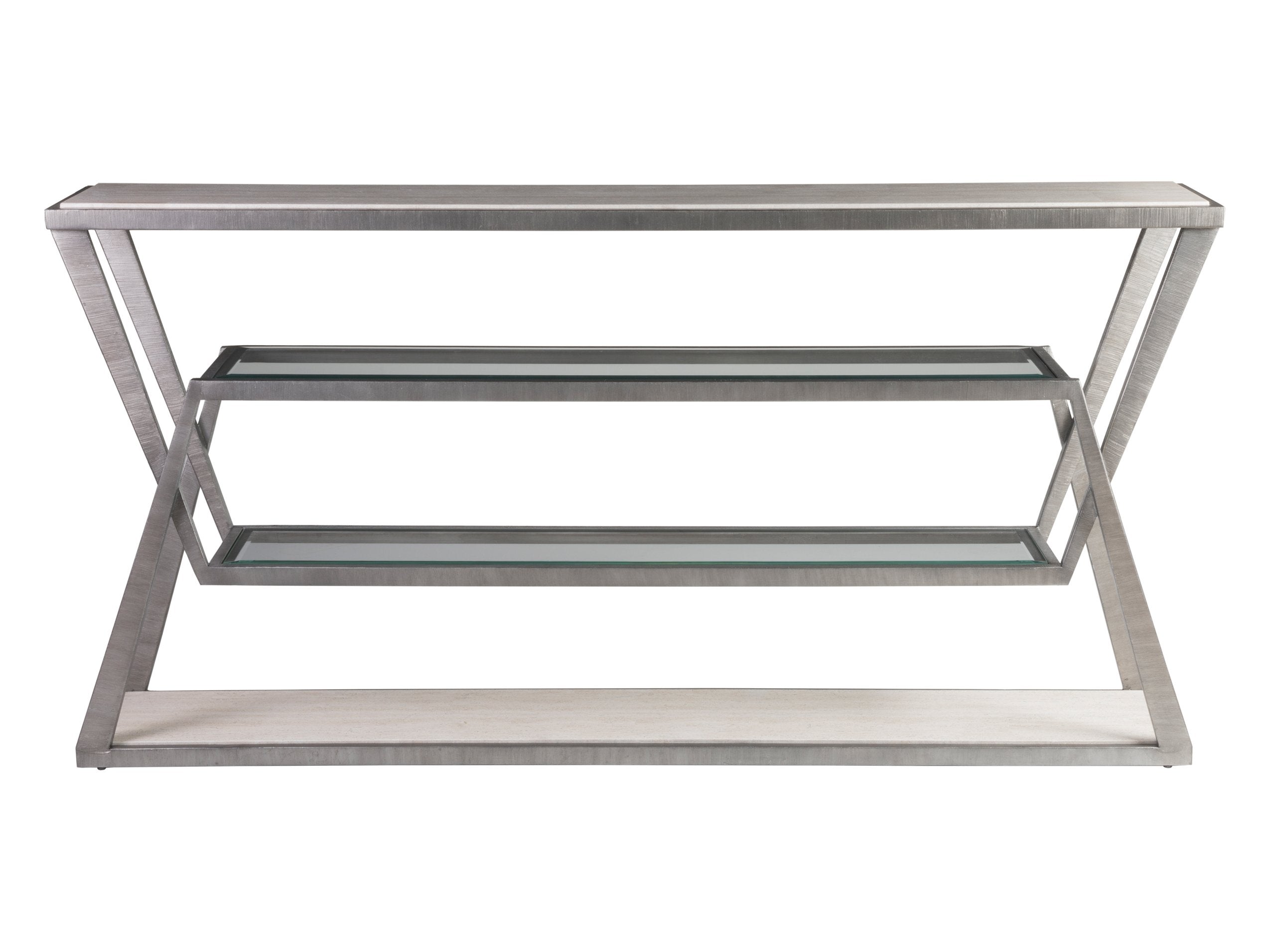 Elevate your living space with the Adamo Silver Gray Console Table, a stunning blend of modern design and timeless elegance. This exquisite piece from Artistica Home’s Signature Designs collection showcases a unique travertine top complemented by sleek beveled glass shelves, making it a perfect addition to any room. Crafted with meticulous attention to detail, this console table not only serves as a functional surface but also acts as a statement piece that draws the eye and enhances the overall aesthetic of your home.