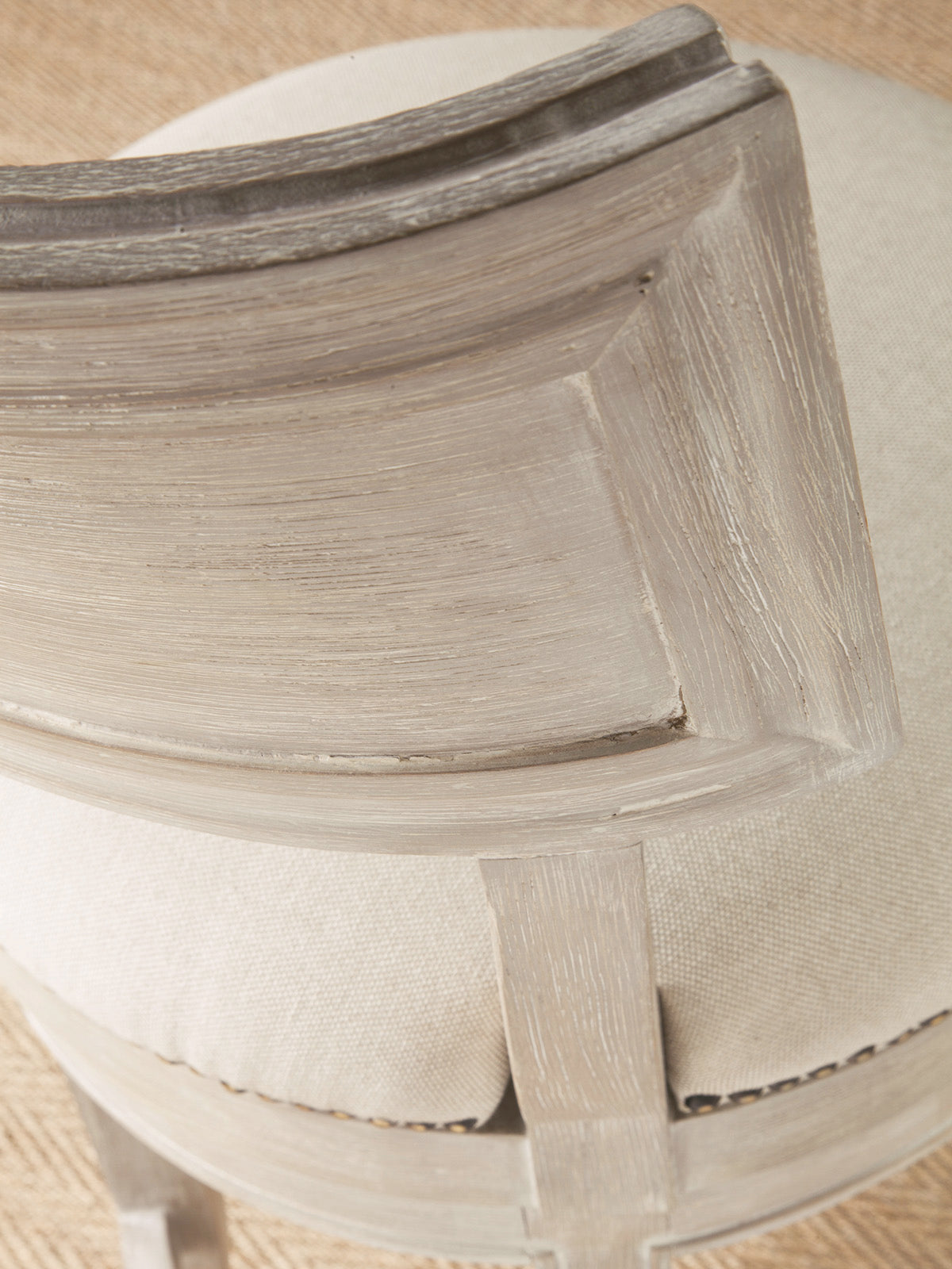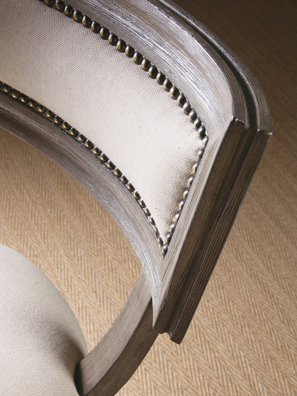 - Upholstered back splat and seat made from a luxurious linen-cotton blend for softness and comfort; standard fabric 153671 in a natural greige color.
