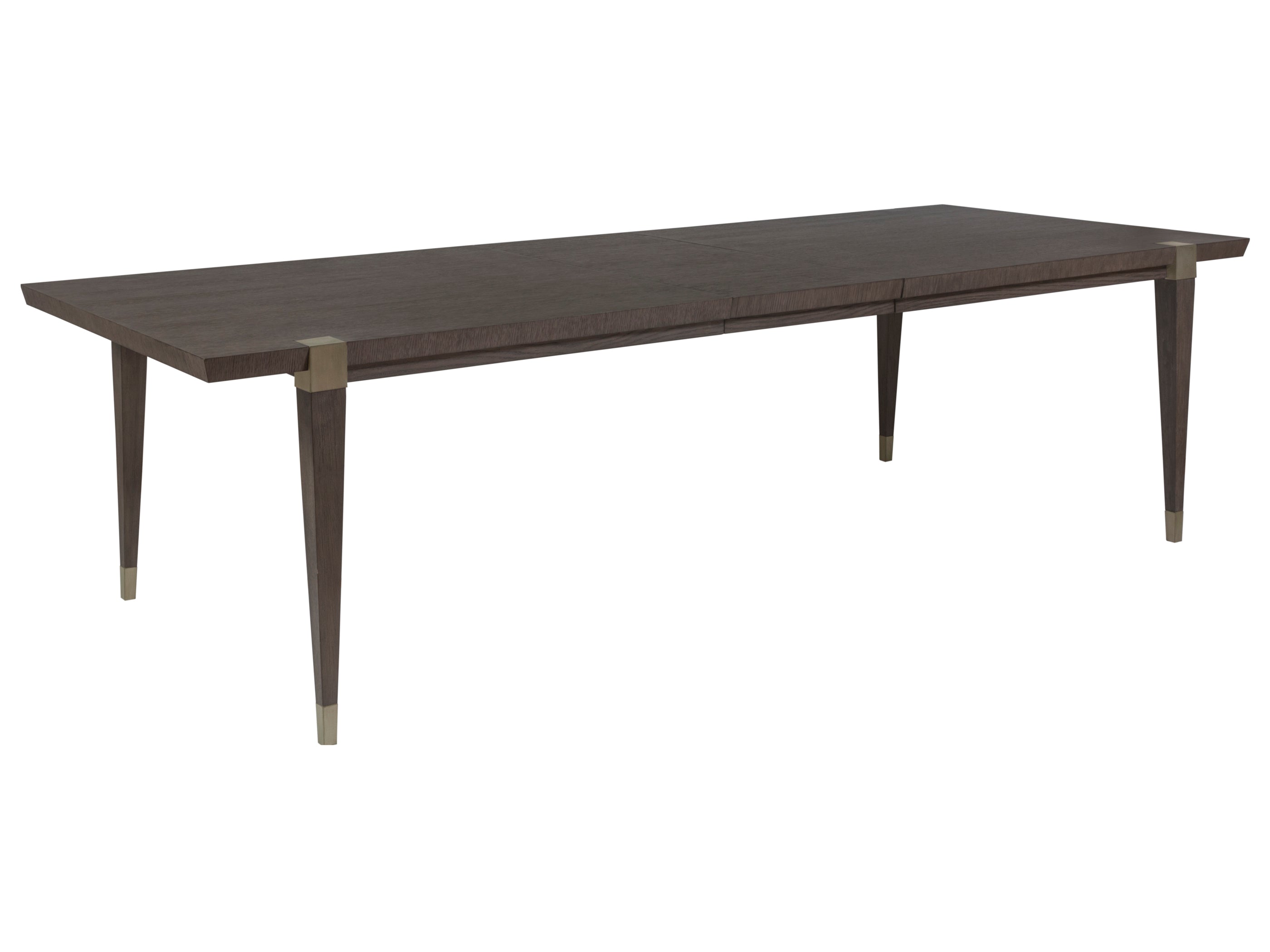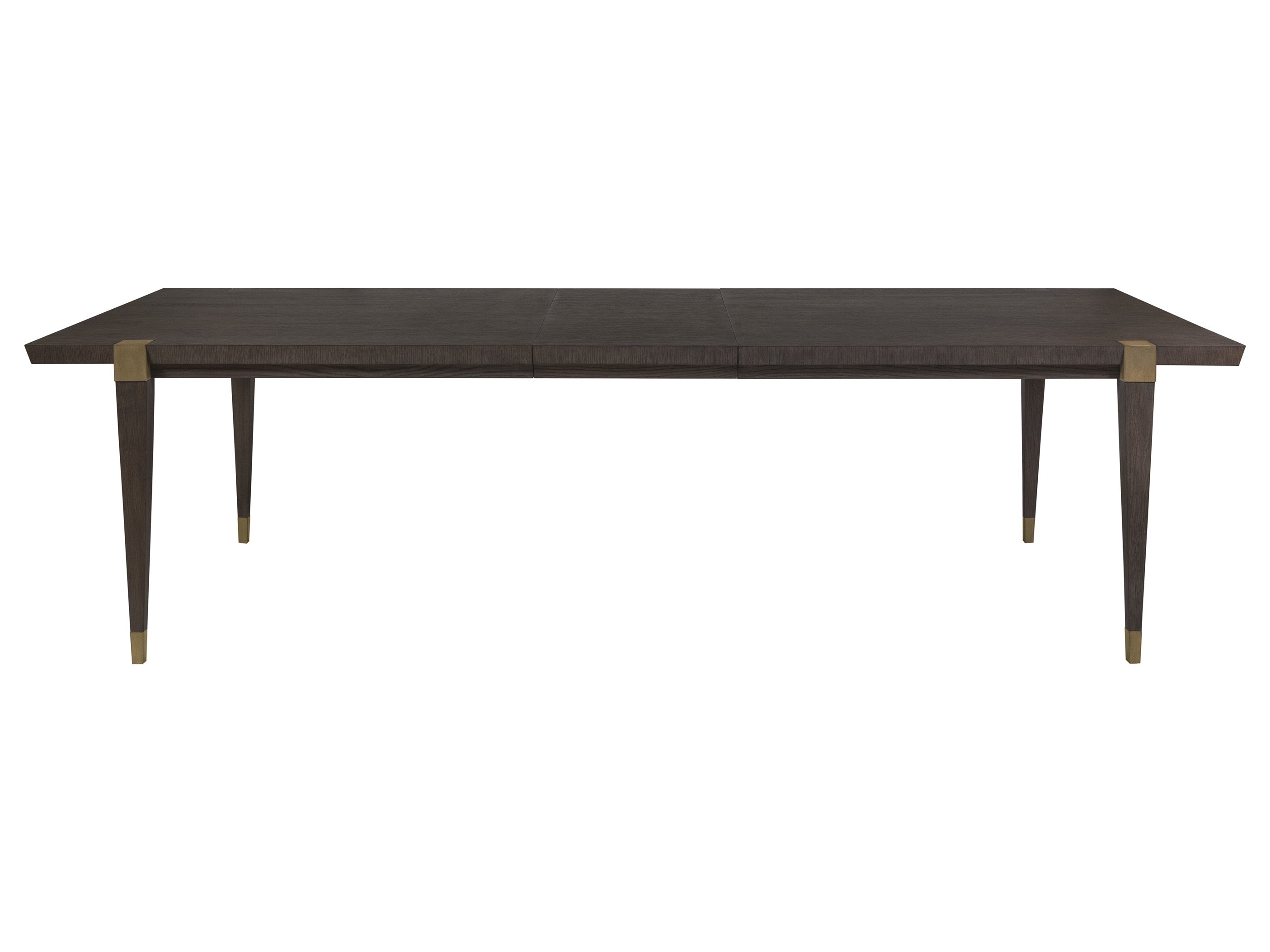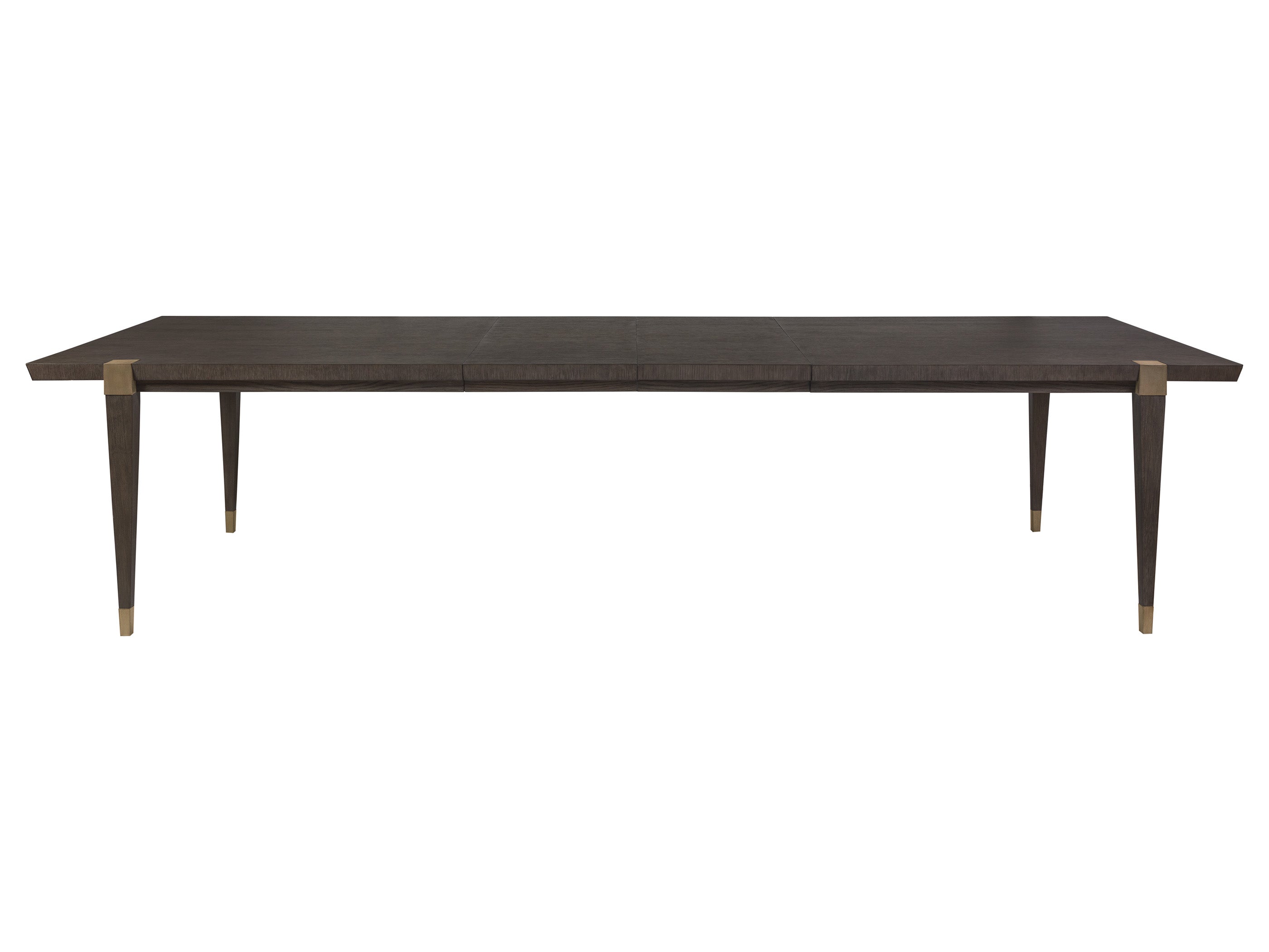 Elevate your dining experience with the Belvedere Extension Dining Table, a masterpiece that seamlessly combines contemporary style with timeless elegance. This stunning piece is crafted from high-quality, deeply sandblasted quartered oak veneers, finished in a classic Falcon brown with subtle gray undertones. The table features sophisticated brushed nickel accents that enhance its modern appeal, making it a perfect centerpiece for any dining room. With its ability to extend from 106 to 124 inches using two 18-inch leaves, this table is designed to accommodate gatherings of all sizes, ensuring that every meal is a memorable occasion.