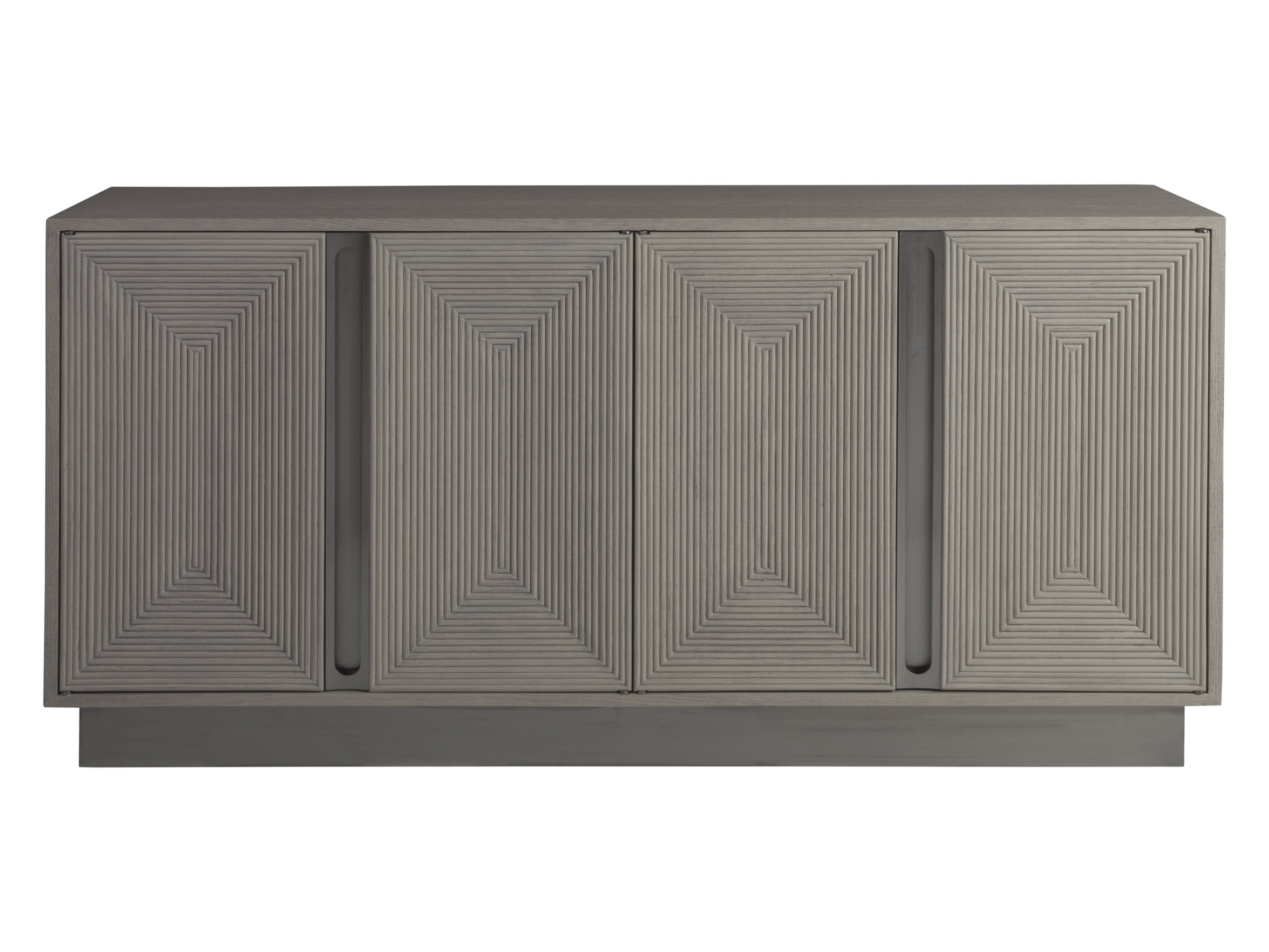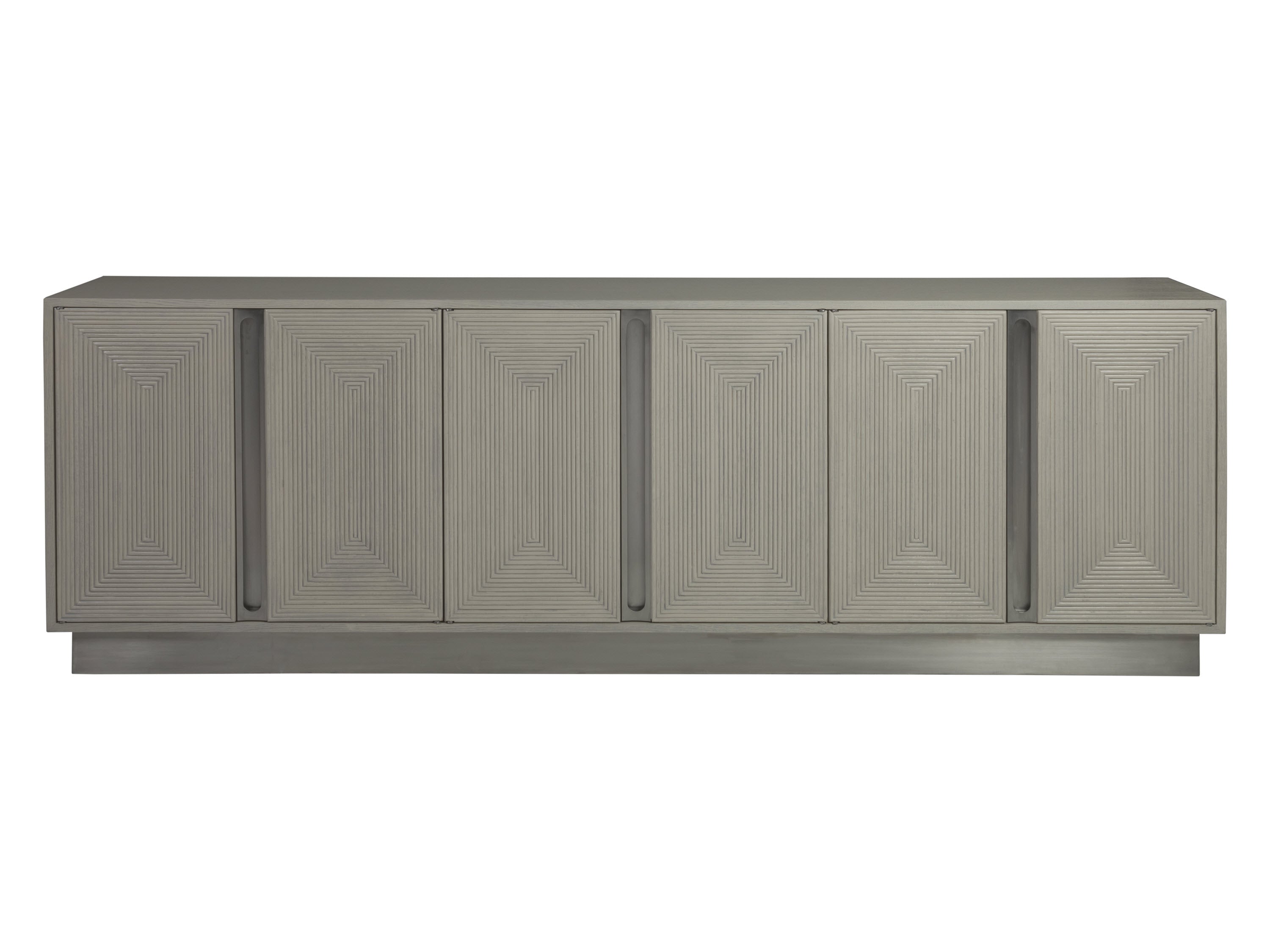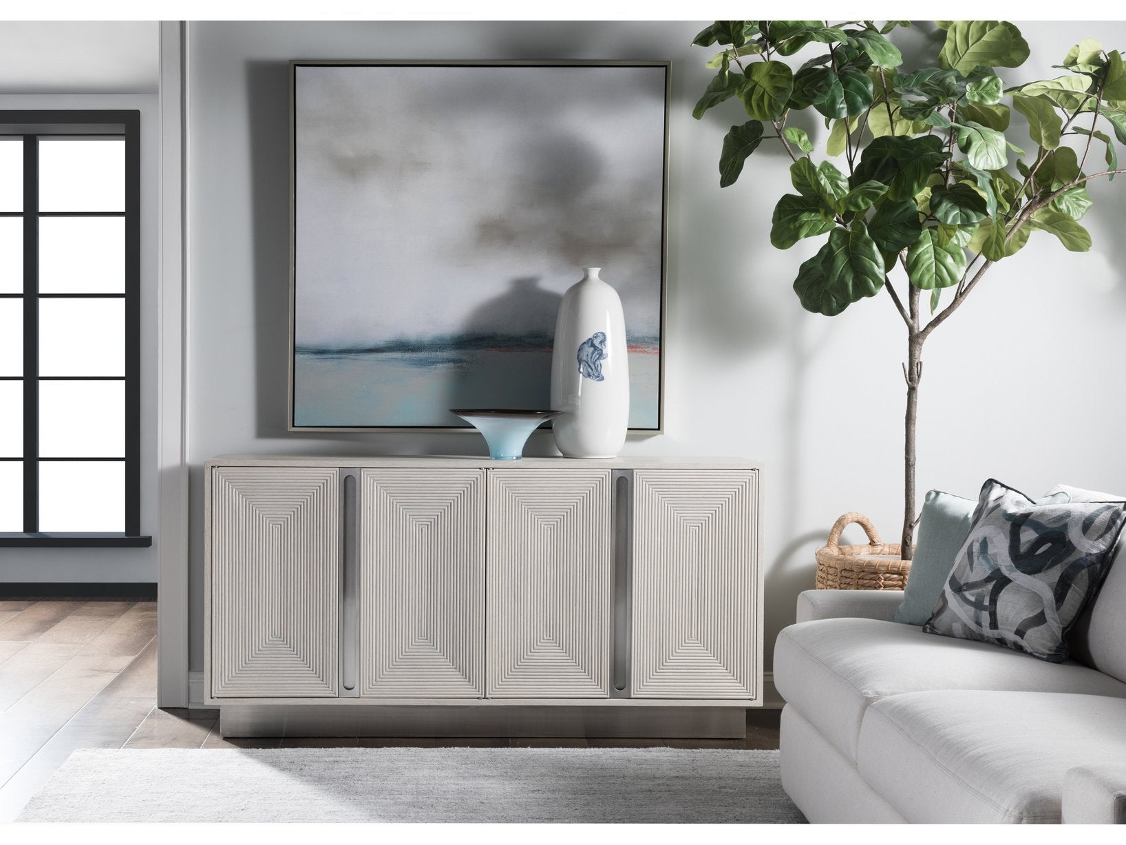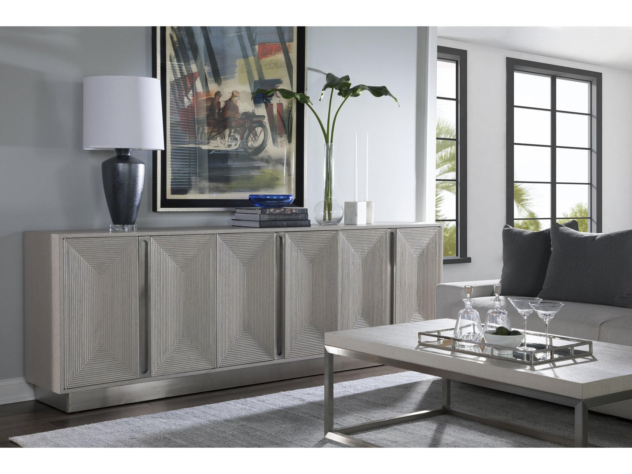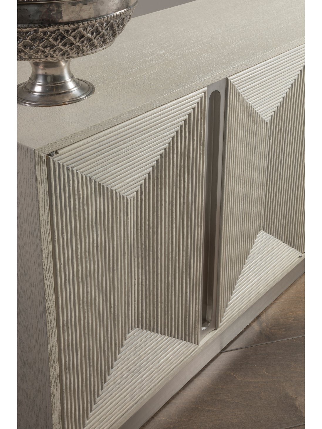 Transform your living space with the Gradient Media Console, a stunning blend of contemporary design and functional elegance. This grand credenza, designed to accommodate the largest flat panel screens, showcases the beauty of quartered white oak veneers finished in an exquisite Cerused White Grey. Its unique aesthetic is complemented by brushed stainless steel accents, making it not just a piece of furniture, but a striking centerpiece for any room. With ample storage and a sophisticated design, this console is perfect for organizing your media essentials while enhancing the overall style of your home.