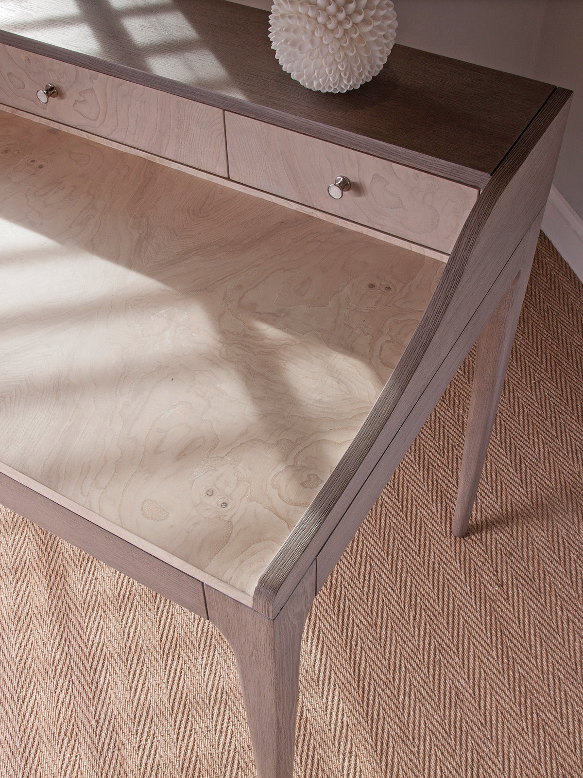 - Crafted from bleached olive ash burl veneer on the writing surface and three drawer fronts, complemented by white oak veneers and select hardwoods.
