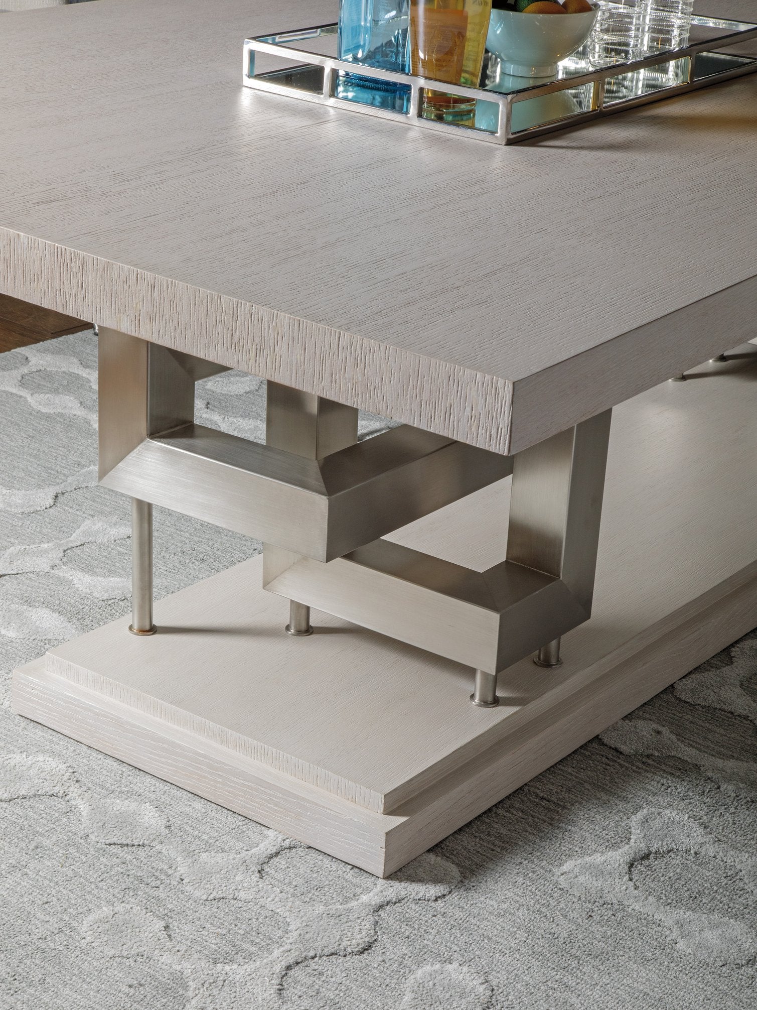 Elevate your dining experience with the Pazzo Rectangular Dining Table, a stunning fusion of modern aesthetics and exceptional craftsmanship. This table is designed to be the centerpiece of your dining space, where style meets functionality. It showcases a sophisticated blend of quartered oak veneers in a serene cerused misty white gray finish, complemented by sculptural brushed stainless steel pedestals. The unique stepped wooden base adds a touch of elegance, making it an ideal choice for contemporary interiors.