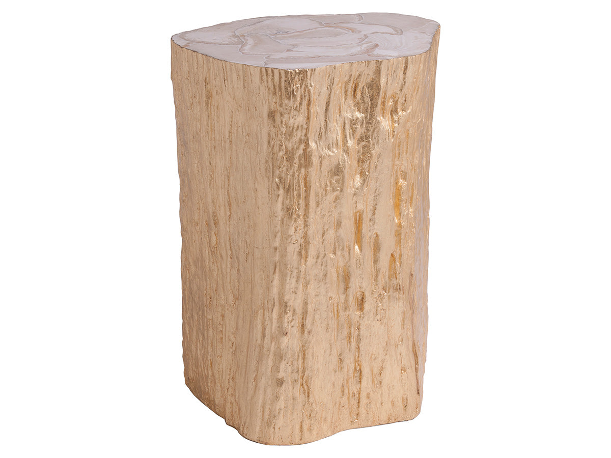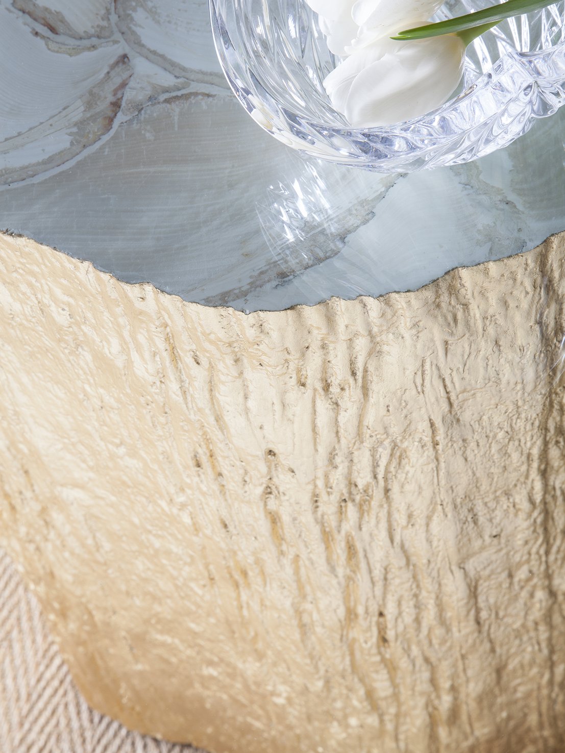 Elevate your living space with this exquisite trunk accent table, a striking fusion of artistry and nature. Featuring a unique Natureform design, this table is not just a functional piece of furniture but also a captivating work of art. Crafted with meticulous attention to detail, the inlaid fossilized clam shell top showcases the beauty of natural materials, ensuring that each piece is one-of-a-kind. The elegant silver leaf finish adds a touch of sophistication, making it a perfect addition to any decor style, from contemporary to eclectic.