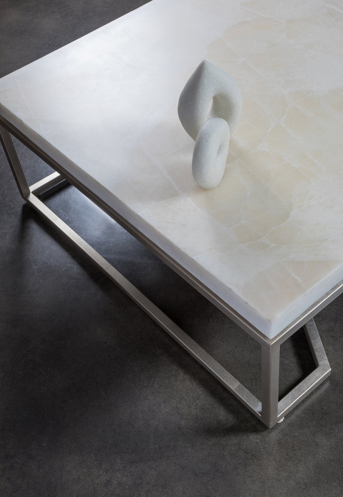 - Distinctive white onyx top featuring a light amber hue and translucent figuring, adding an elegant touch to your decor.