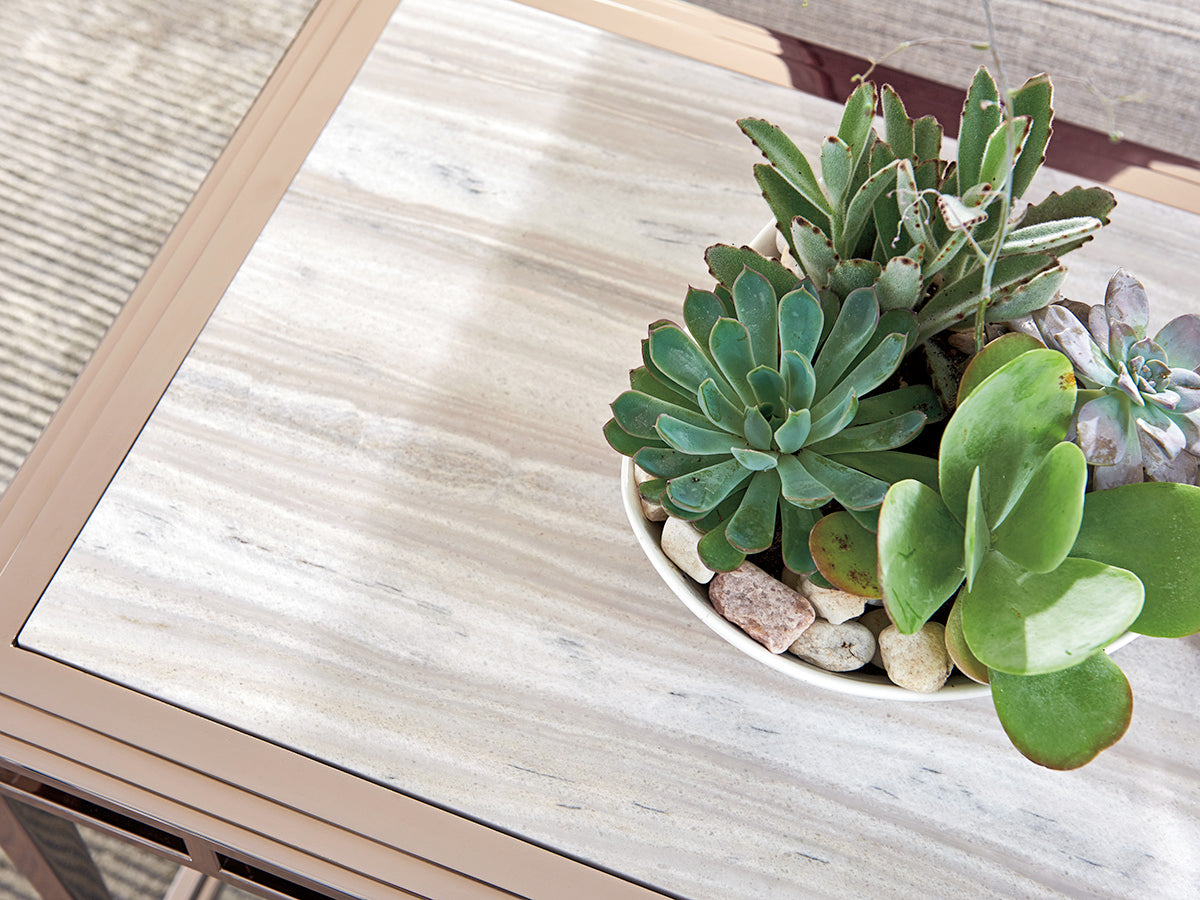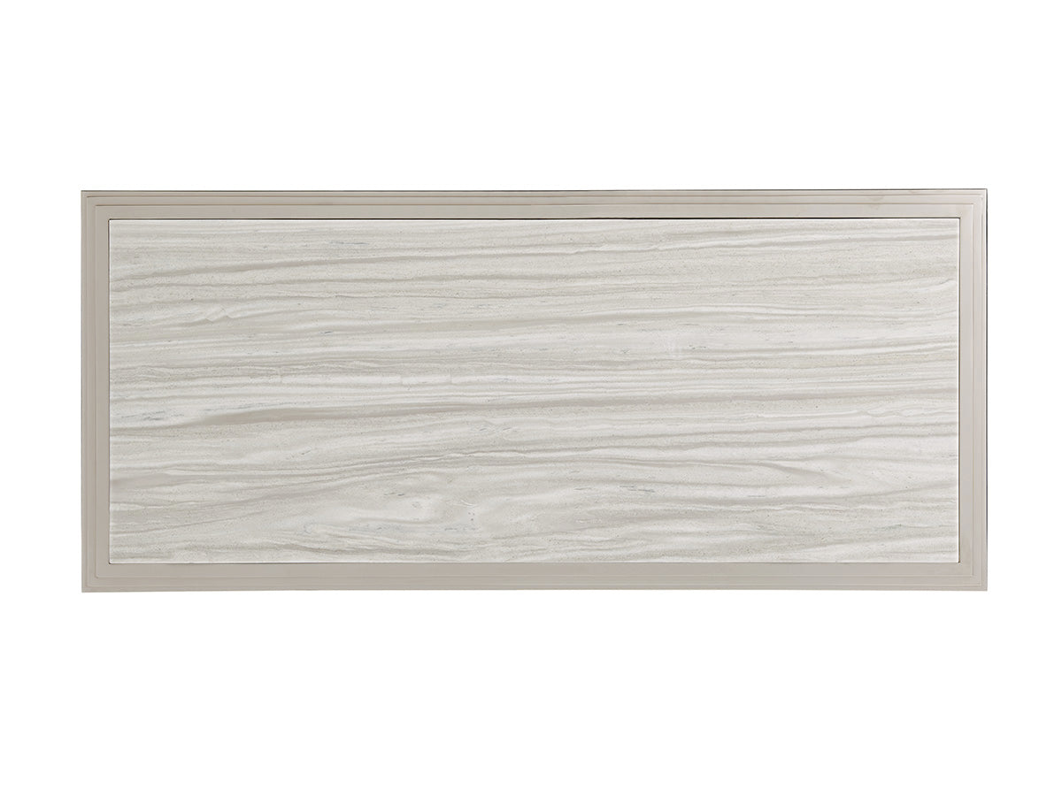- Polished silver marble top with unique veining in taupe and gray for a luxurious finish.