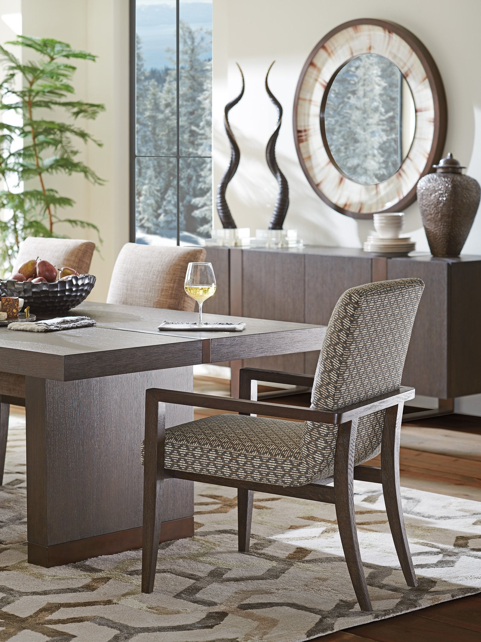 Experience the perfect blend of modern elegance and luxurious comfort with the Glenwild Upholstered Arm Chair. This exquisite piece is not just a chair; it is a statement of refined taste and sophisticated design. Crafted with meticulous attention to detail, the chair features stunning quartered white oak veneers that showcase their unique grain patterns, enhanced by a rich dark mocha finish. The thoughtful integration of custom hardware and burnished bronze metal accents adds a touch of glamour, making this armchair a beautiful focal point in any room. Upholstered in high-quality fabrics and supple leather, it offers an inviting and cozy feel, perfect for relaxing or entertaining.