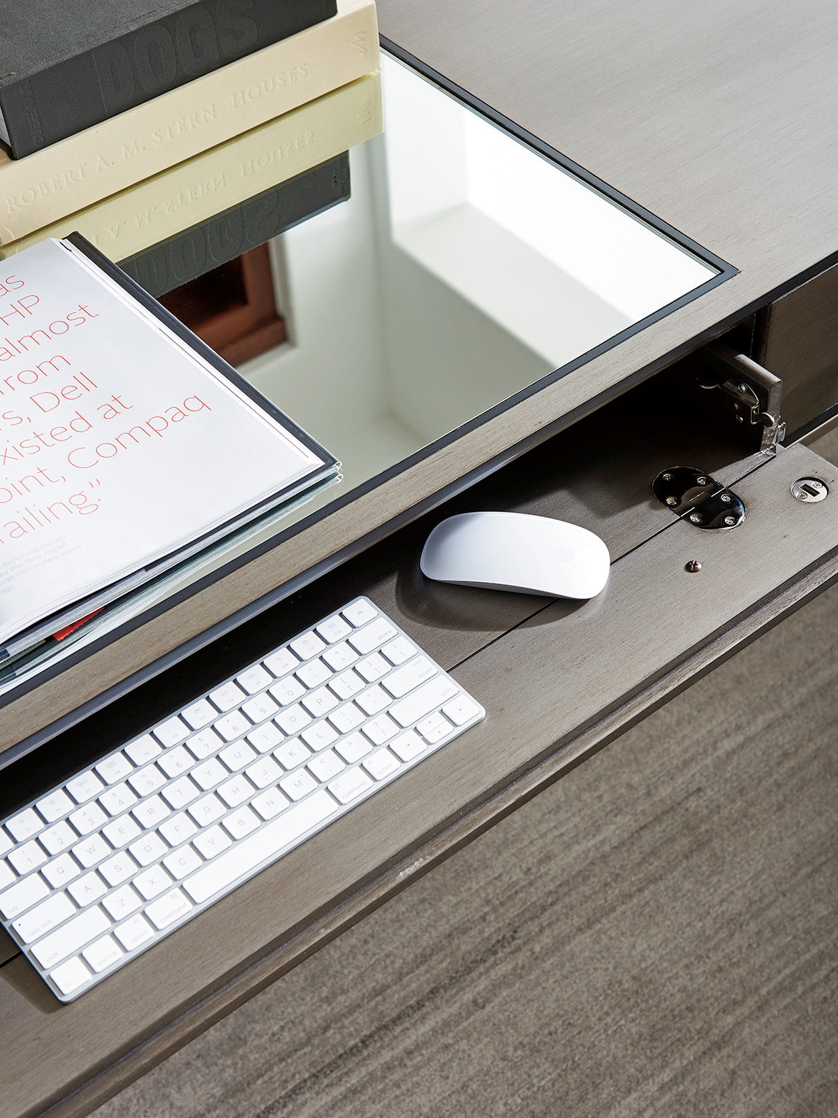 - Full-extension self-closing drop front keyboard drawer for easy access