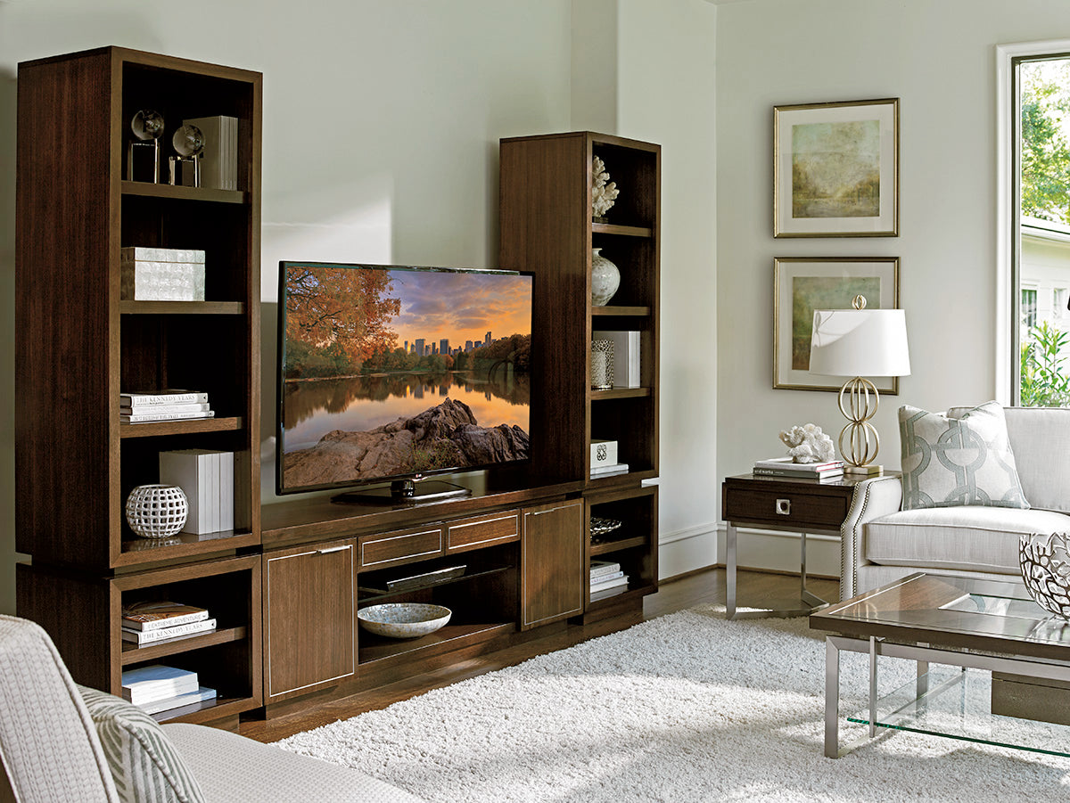 Elevate your living space with the Highview Media Console, a stunning fusion of classic design and contemporary elegance. This exquisite piece from the MacArthur Park collection is meticulously crafted to cater to the tastes of modern traditionalists. With its warm mocha brown Walnut veneers and sophisticated brushed stainless steel inlays, this console not only serves as a functional storage solution but also as a striking centerpiece that embodies luxury living. Its thoughtful design seamlessly blends timeless aesthetics with modern functionality, making it an ideal addition to any home.