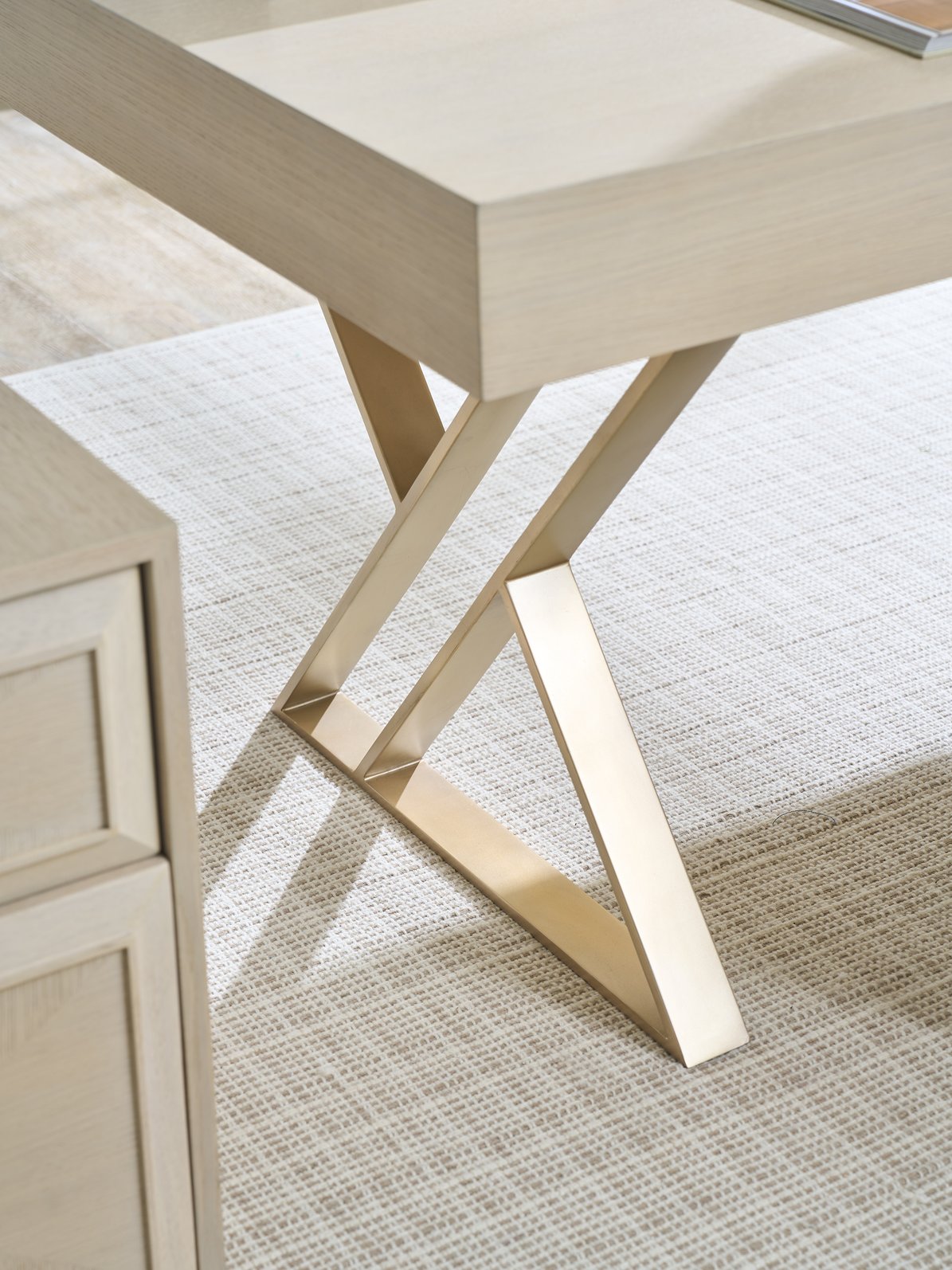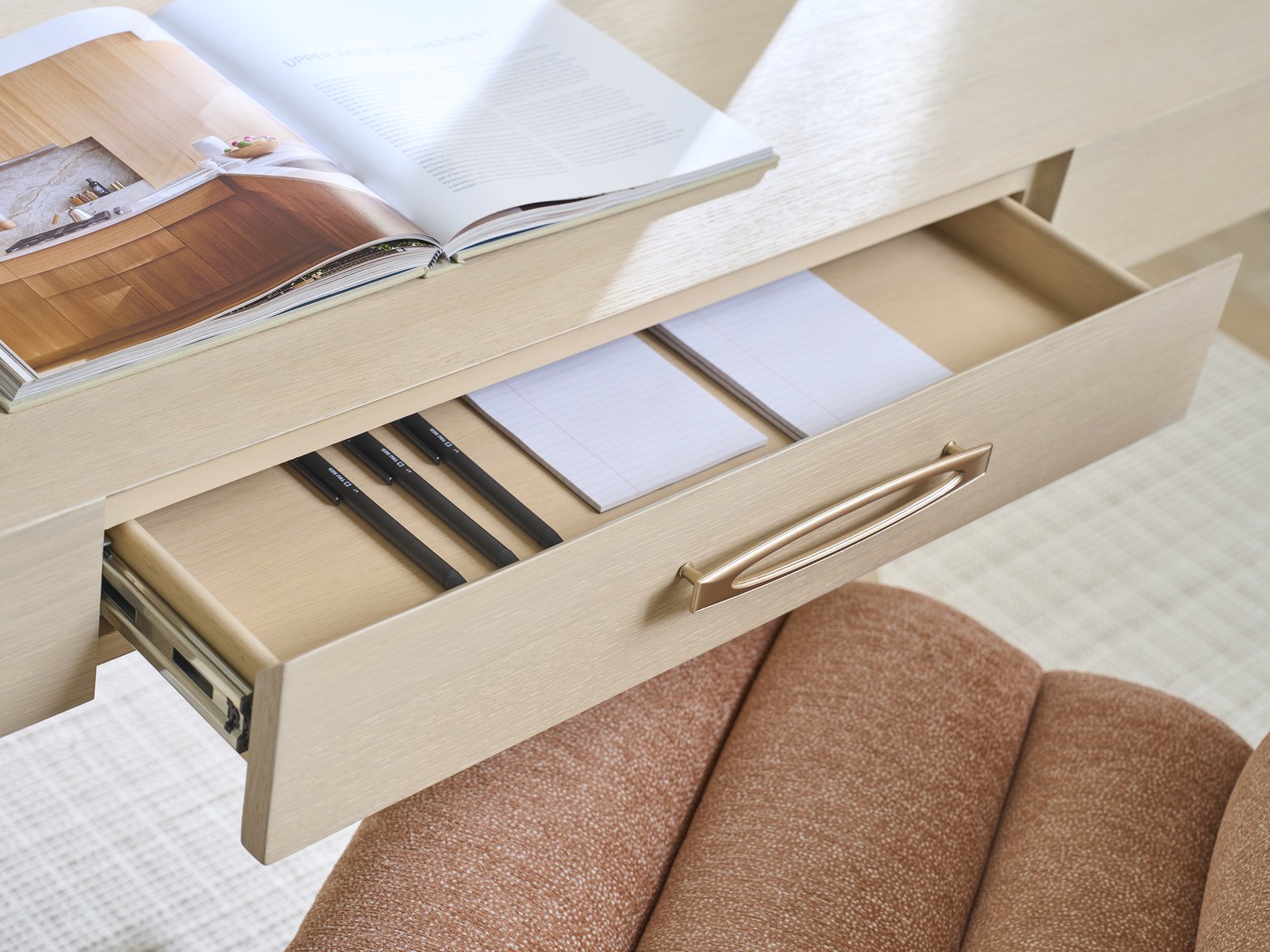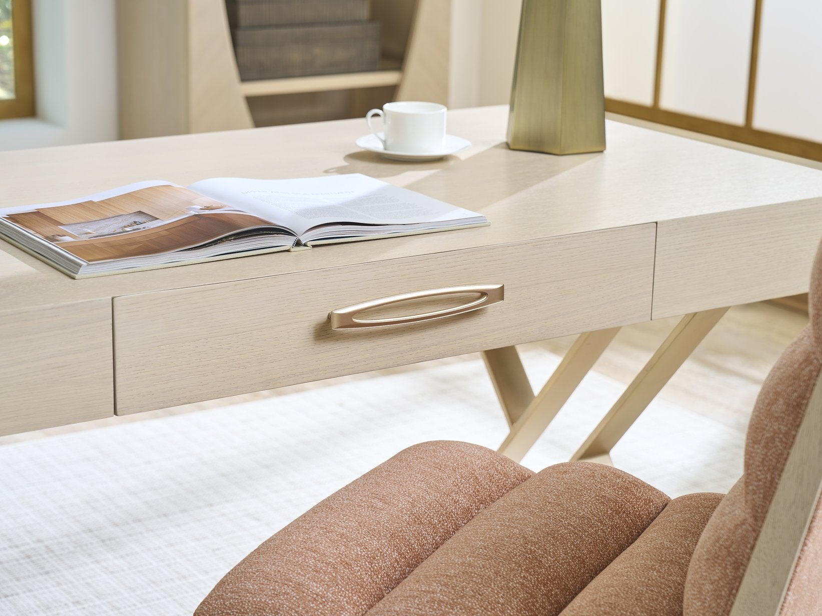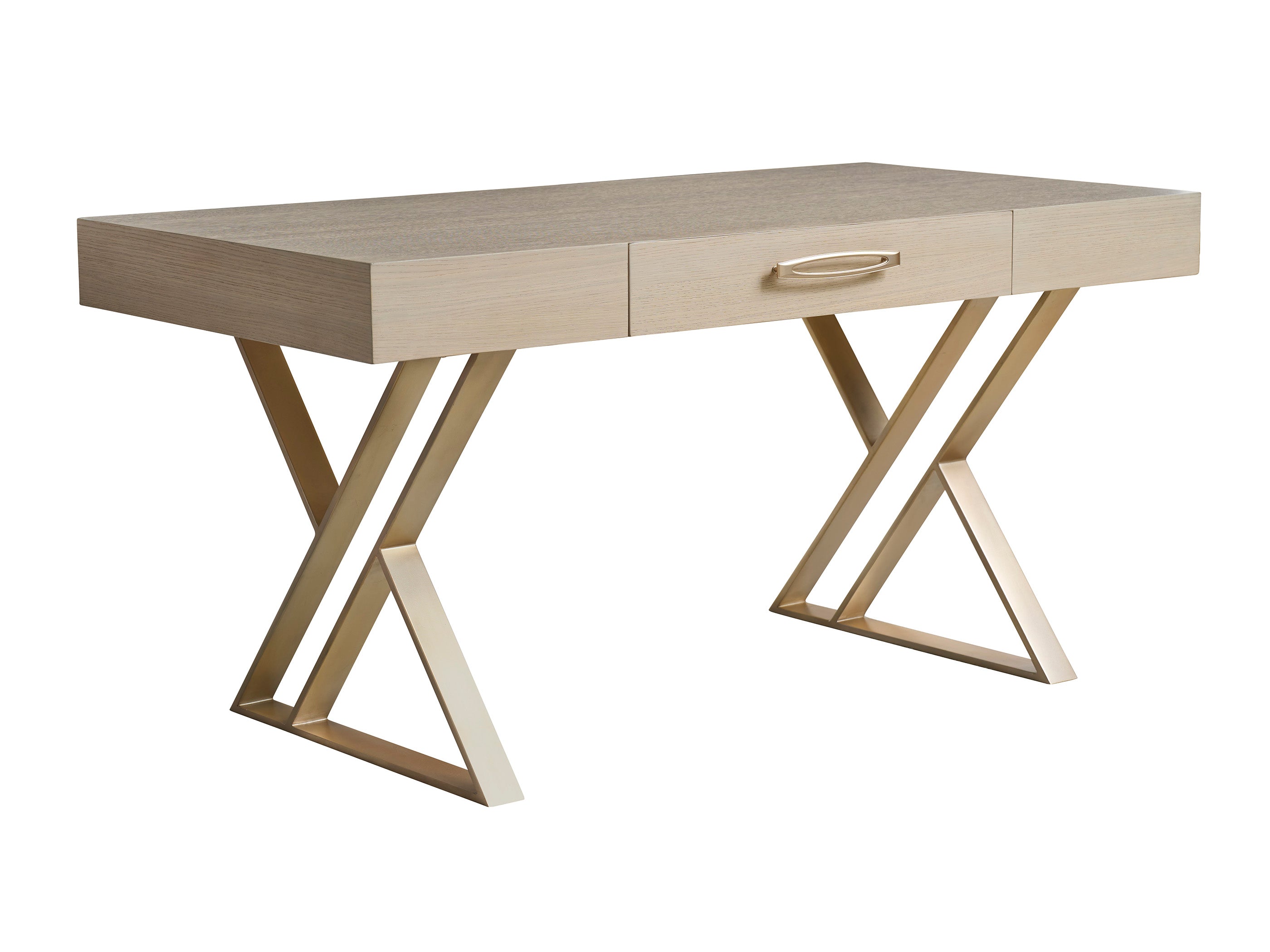 - Custom hardware with a chic champagne finish complements the desk's elegant design.