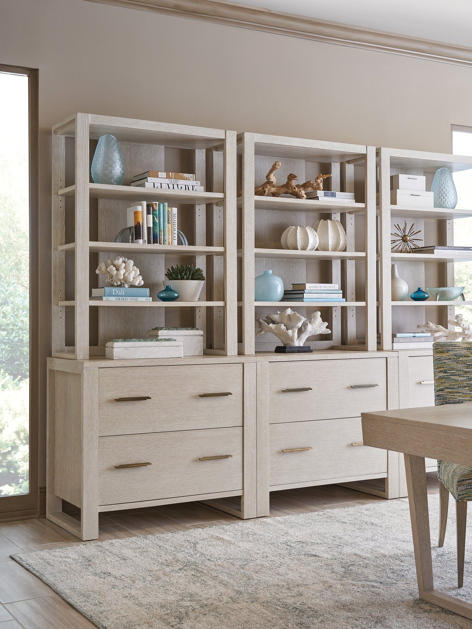 Transform your living space with the Hewitt Deck, a contemporary media console that perfectly blends style and functionality. Crafted from high-quality white oak and finished in a deep walnut hue, this console showcases meticulous attention to detail with its sandblasted surfaces that highlight the natural grain. The elegant champagne-toned hardware adds a sophisticated touch, making it a stunning centerpiece for any modern office or entertainment area. With its unique architectural design, the Hewitt Deck not only provides ample storage but also enhances the visual appeal of your room.