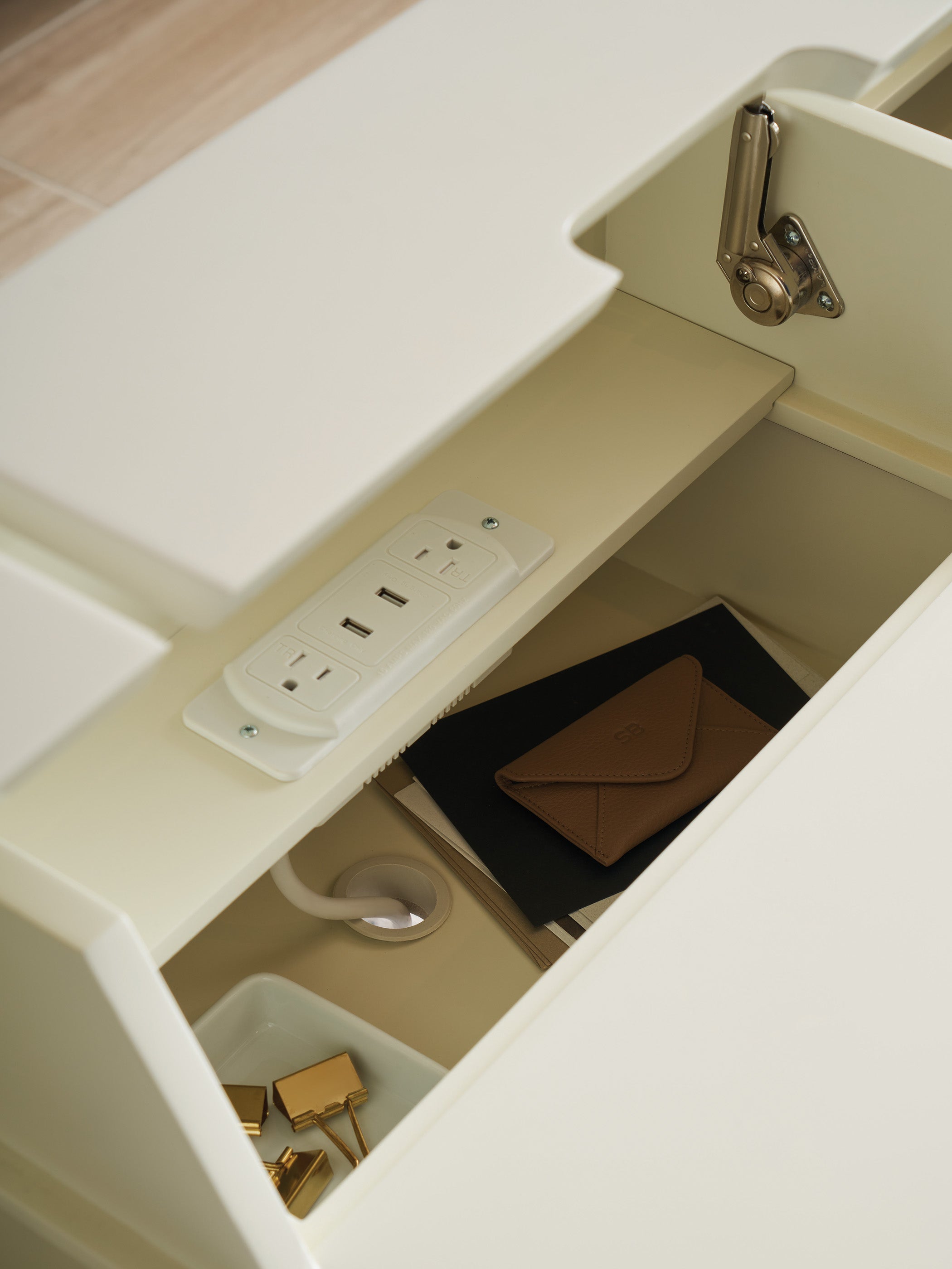 - **Integrated Power Supply**: The central lift lid reveals a two-plug power supply along with two USB charging jacks, allowing for efficient charging of devices while keeping cords neatly managed.