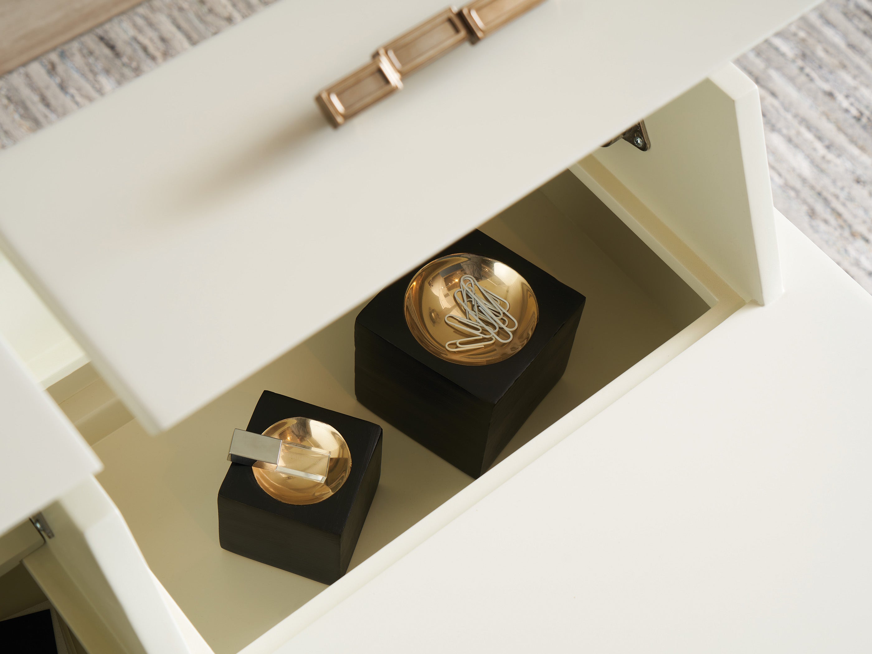 - **Stylish Design**: Featuring a decorative metal base in a warm silver leaf finish that complements the smooth ivory top, this desk adds a touch of sophistication to any room.