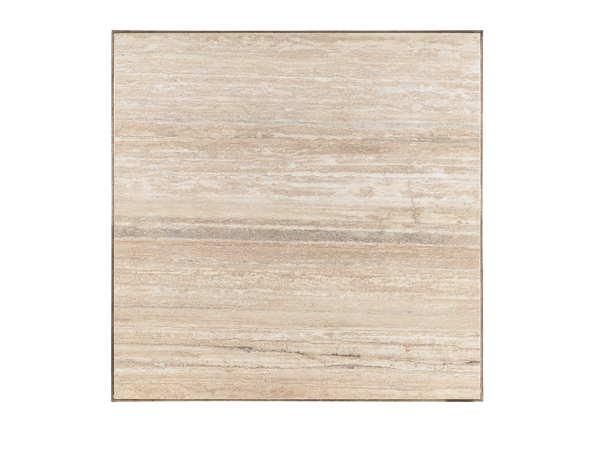 - 48-inch square silver travertine top, providing a spacious surface for drinks and decor.