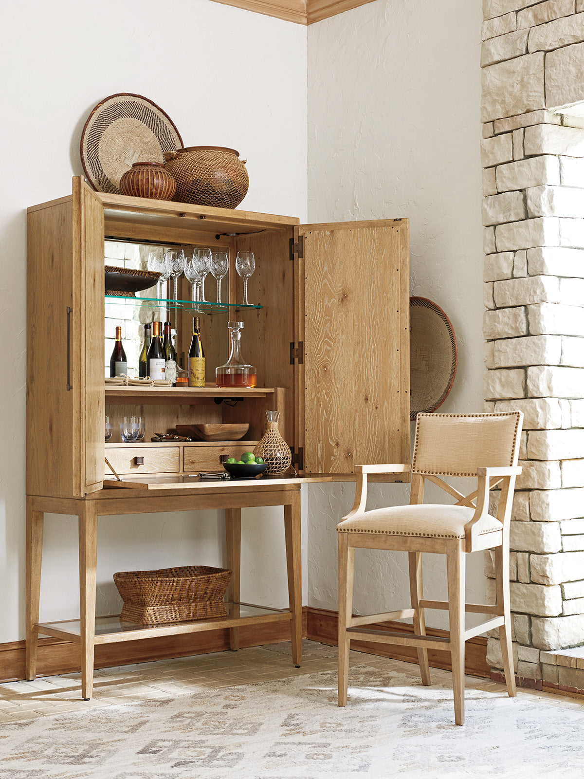 - Accent materials include aged bronze metal, travertine, woven Abaca, and banana leaf