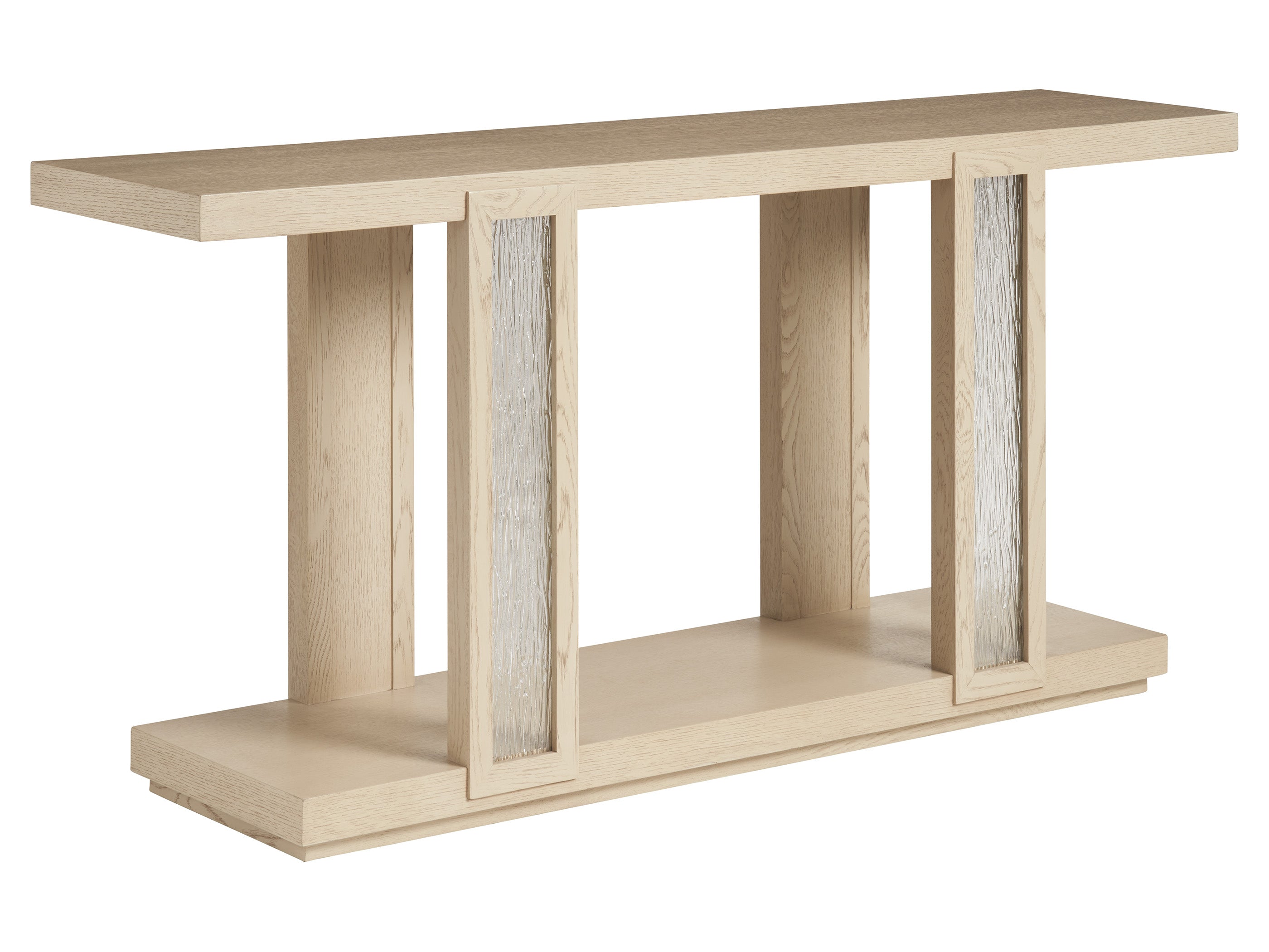 - Features decorative vertical supports that frame ultra-clear wavy glass inserts for a unique aesthetic.
