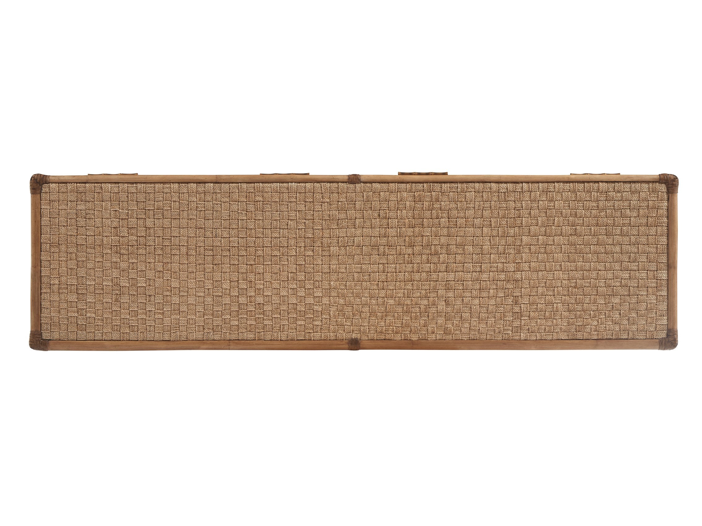 - Woven patterned drawer box, top, end panels, and lower storage shelf crafted from braided Abaca for a natural, organic feel.