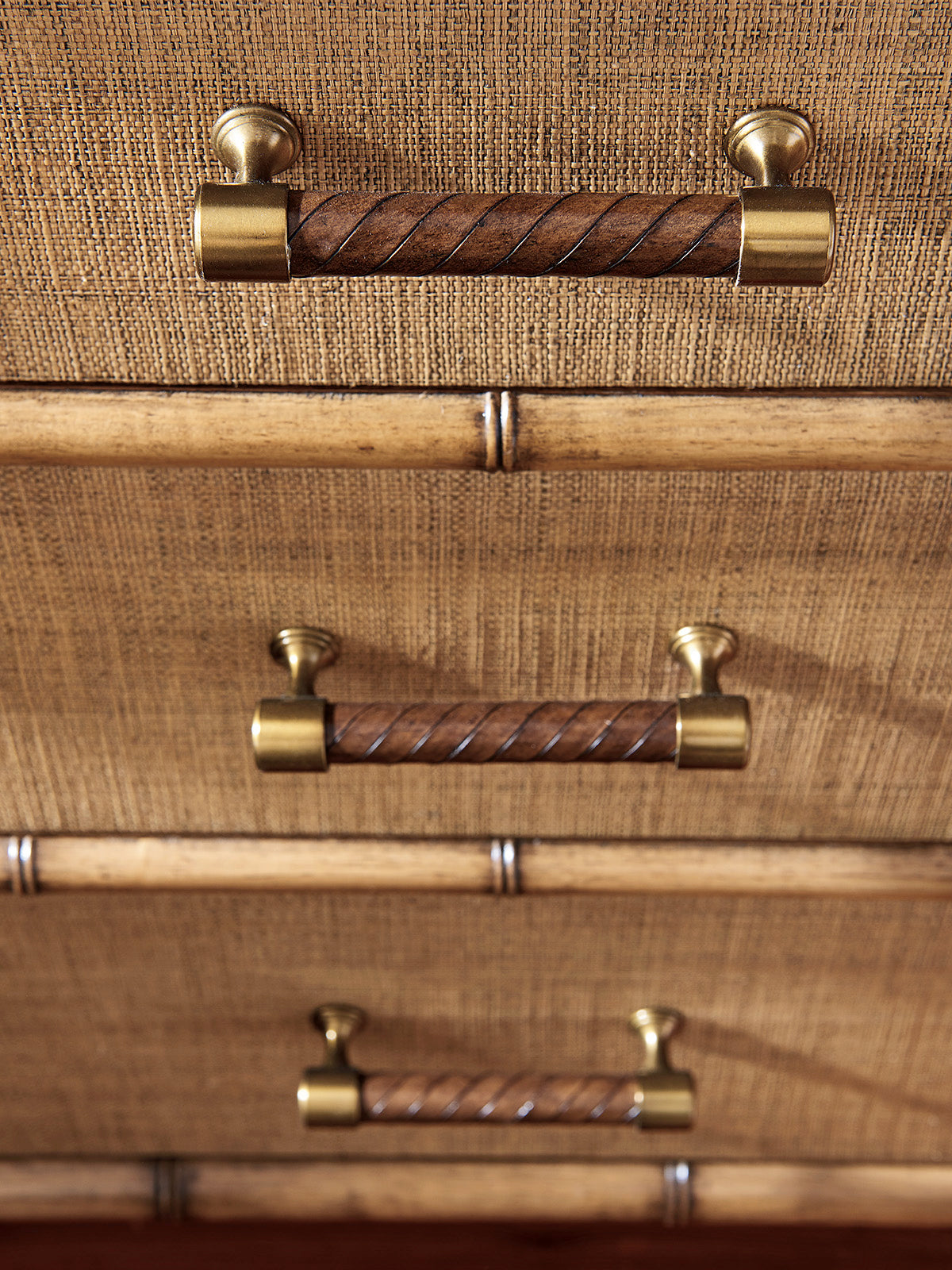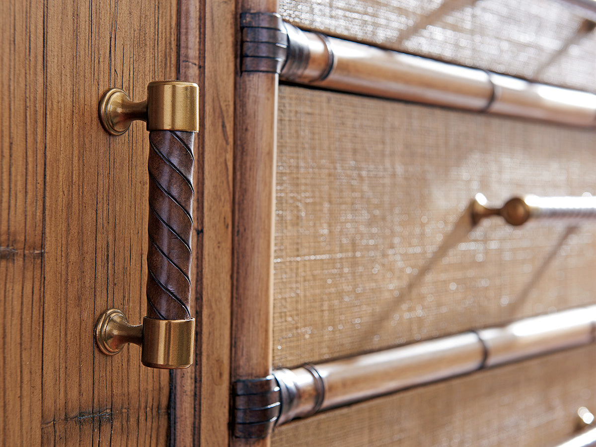 - Constructed with crushed bamboo door fronts and raffia drawer fronts for a natural, textured look.