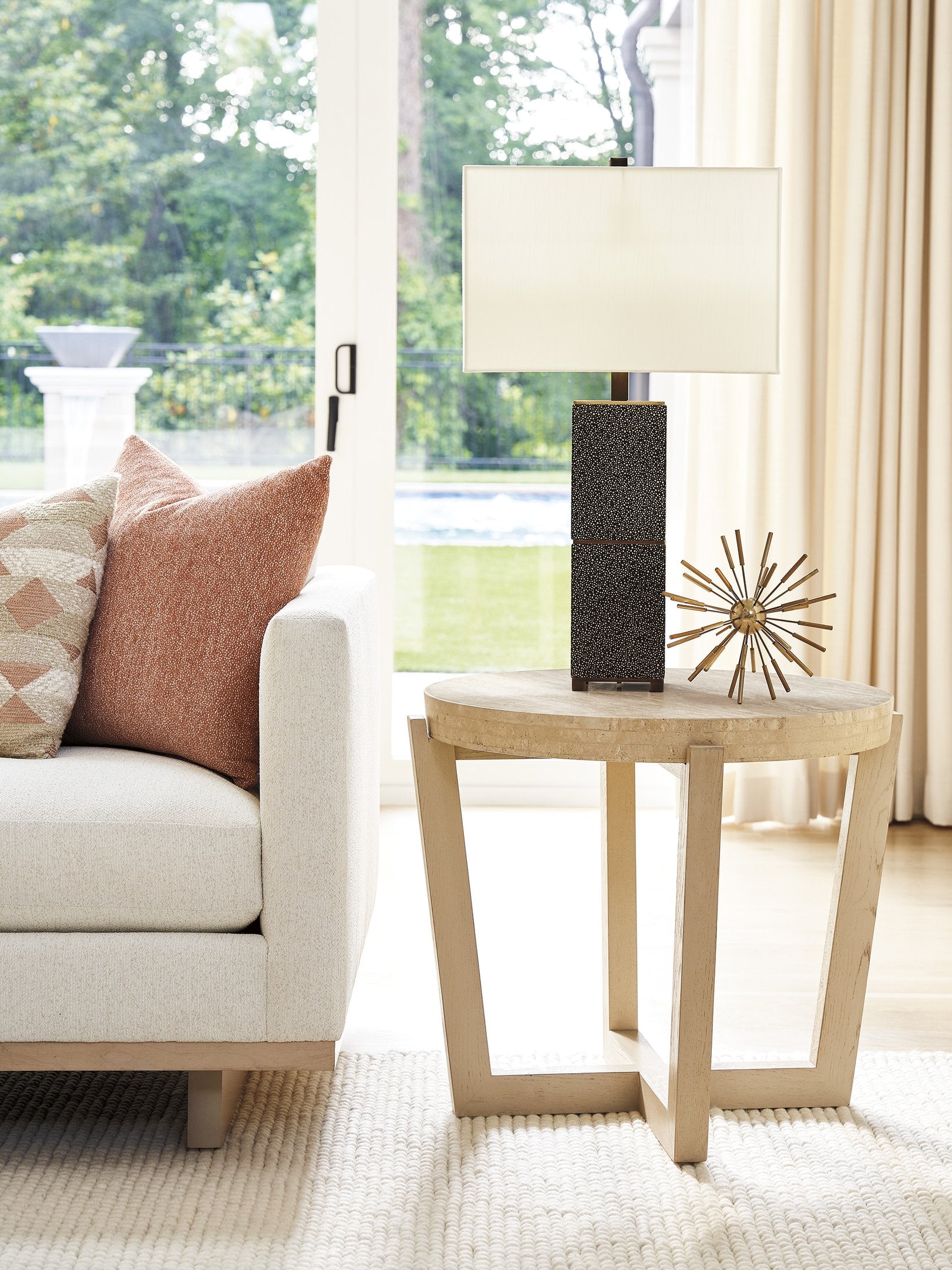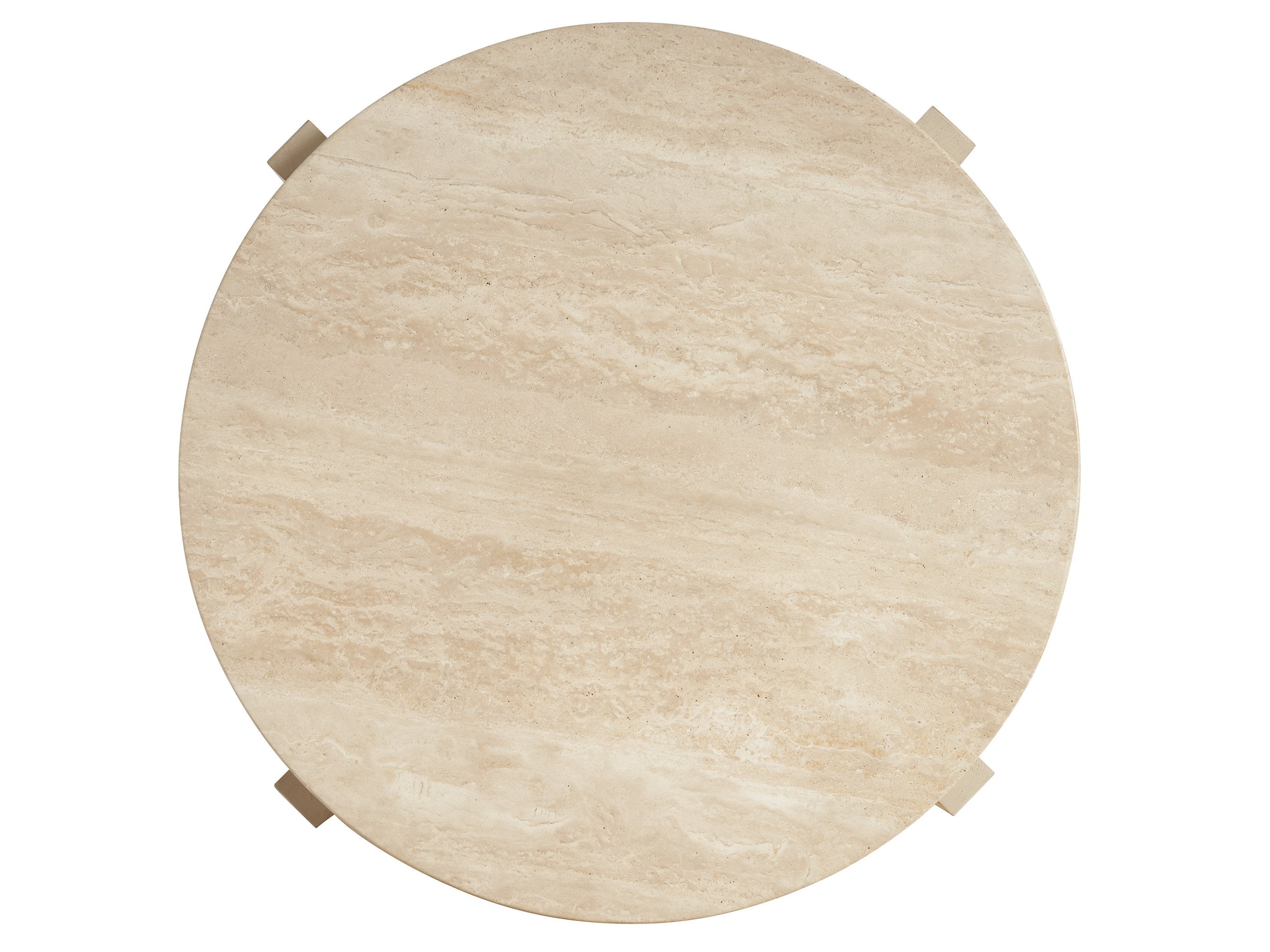 - Features a round natural travertine top, showcasing unique veining and texture for a one-of-a-kind look.