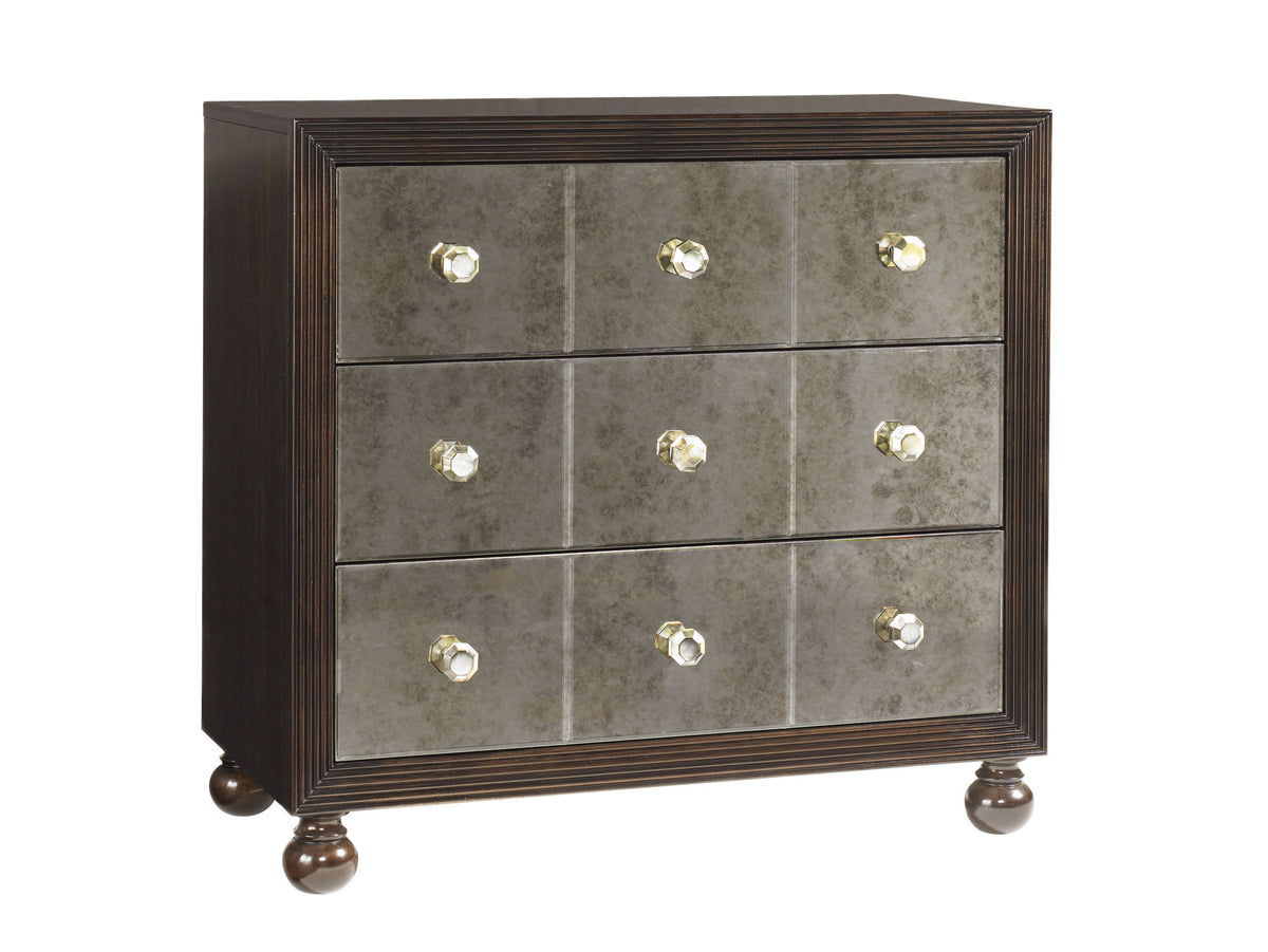 - Features three spacious drawers with antiqued mirrored fronts for a chic look