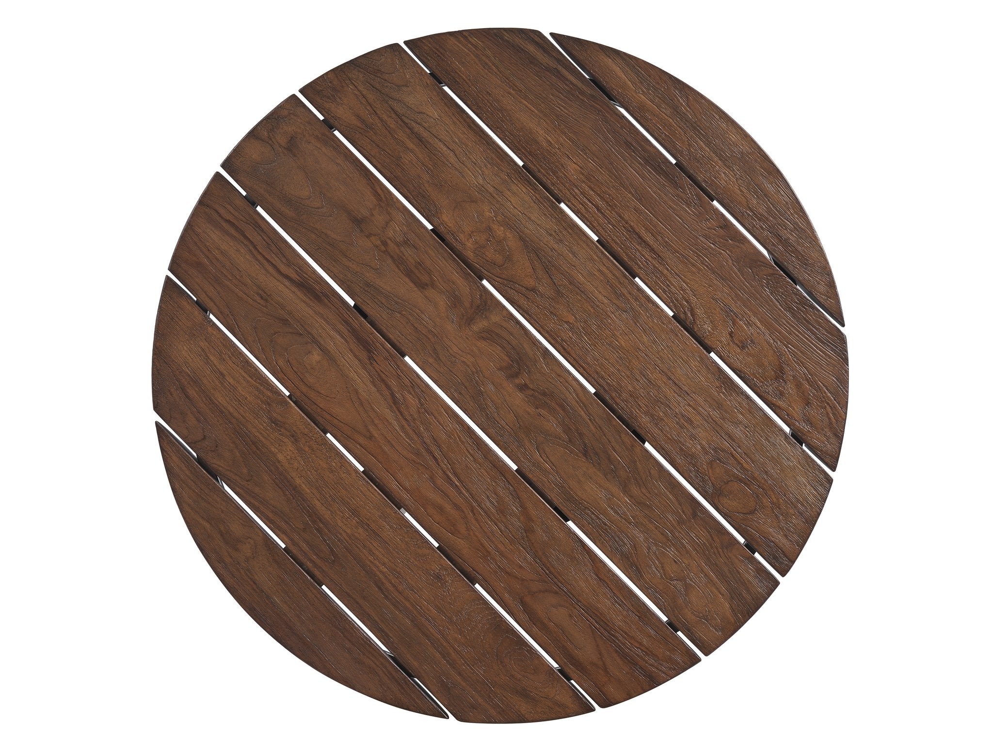 - Natural teak top features an open plank design, enhancing the table's rustic charm.