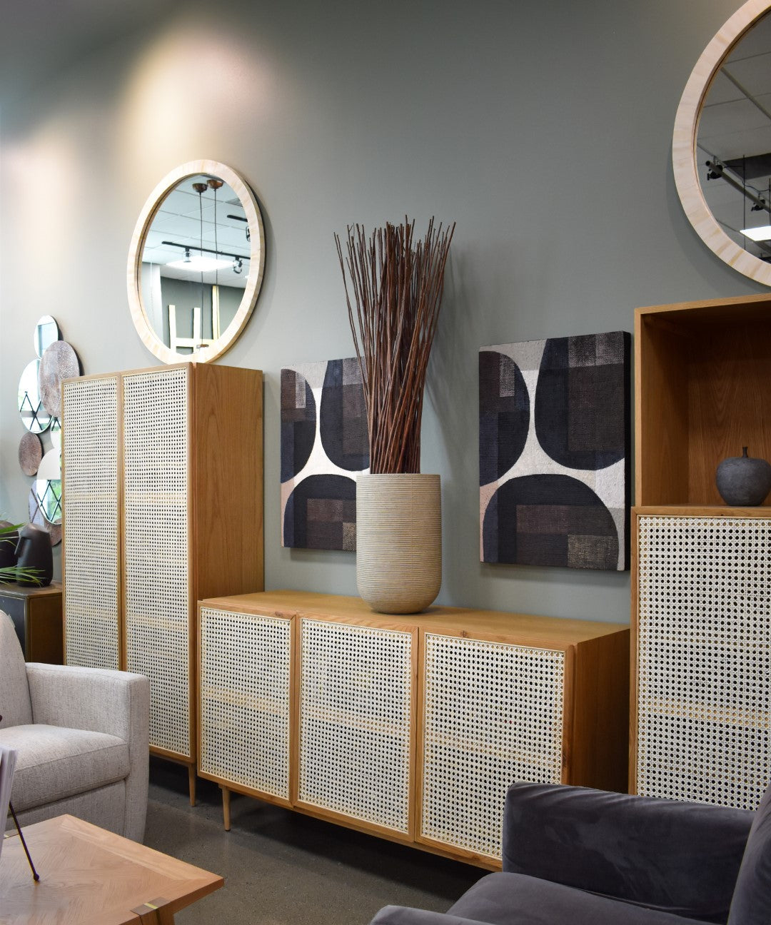 - Materials: Solid Oak, Reclaimed Pine, MDF with Oak Veneer, Rattan