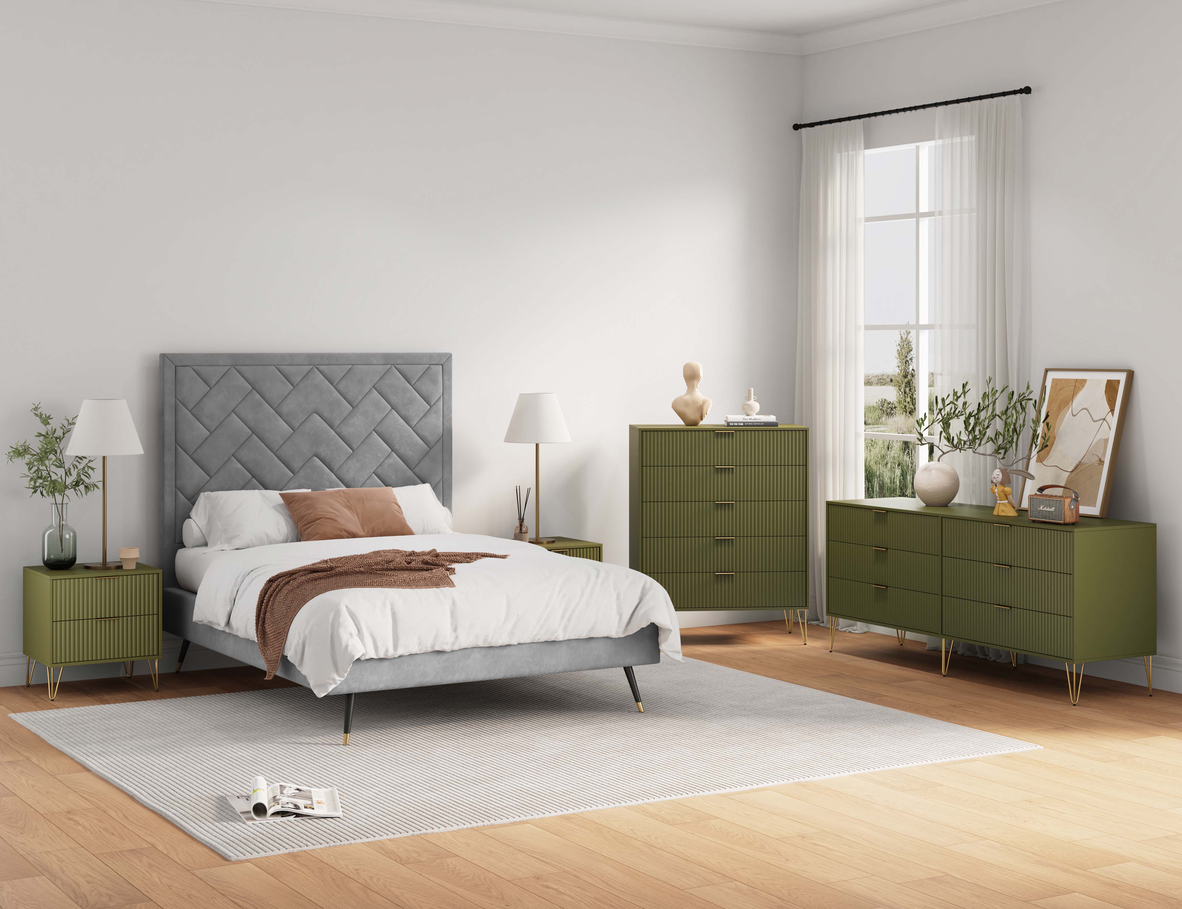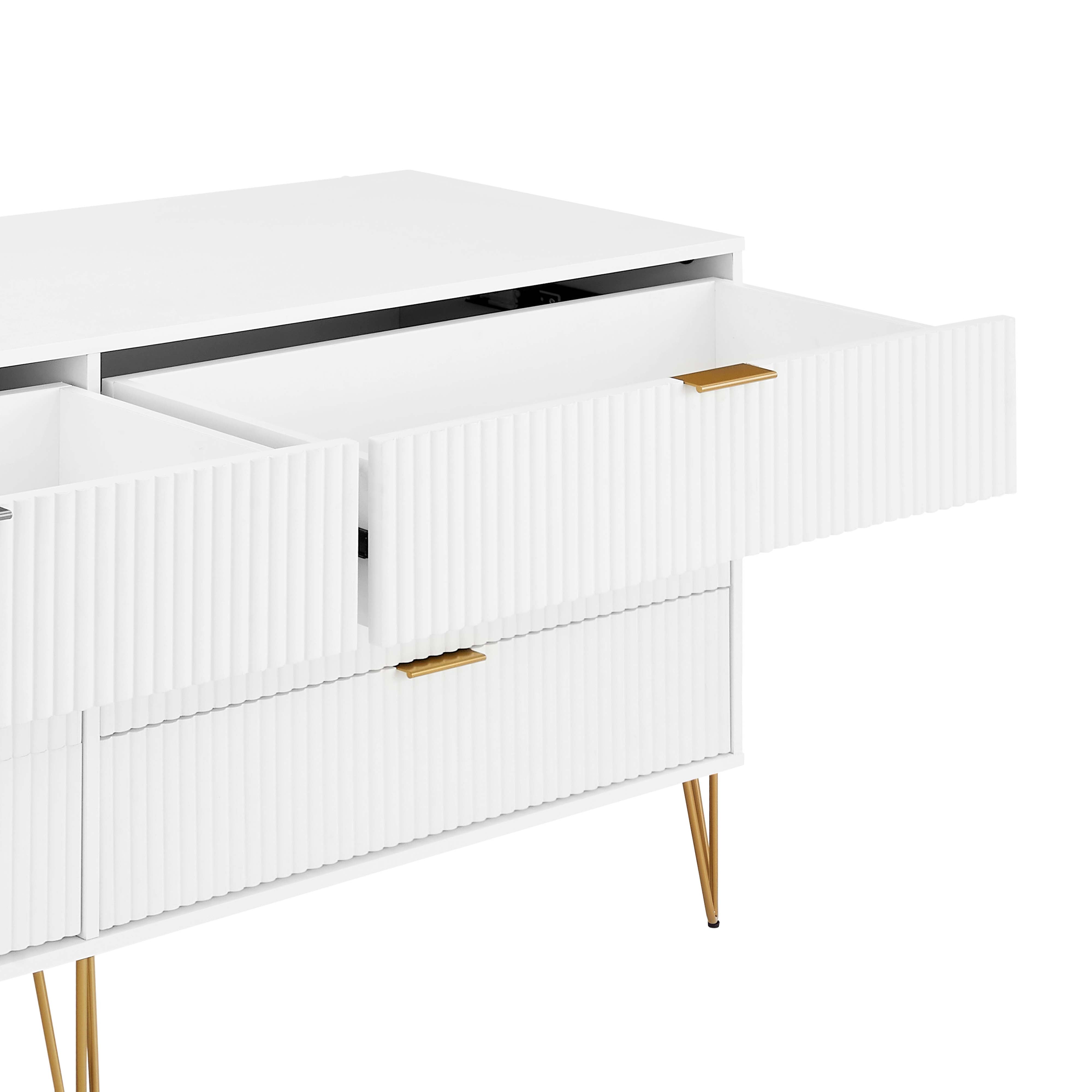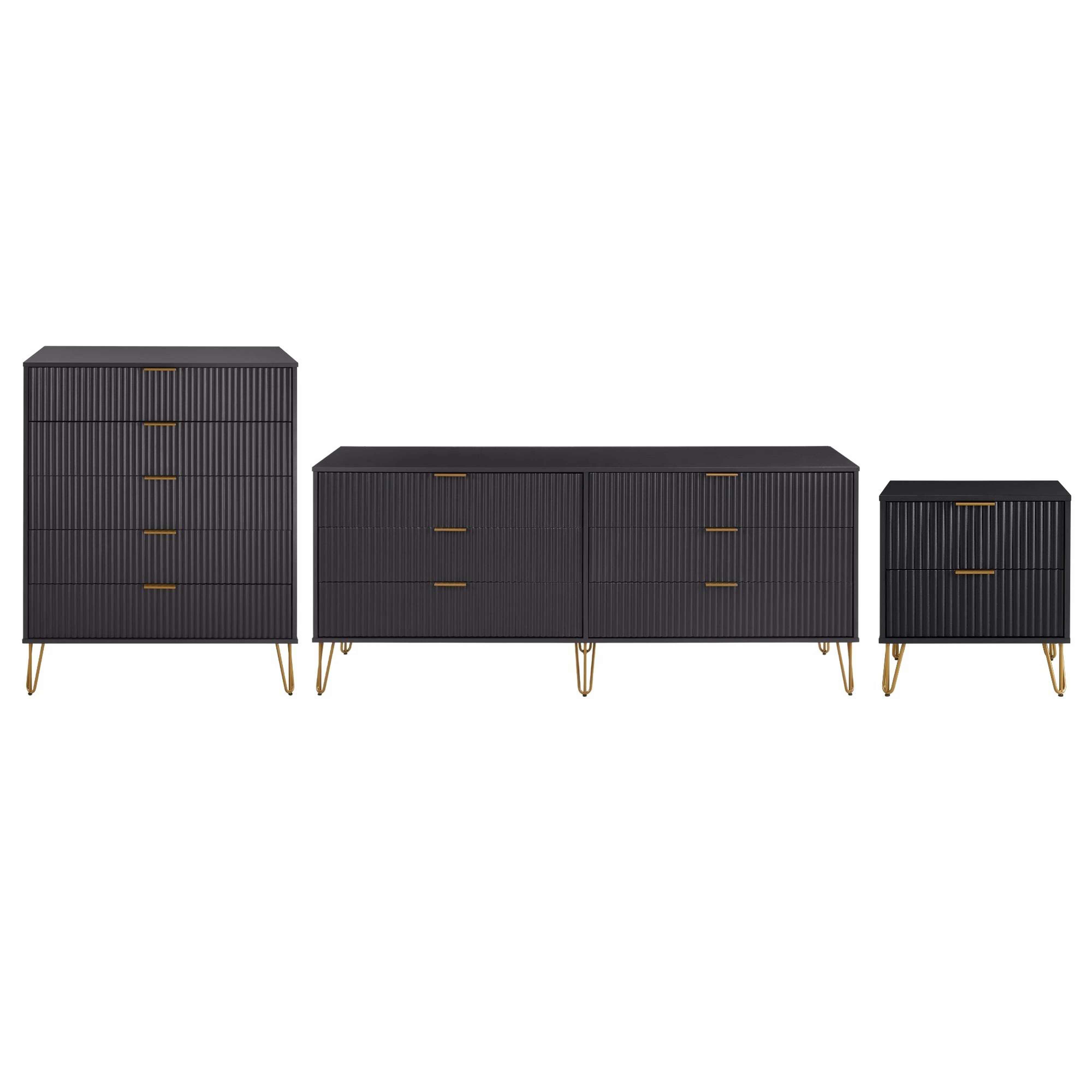 The Manhattan Comfort DUMBO Collection brings tasteful modern glam to your home! With its unique vertical ribbed drawer front, full extension and soft close , and stylish splayed metal legs, the collection is not only a true beauty but also made with quality! Stunning variety of s with sleek metal horizontal handles. DUMBO is what you have been looking for all this time! Make your house a home with the DUMBO Collection.- Modern-Contemporary with a taste of Glam Bedroom Dresser Set. Includes 1 Tall Dresser, 1 Double Low Dresser, and 1 Nightstand 2.0.