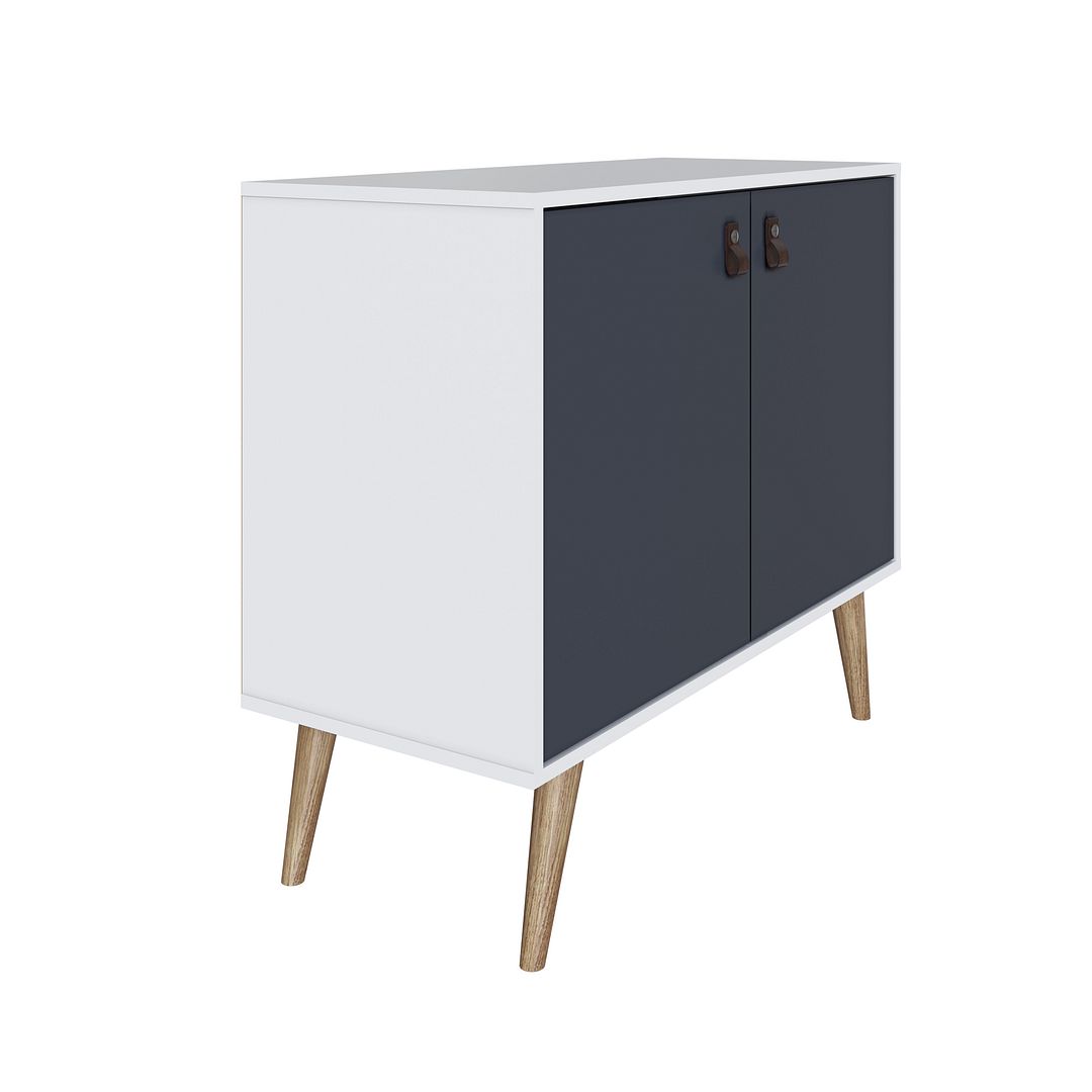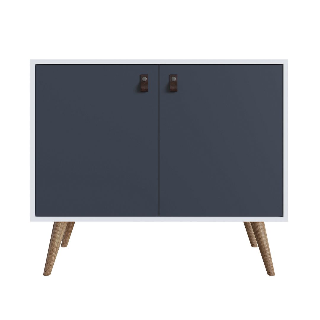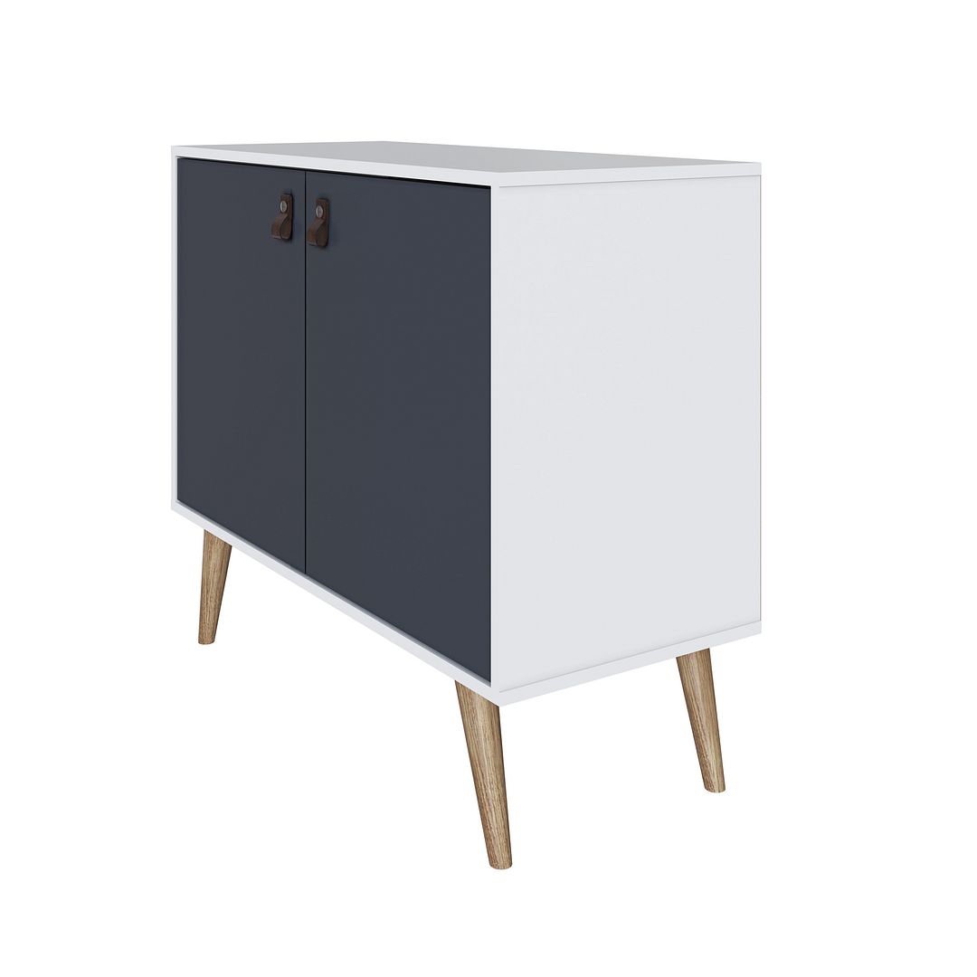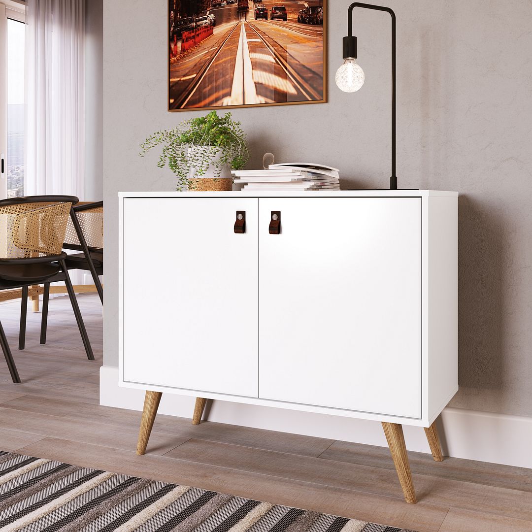 Practical does not have to be boring. The Amber accent cabinet is the perfect example! A chic modern design meets quality craftmanship, add ample storage, and it becomes the perfect addition to your kitchen, dining, or living room. Tuck away your kitchen gadgets, plates, or anything you need organized. The sleek look with modern faux leather button pull loop handles is a welcomed addition to any decor style, from coastal to industrial, vintage to farmhouse. Offered in four shades, white, nature, white and blue, and blue and nature to fit your unique style!- Mid-Century Modern Accent Cabinet for Dining Room, Living Room, and Bedroom Usage.