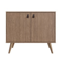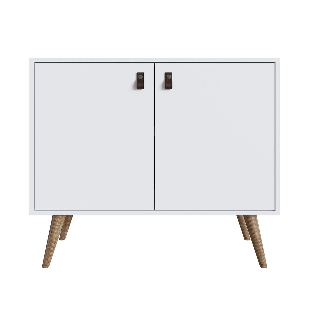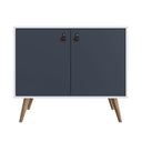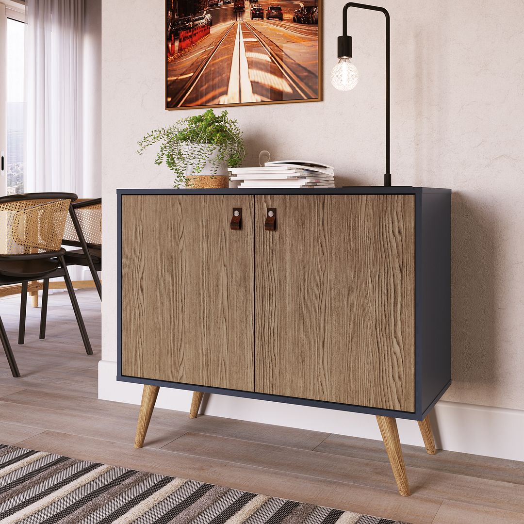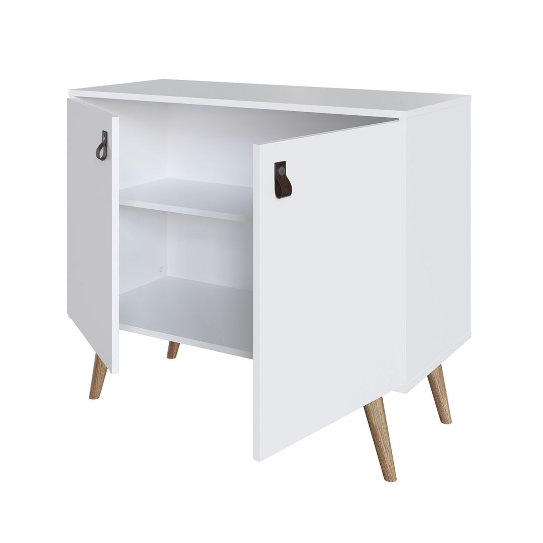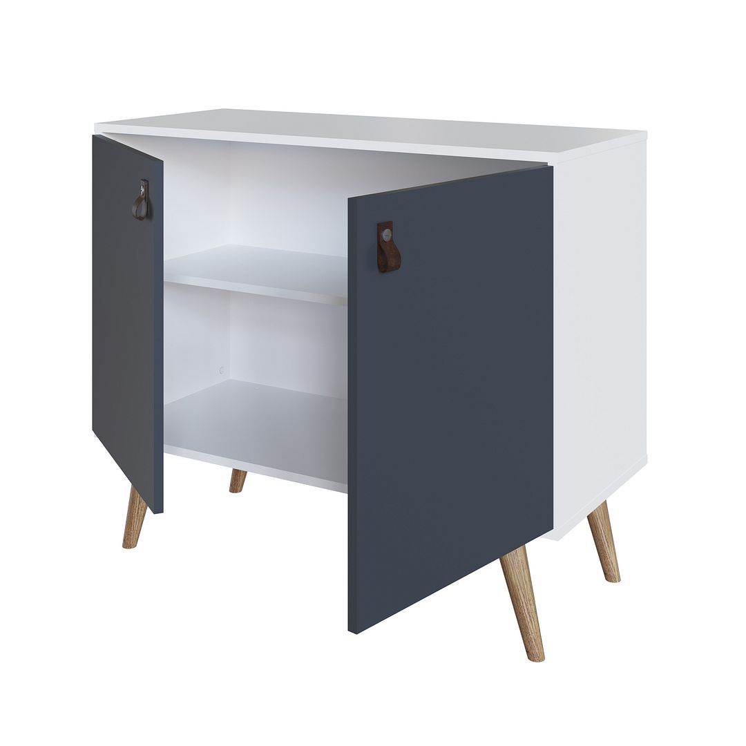 Practical does not have to be boring. The Amber accent cabinet is the perfect example! A chic modern design meets quality craftmanship, add ample storage, and it becomes the perfect addition to your kitchen, dining, or living room. Tuck away your kitchen gadgets, plates, or anything you need organized. The sleek look with modern faux leather button pull loop handles is a welcomed addition to any decor style, from coastal to industrial, vintage to farmhouse. Offered in four shades, white, nature, white and blue, and blue and nature to fit your unique style!- Mid-Century Modern Accent Cabinet for Dining Room, Living Room, and Bedroom Usage.