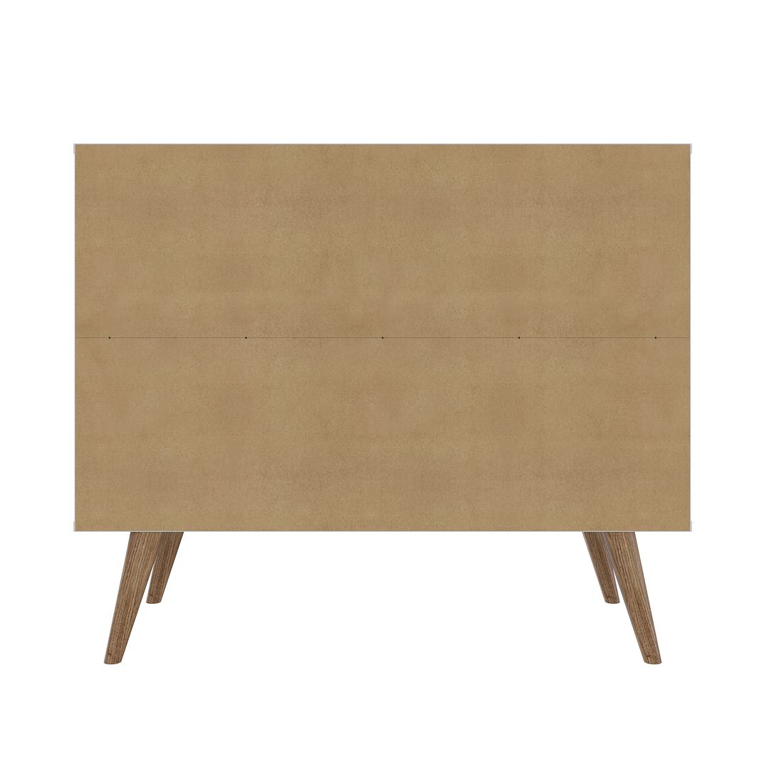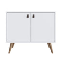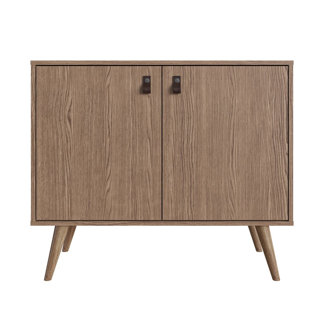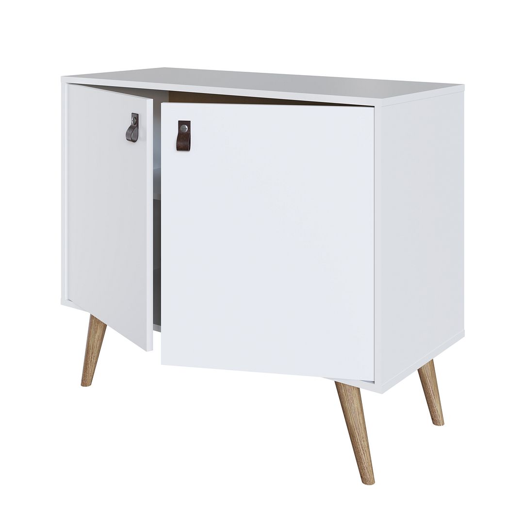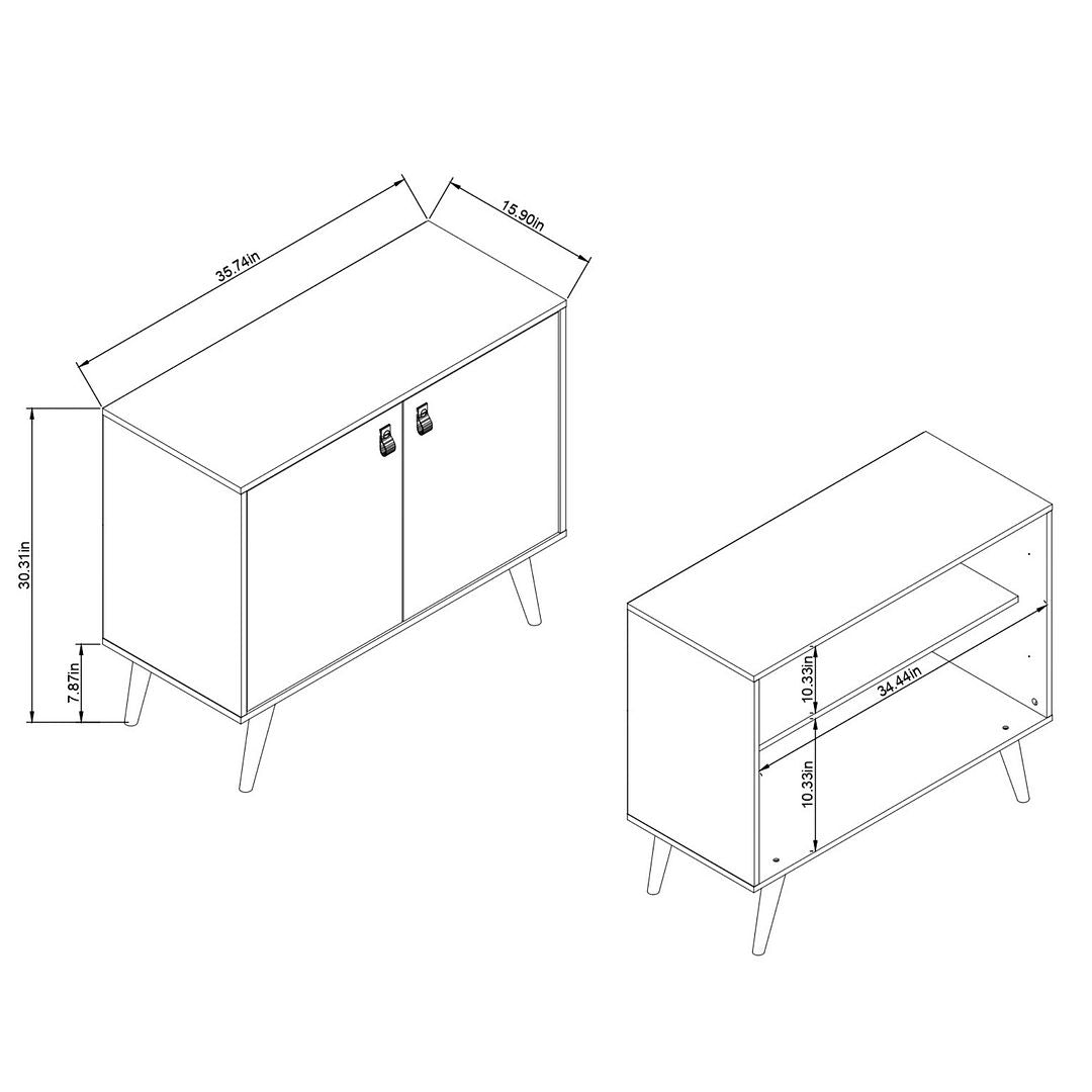 Practical does not have to be boring. The Amber accent cabinet is the perfect example! A chic modern design meets quality craftmanship, add ample storage, and it becomes the perfect addition to your kitchen, dining, or living room. Tuck away your kitchen gadgets, plates, or anything you need organized. The sleek look with modern faux leather button pull loop handles is a welcomed addition to any decor style, from coastal to industrial, vintage to farmhouse. Offered in four shades, white, nature, white and blue, and blue and nature to fit your unique style!- Mid-Century Modern Accent Cabinet for Dining Room, Living Room, and Bedroom Usage.
