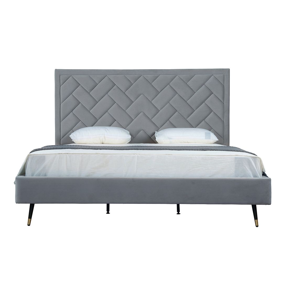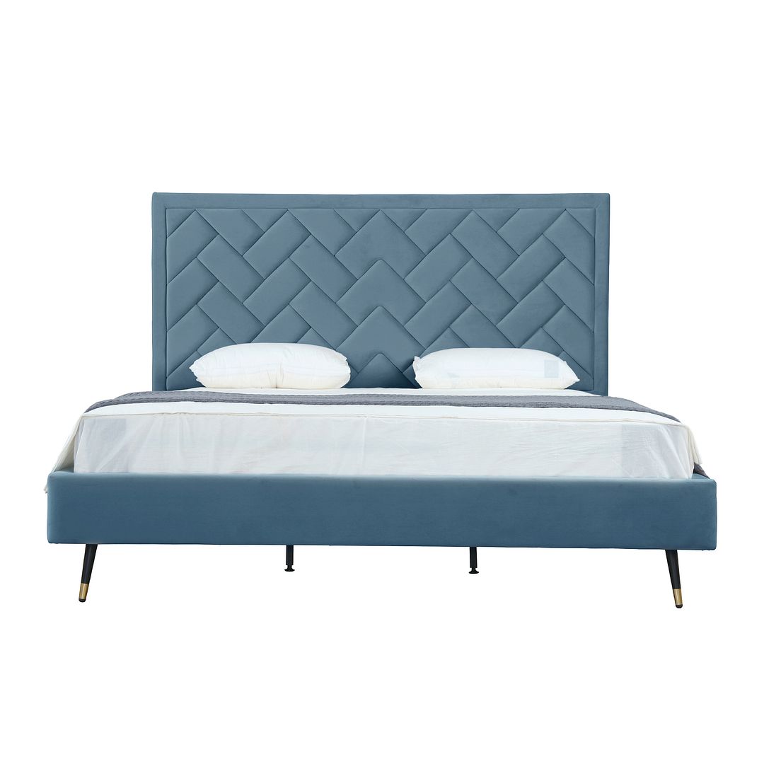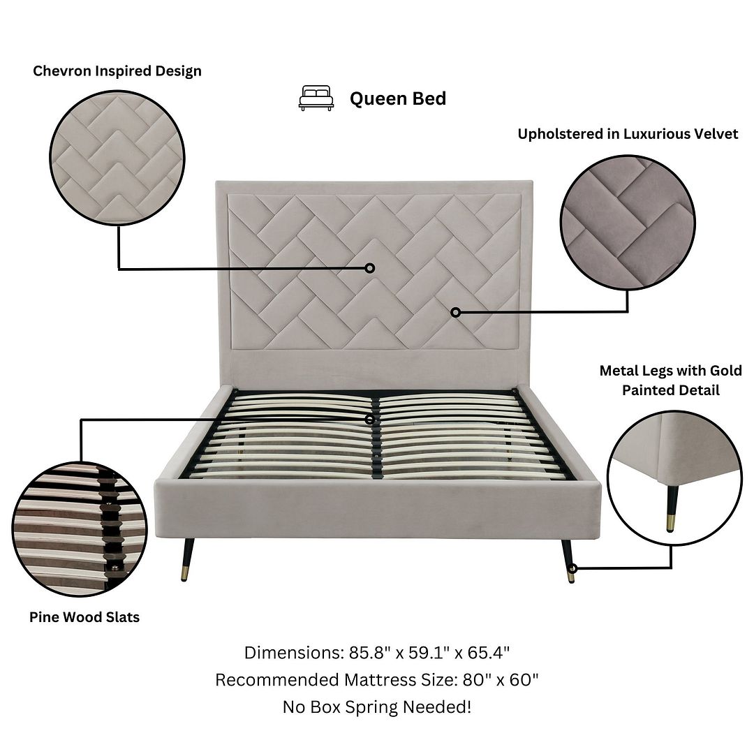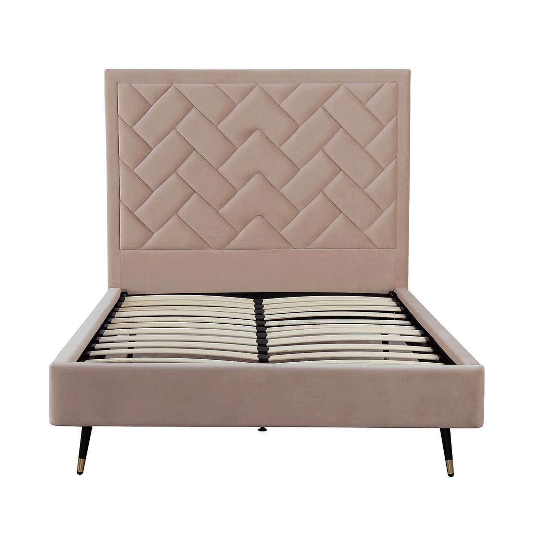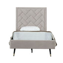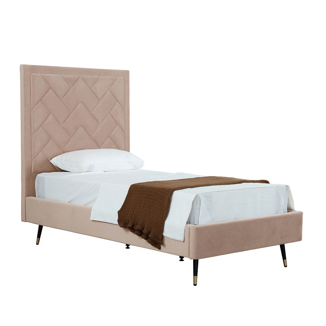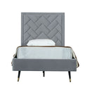 This platform bed anchors your bedroom in glam, mid-century-inspired style. It's built with an engineered wood frame and features understated side rails and footboard for a clean-lined silhouette. The headboard is upholstered in a luxurious velvet that features chevron style weave stitching. Plus, it's filled with foam for some extra cushion behind your head. Angled black iron legs with gold tips support the bed with a retro aesthetic. This bed arrives with slats and a center support leg, so you don't have to use a box spring with your choice of mattress.- Mid-Century Modern Twin Bedframe with Headboard for Bedroom Use.