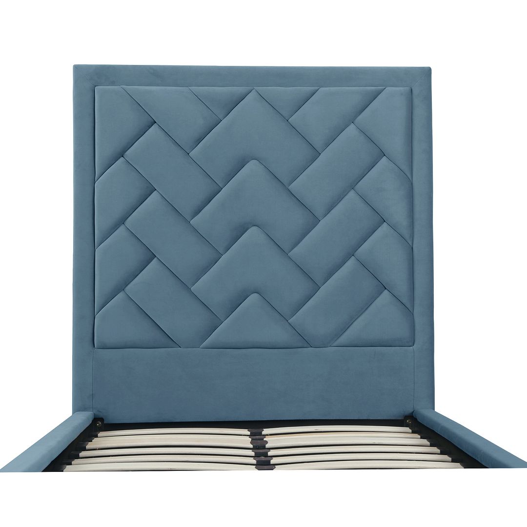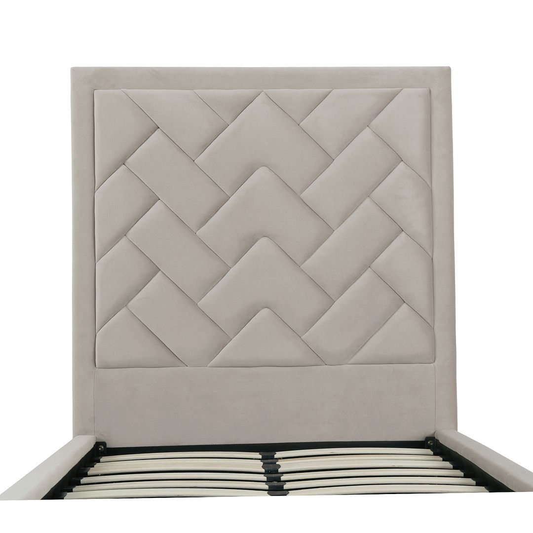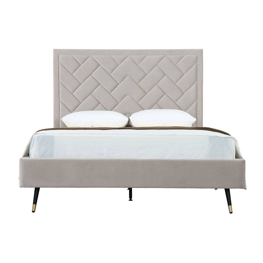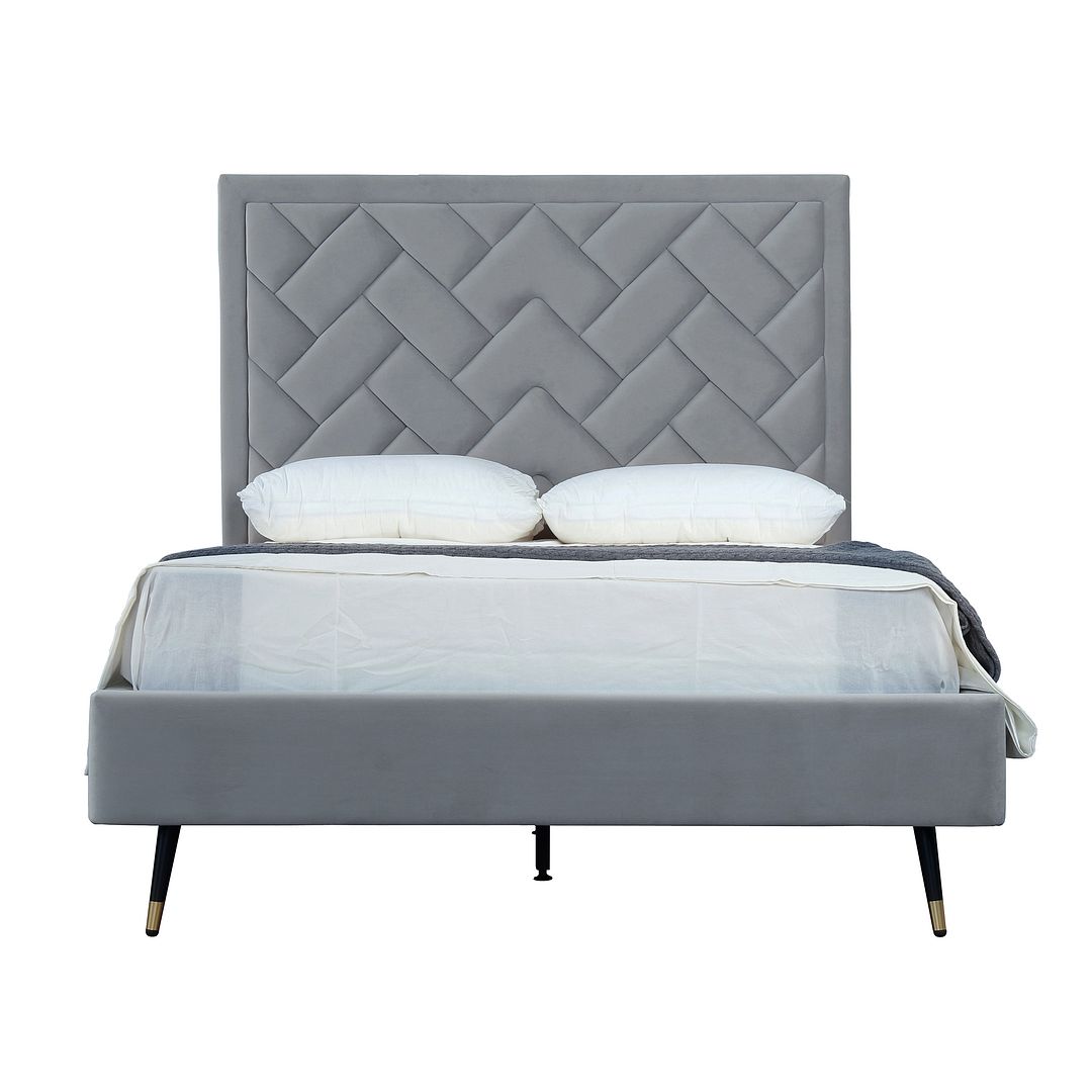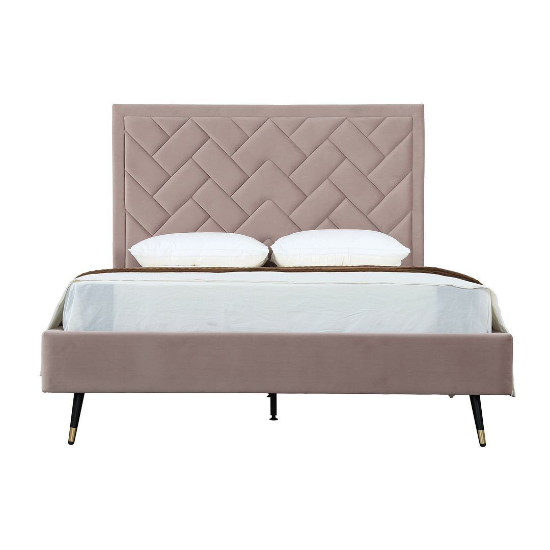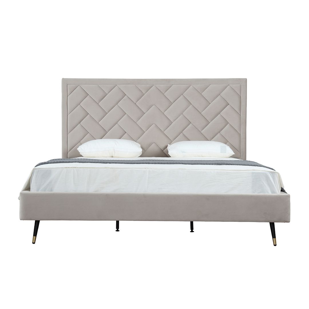 This platform bed anchors your bedroom in glam, mid-century-inspired style. It's built with an engineered wood frame and features understated side rails and footboard for a clean-lined silhouette. The headboard is upholstered in a luxurious velvet that features chevron style weave stitching. Plus, it's filled with foam for some extra cushion behind your head. Angled black iron legs with gold tips support the bed with a retro aesthetic. This bed arrives with slats and a center support leg, so you don't have to use a box spring with your choice of mattress.- Mid-Century Modern Twin Bedframe with Headboard for Bedroom Use.
