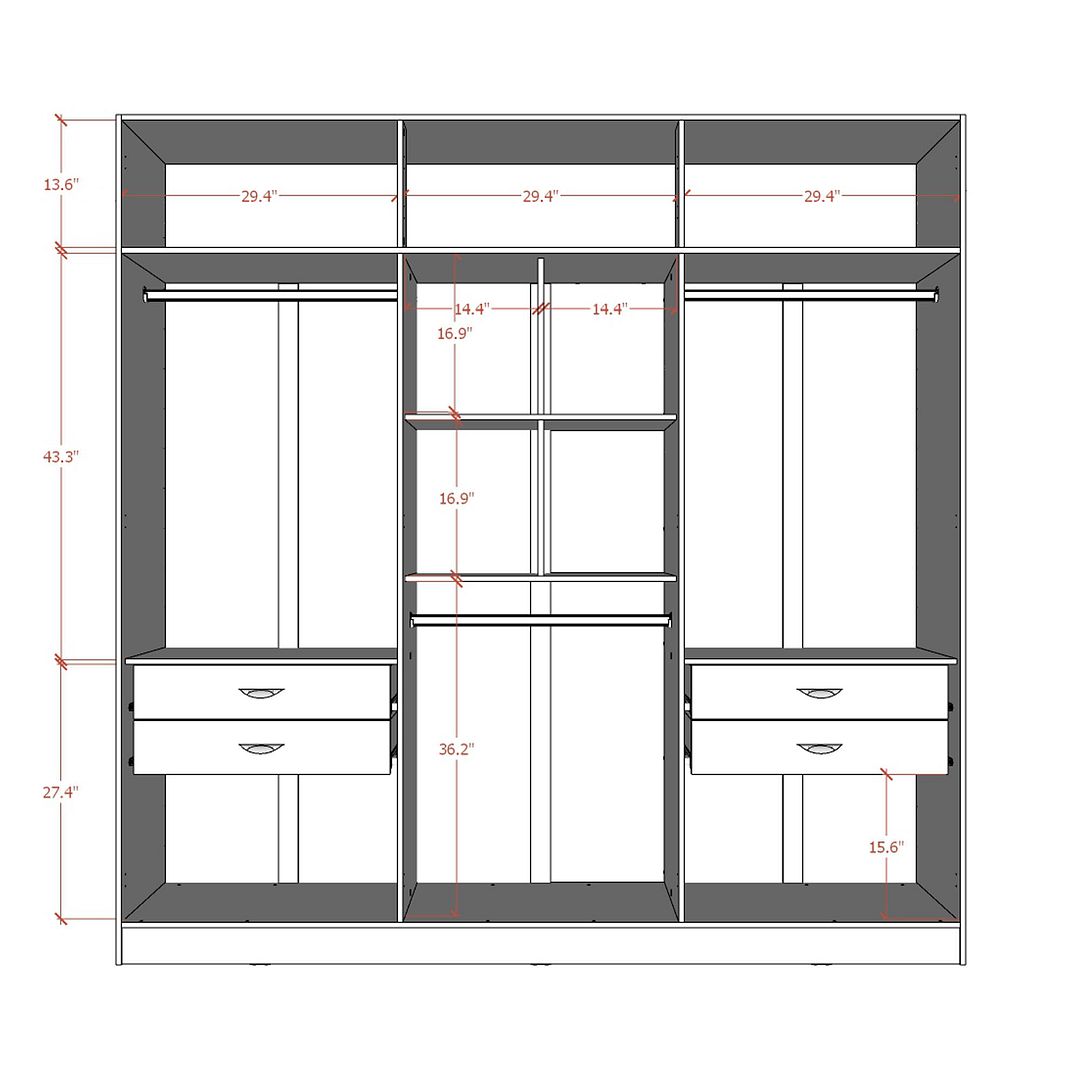 The Eldridge enters the market showing that it is possible to develop an economical product, while maintaining quality and design. Its measurements are perfect for the new concept of homes, which feature increasingly smaller spaces for bedrooms. Its compact , , and aluminum rods allow you to neatly fold or hang items to keep things organized, and out of sight. With everything you could need in one neat condensed space, this modern wardrobe with sleek chrome handles that take up the bottom half of the is perfect for any smaller bedroom. Choose between different warm and inviting modern es to compliment your bedroom. The Eldridge features a Pro-Touch High definition, ultra-resistant with the texture of Natural Wood, and stylish wood pattern as well a High Gloss . The unique paint is protected by the Microban Antibacterial Protection.- Upon Assembly, measures: 90.5L x 90.7H x 19D.