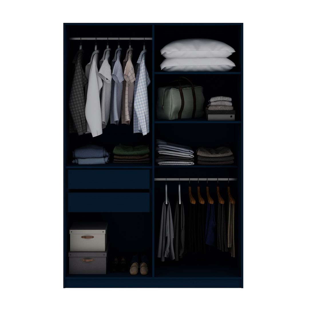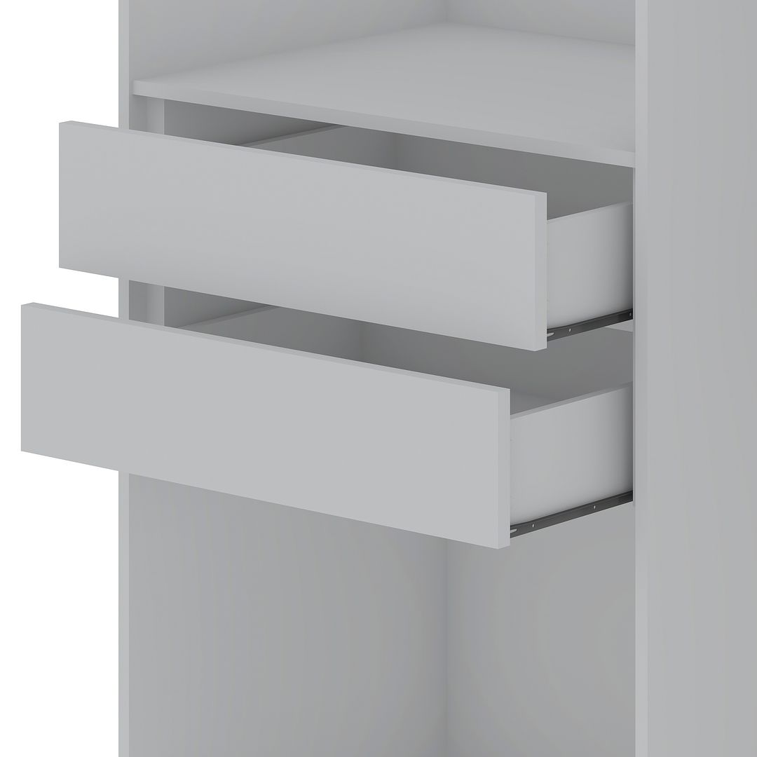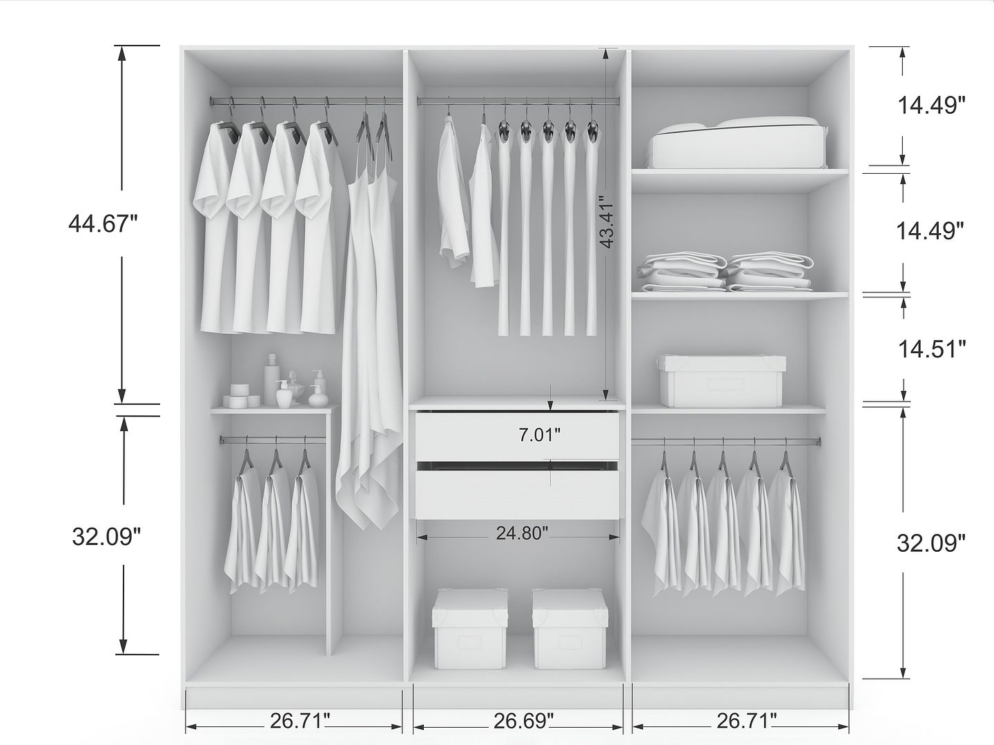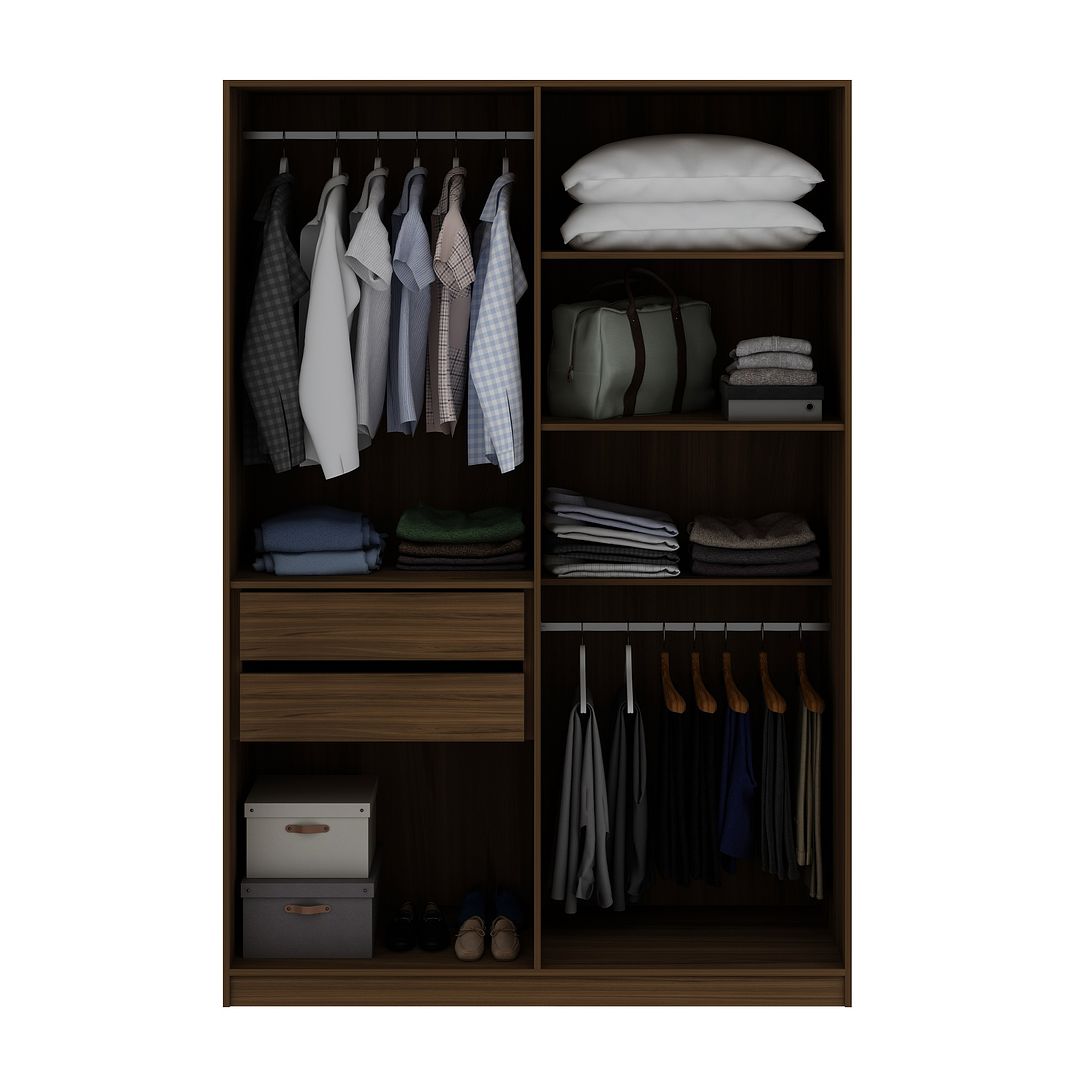 - 2- Sectional Wardrobe Includes 4 Fixed Shelves, 2 Aluminum Hanging Rods, and 2 Drawers.