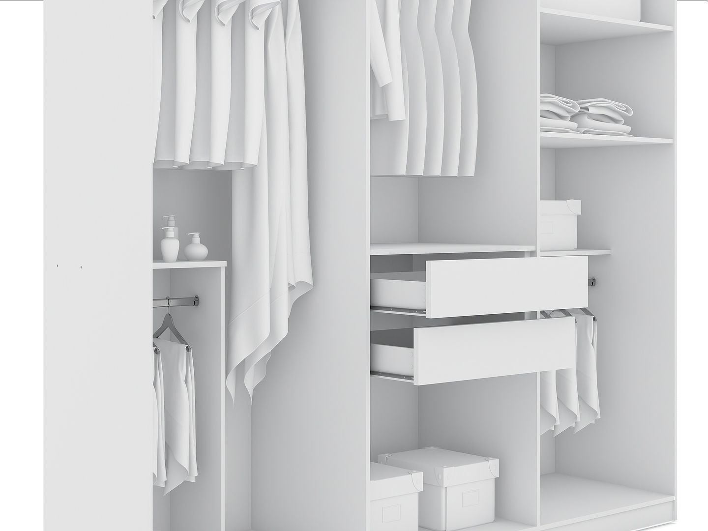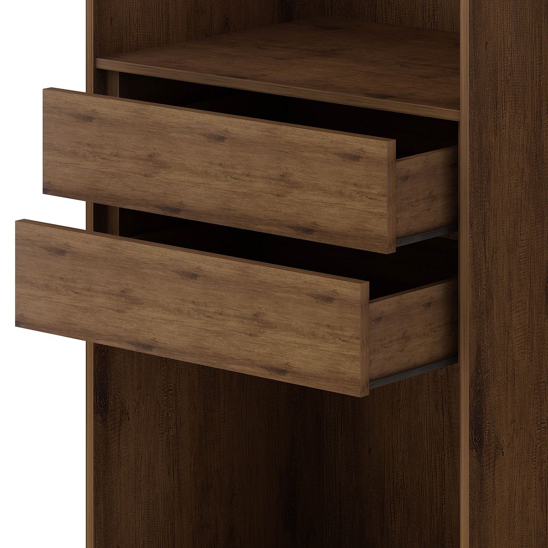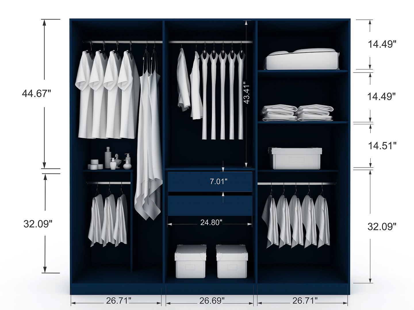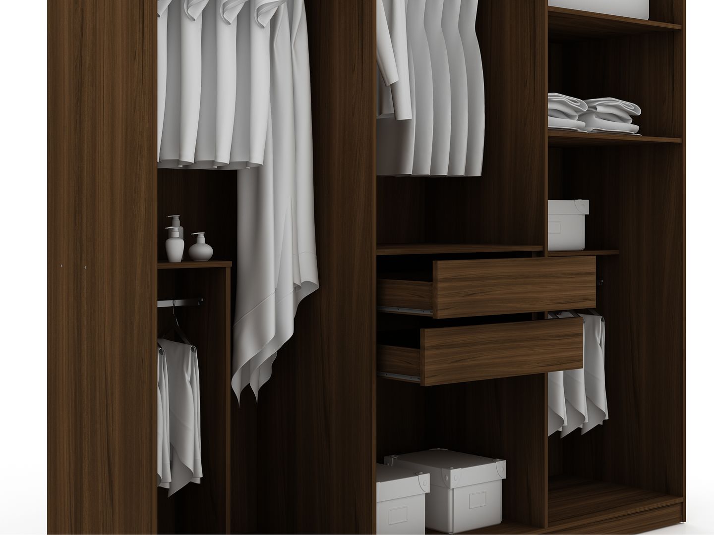 - 2- Sectional Wardrobe Includes 4 Fixed Shelves, 2 Aluminum Hanging Rods, and 2 Drawers.