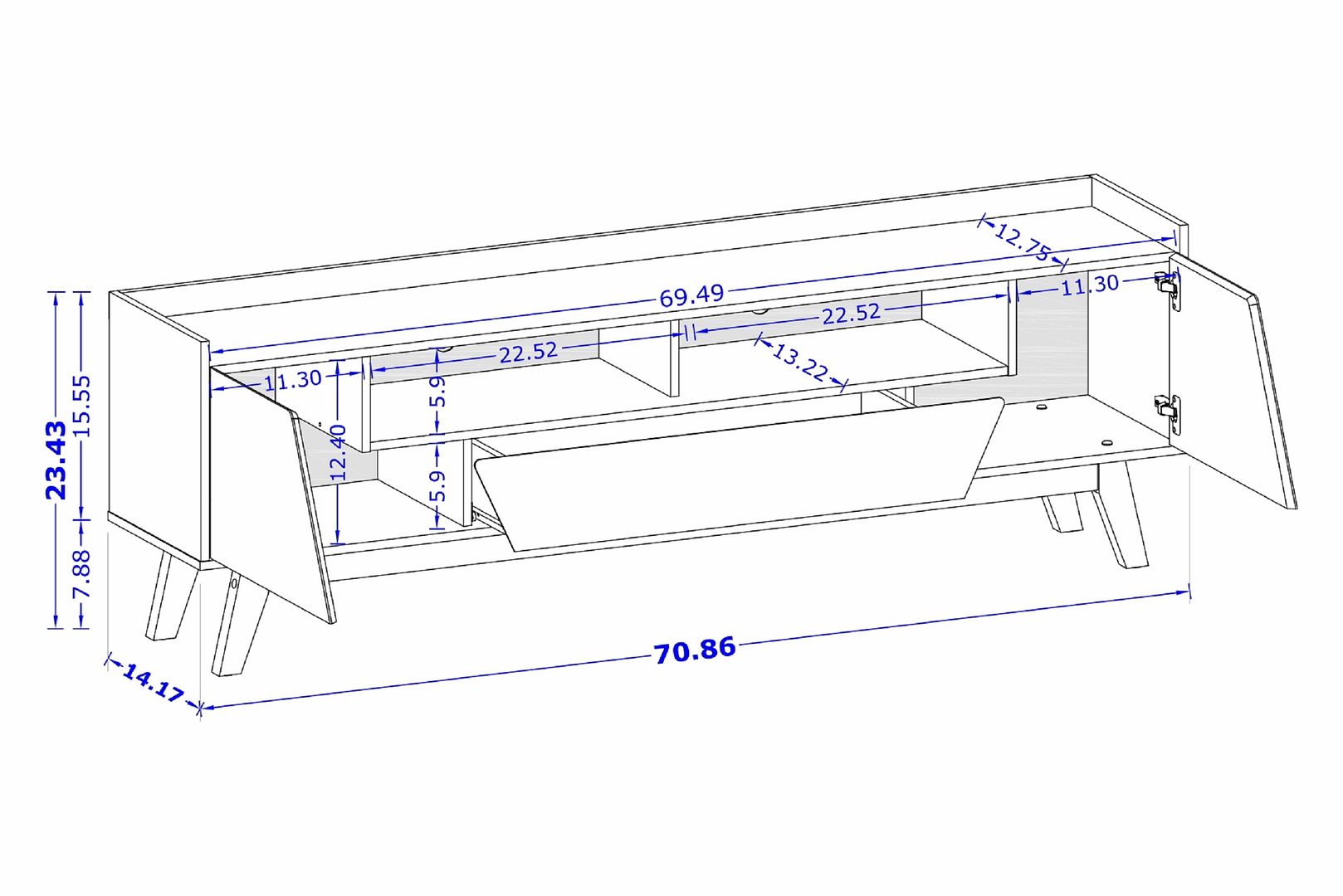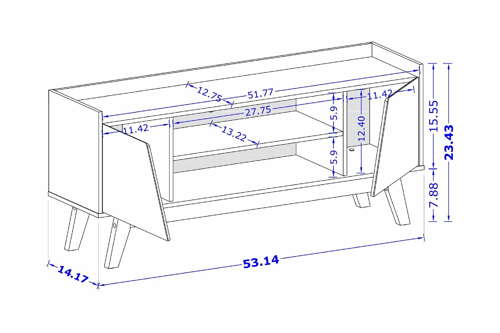- W X H X D : 53.14 in. Length, 23.42 in. Height, 14.17 in. Depth.