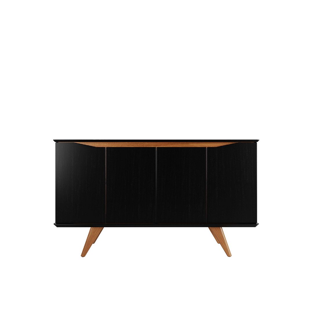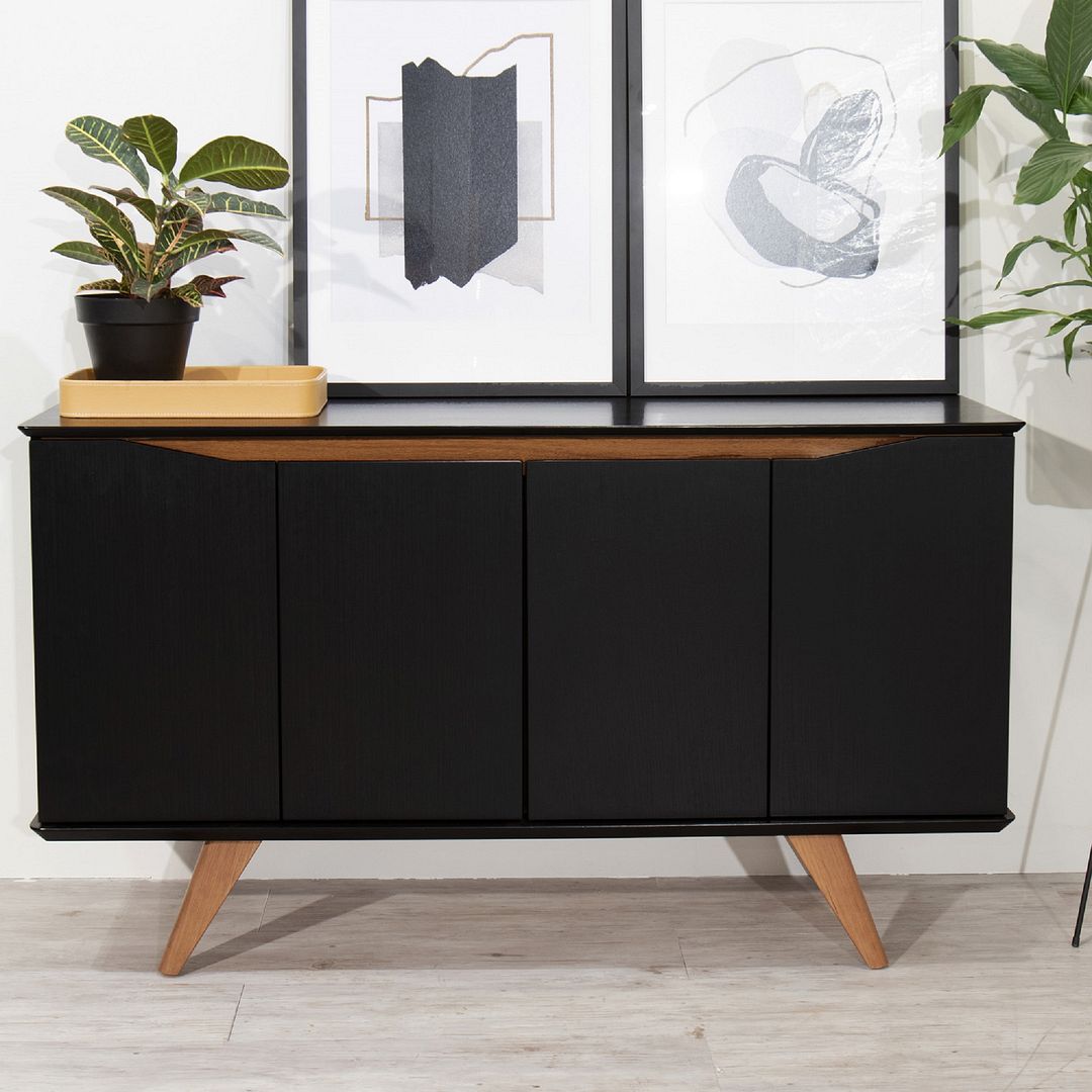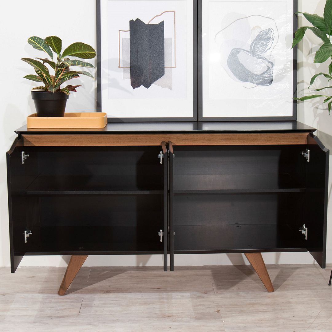 Add storage space to your dining area with the Tudor sideboard that celebrates Mid-Century design an style in all the right ways. Functional and beautifully designed, it doesn't compromise your space in style or practicality. Splayed legs add quirky classic feels, while curved cabinet conceal four large shelving area with ample space for tucking away dishes, tablecloths, and all your dinner party essentials. Complete your home with this focal point that blends and elevates any space with streamlined minimal design and maximum functionality to beautifully pair with any existing decor.- Mid-Century Modern Buffet Stand and Sideboard for Dining and Living Room Use.