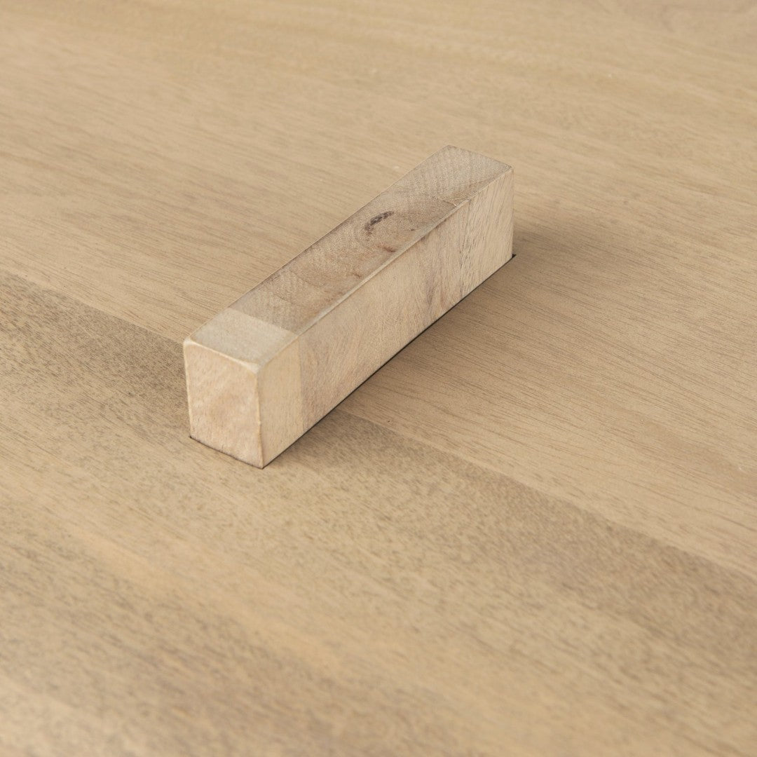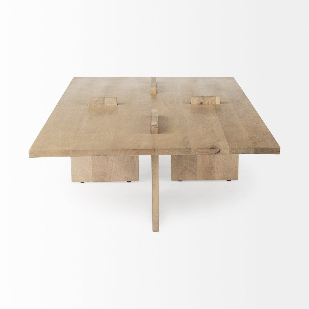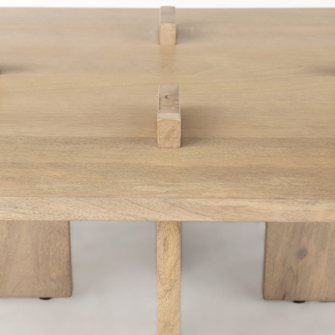 Aida brings warm, natural character and contemporary simplicity to your living room. Crafted from solid Indian mango wood with a light brown, sanded finish, this rectangular coffee table pairs clean lines with an eye-catching leg detail — four wide legs that protrude through the tabletop — for a minimalist yet distinctive look that suits relaxed modern interiors.