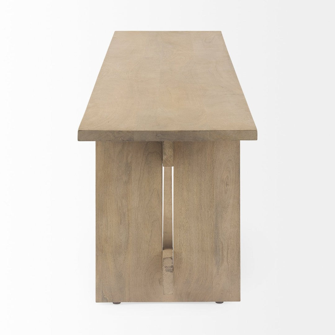 An elegant blend of minimalist and industrial design, this solid mango wood dining bench offers sturdy seating with a subtly textured, sandblasted light gray finish. Its wide plank seat and distinctive leg-and-beam construction create a refined yet rugged look that complements contemporary, relaxed dining and living spaces.