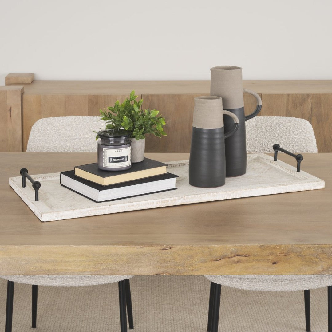 Elevate your tabletop and décor with the Alfred wooden tray — a striking blend of rustic charm and refined craftsmanship. Finished in a subtle whitewashed tone with gentle distressing and a classic herringbone top, this rectangular tray creates an instant focal point for serving or styling. Durable solid wood construction, metal handles, and a versatile aesthetic make it ideal for entertaining, organizing, or displaying decorative arrangements in a range of interior styles from farmhouse to mid-century modern.