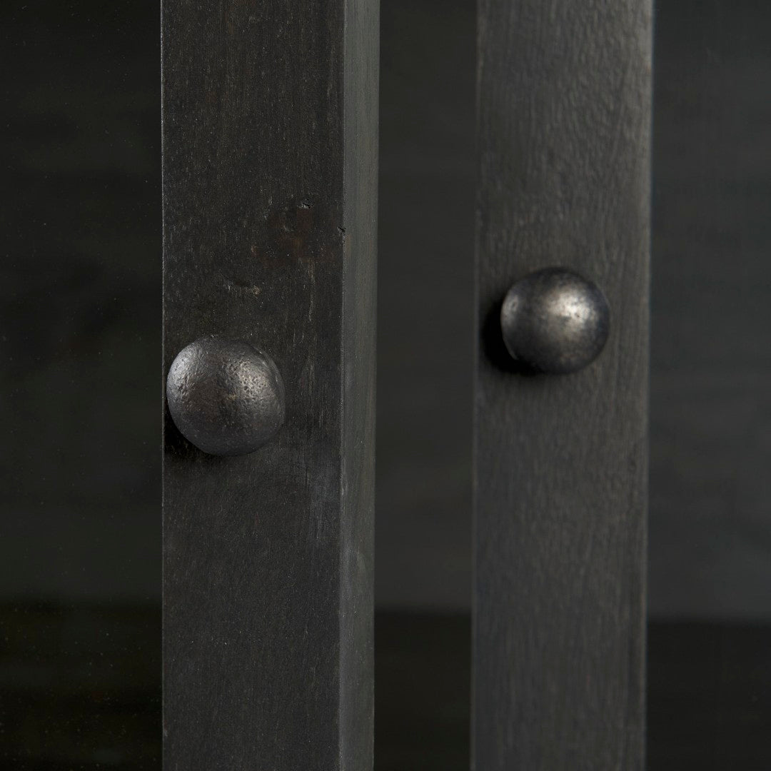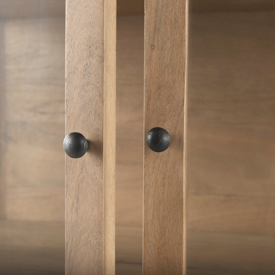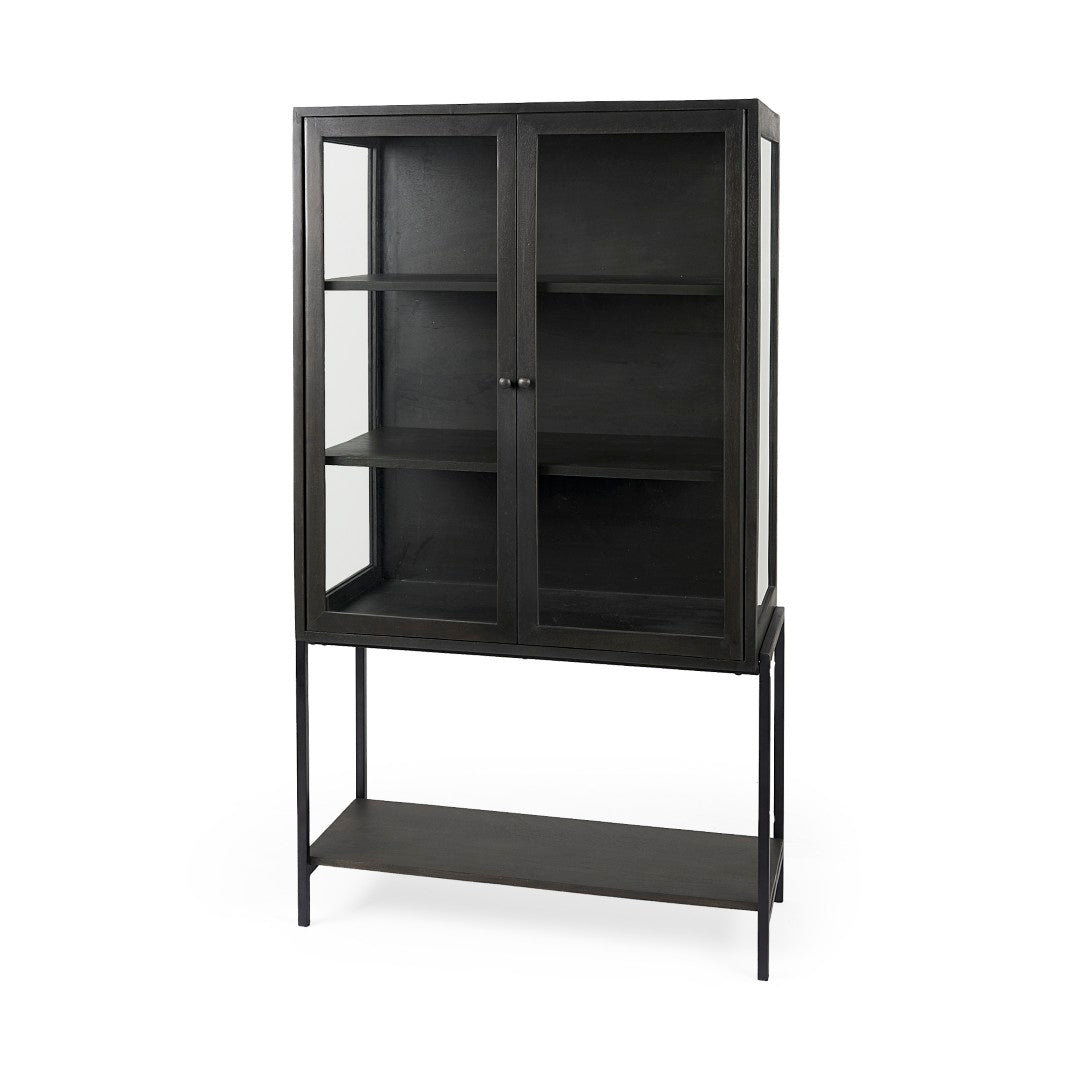 - This display cabinet is beautifully crafted from solid Mango wood with two glass doors and glass side panels. It rests atop a sturdy iron frame that reduces its visual bulk and enhances its airy aesthetic.