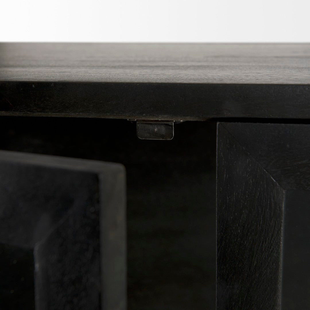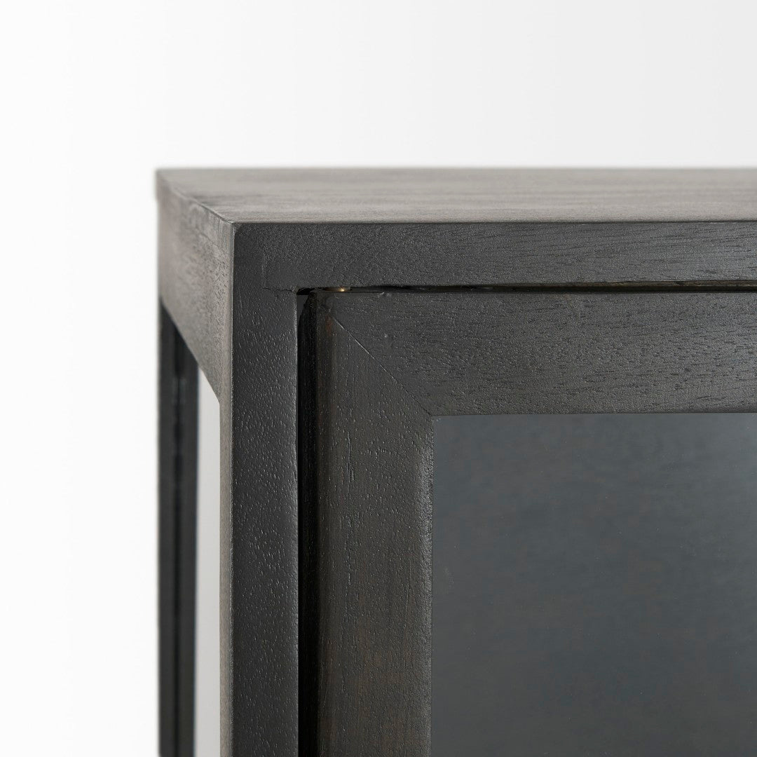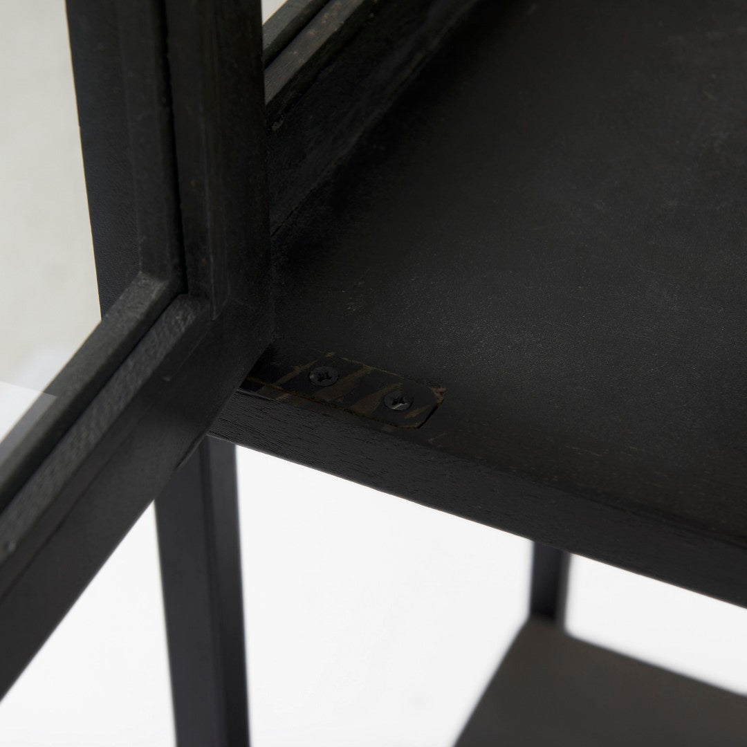 - This display cabinet is beautifully crafted from solid Mango wood with two glass doors and glass side panels. It rests atop a sturdy iron frame that reduces its visual bulk and enhances its airy aesthetic.