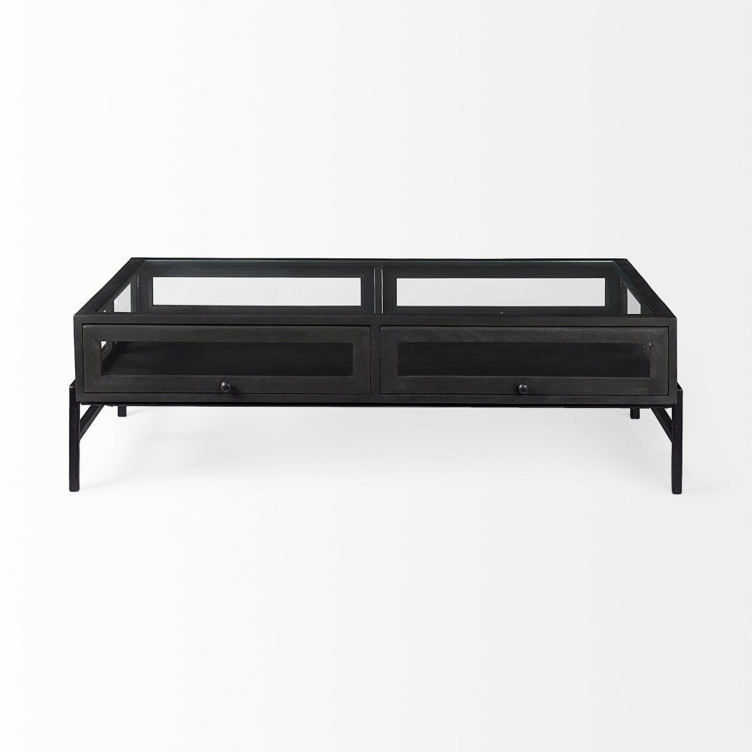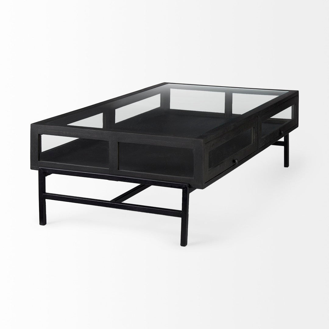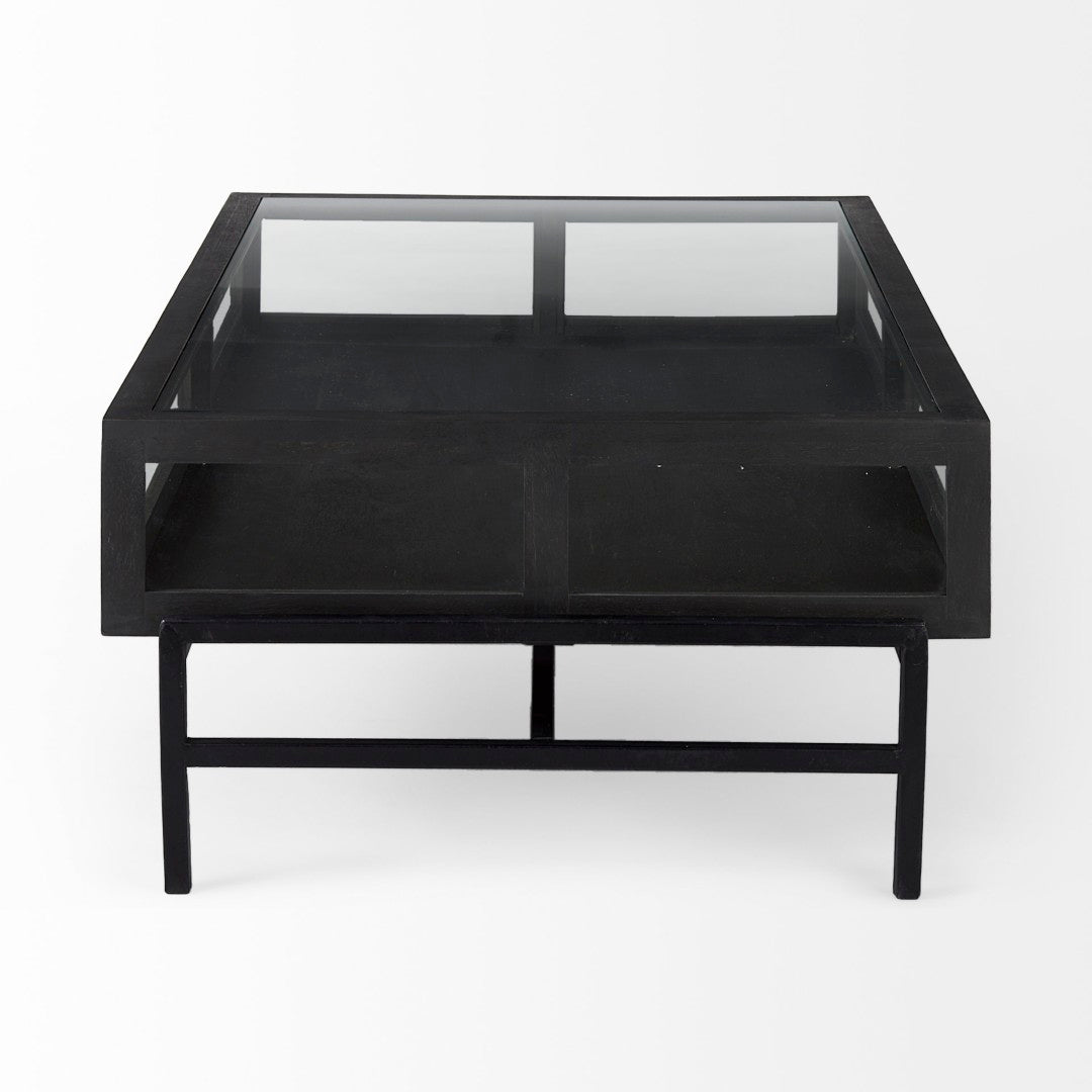 Bring style and function to your living space with this transitional rectangular coffee table that doubles as a display case. Crafted from solid mango wood, tempered glass, and a black iron base, it offers sturdy construction, visible storage, and a sleek silhouette that suits modern and classic interiors alike.