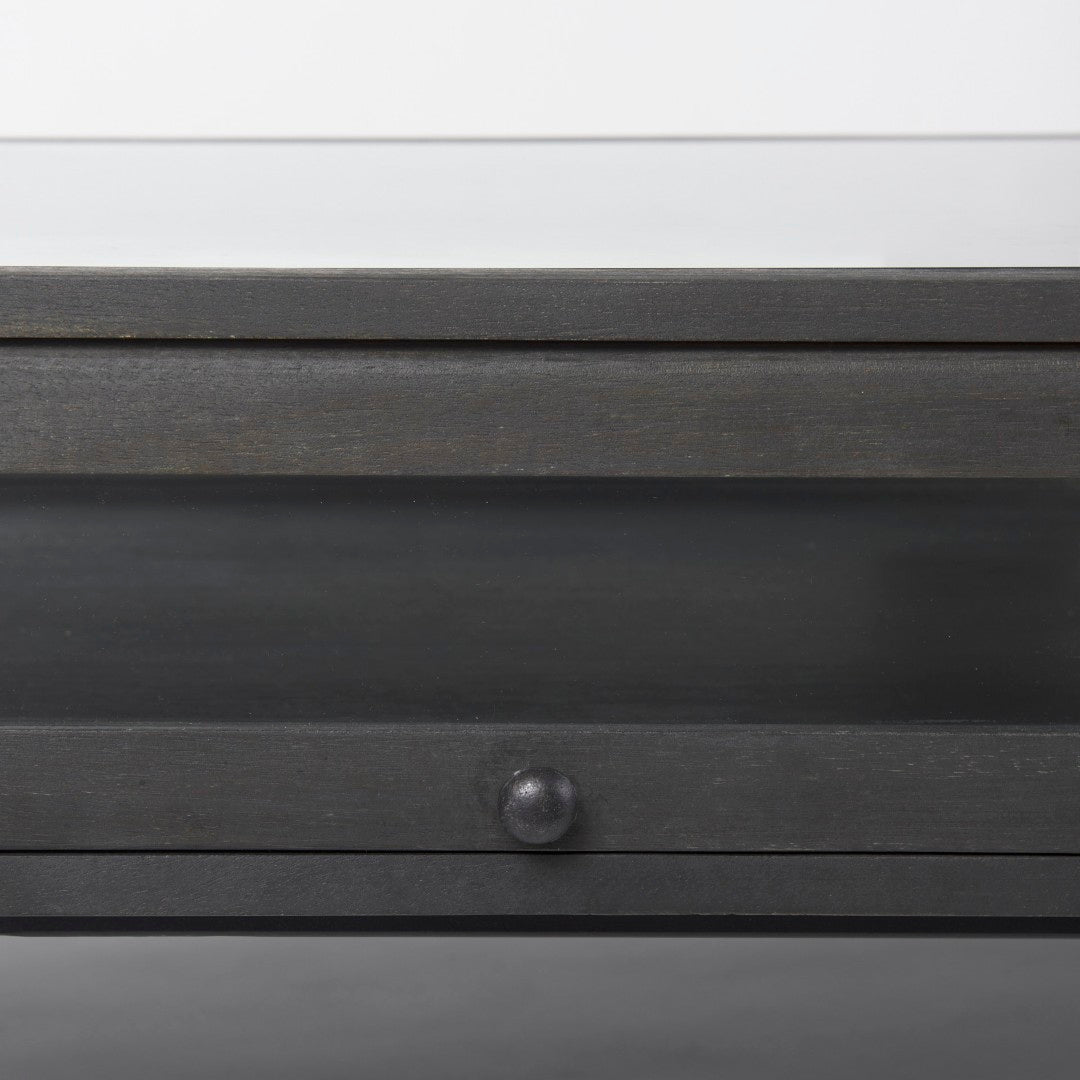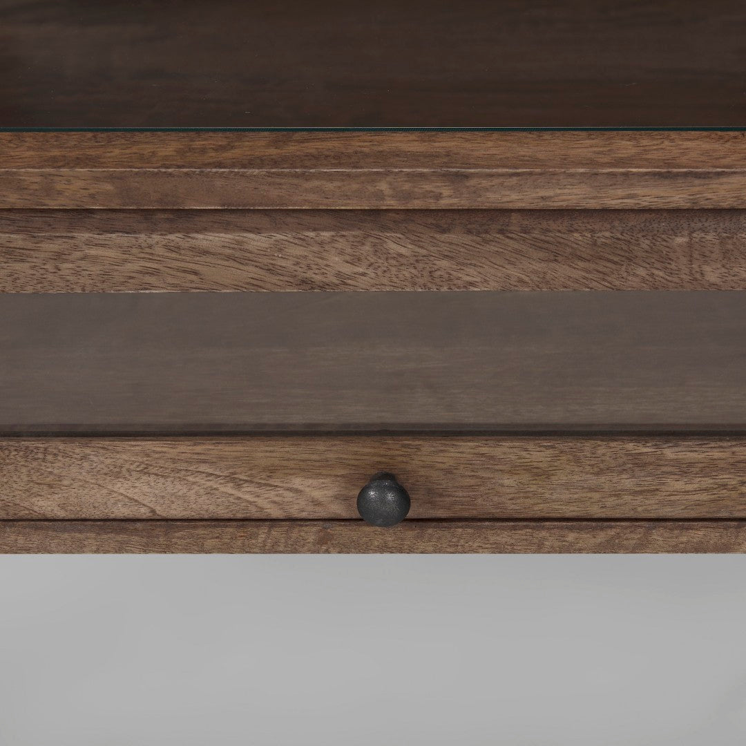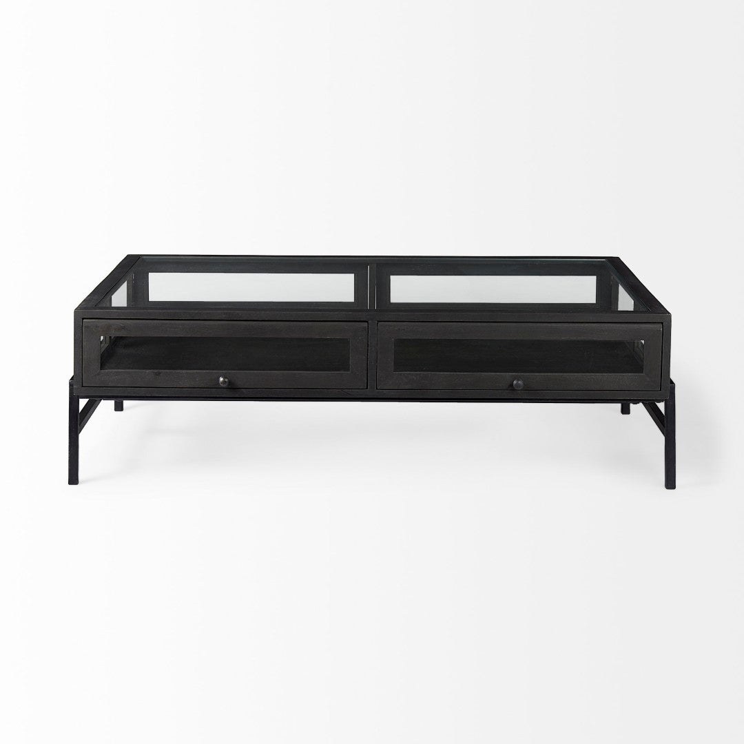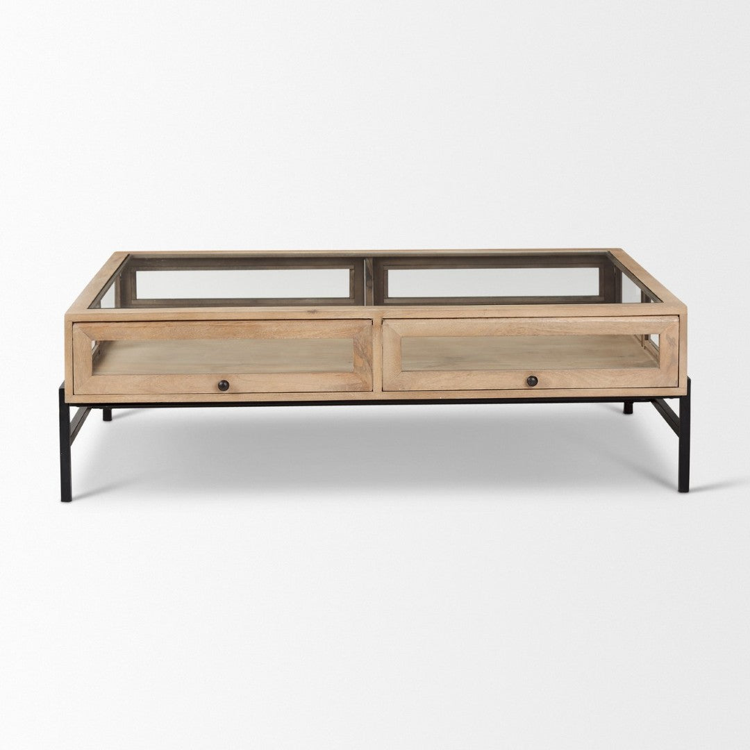 Bring style and function to your living space with this transitional rectangular coffee table that doubles as a display case. Crafted from solid mango wood, tempered glass, and a black iron base, it offers sturdy construction, visible storage, and a sleek silhouette that suits modern and classic interiors alike.