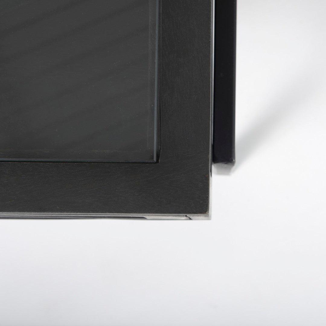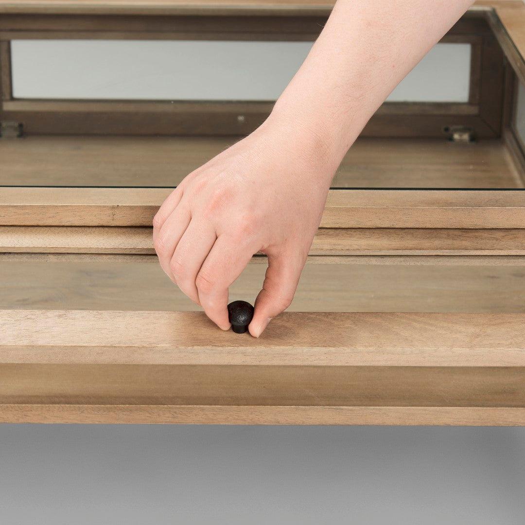 - Top & Doors: Tempered glass tabletop and four tempered glass doors set into the wooden shadowbox frame for safe display and easy visibility of contents