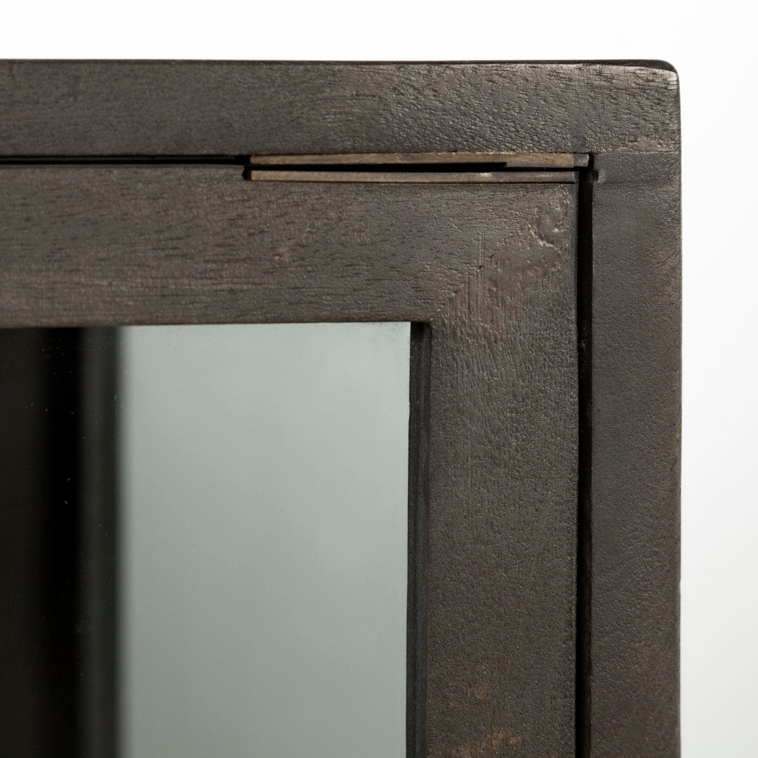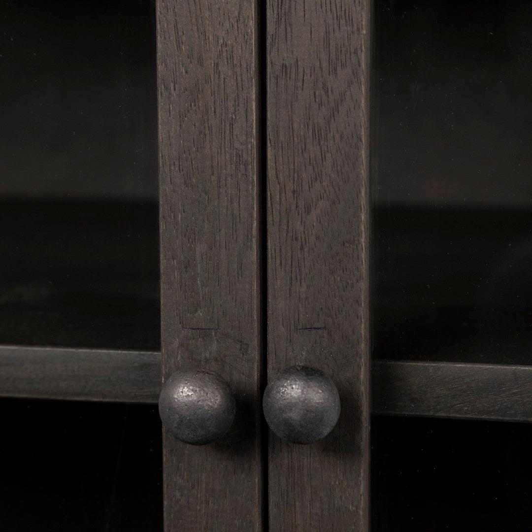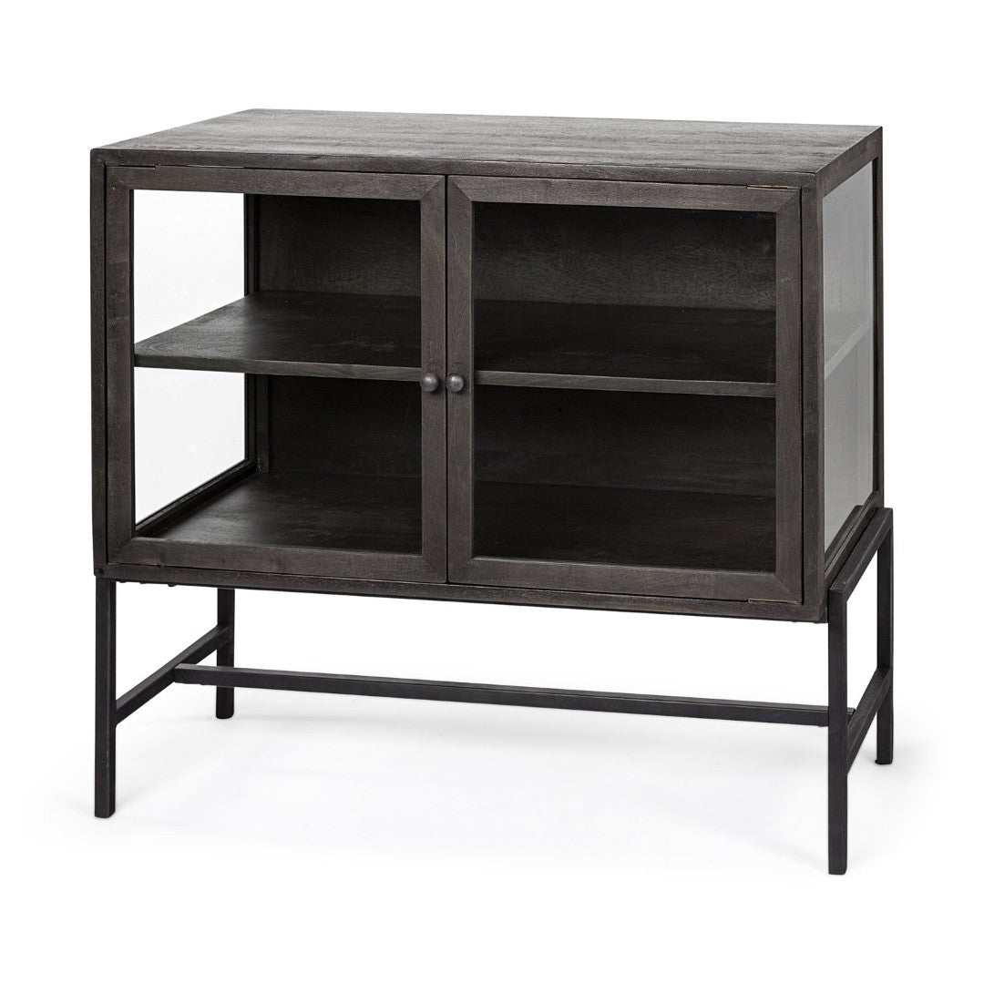 - The Arelius accent cabinet is beautifully crafted from solid Mango wood with two glass doors and glass side panels. It rests atop a sleek metal frame that reduces its visual bulk and enhances its airy aesthetic.