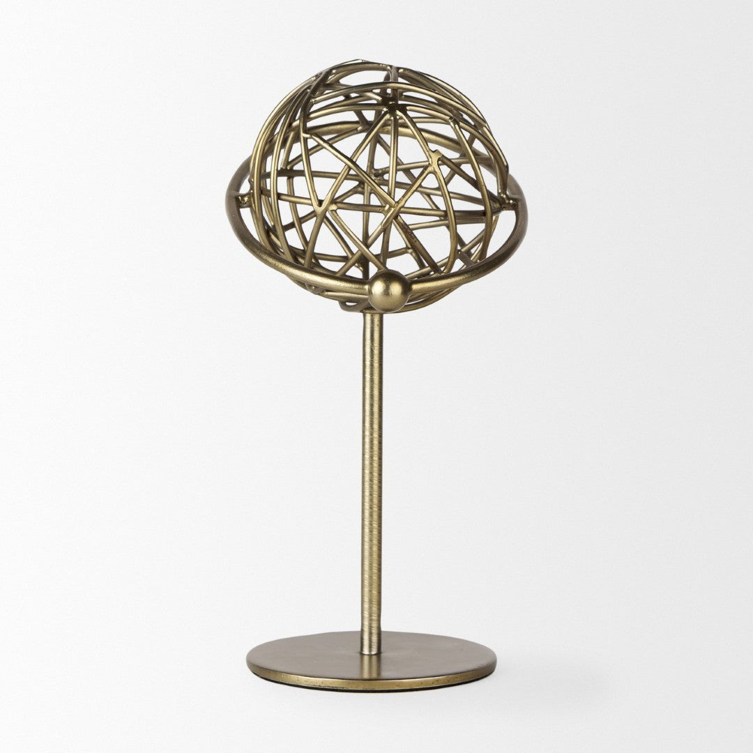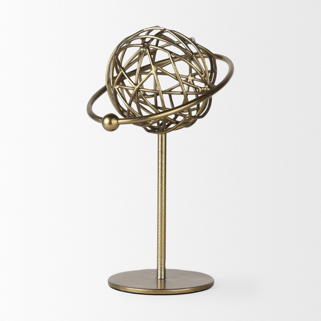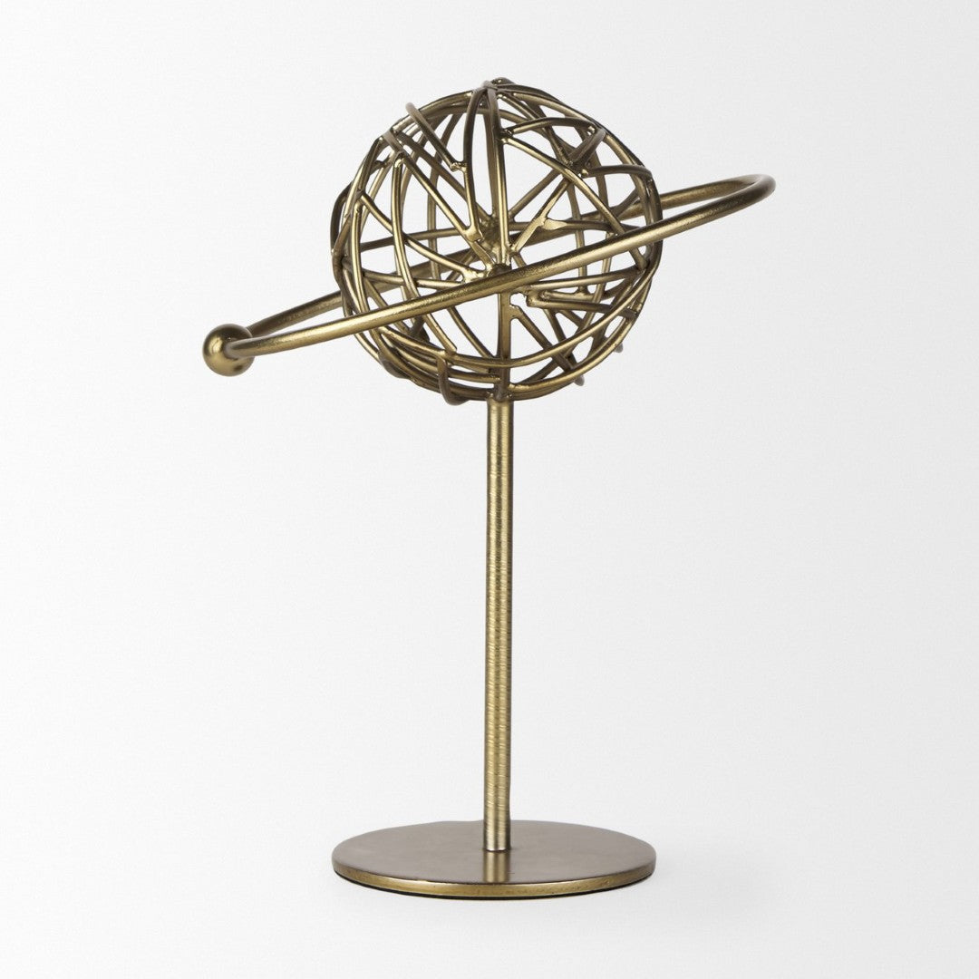 Bring a touch of celestial elegance to your home or office with this sculptural metal ornament. Finished in warm gold, the piece interprets a ringed planet with clean, modern lines—perfect for contemporary, mid-century, or eclectic interiors. Its sturdy iron construction and refined plating make it a lasting accent on shelves, consoles, or desks.